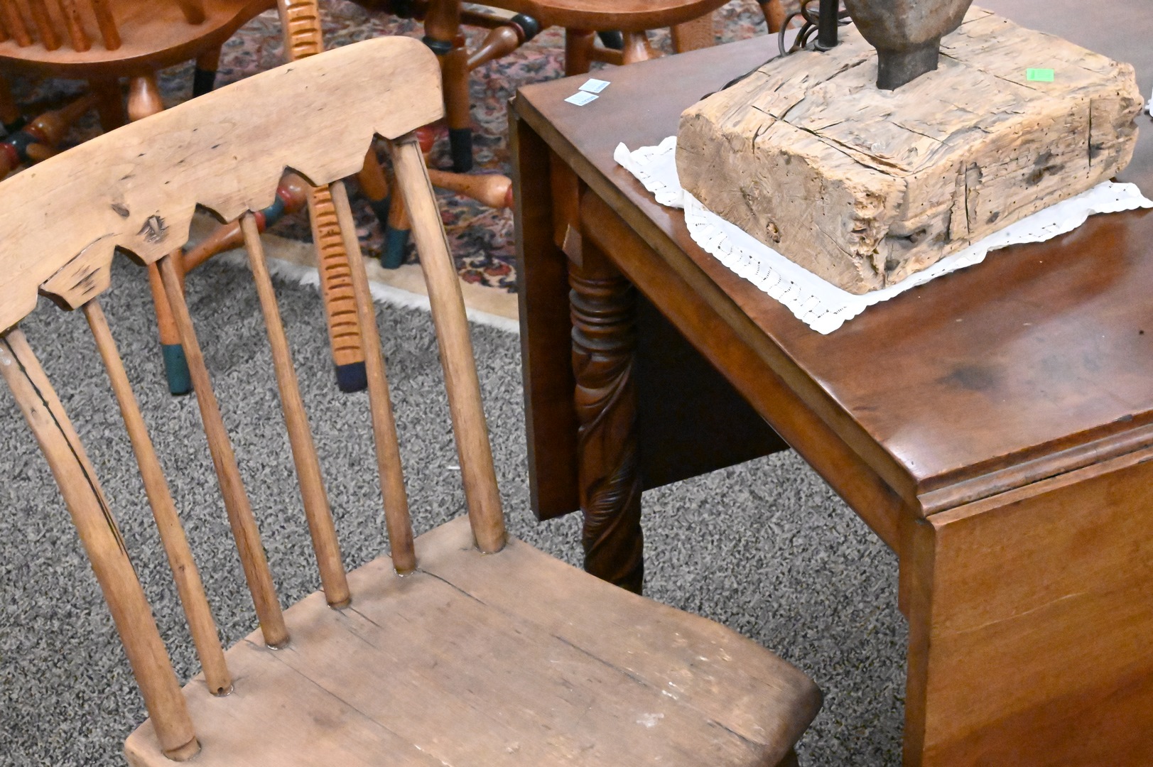 Sheraton Mahogany Drop Leaf Table, having Acanthus carved legs and one drawer, along with a side chair, circa 1830, height 28 1/2 inches, closed top 23″ x 39″. Provenance: Edwin C. Alberg, New Haven, Conn., 1938; sold to Olive Louise Dann (1880–1961), New Haven, Conn., probably November 19, 1938; by bequest to Yale University Art Gallery, New Haven, Conn., 1961