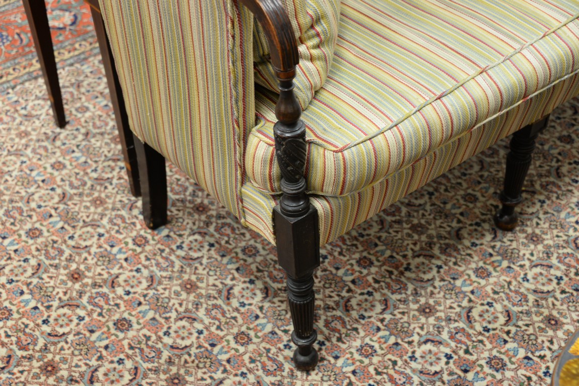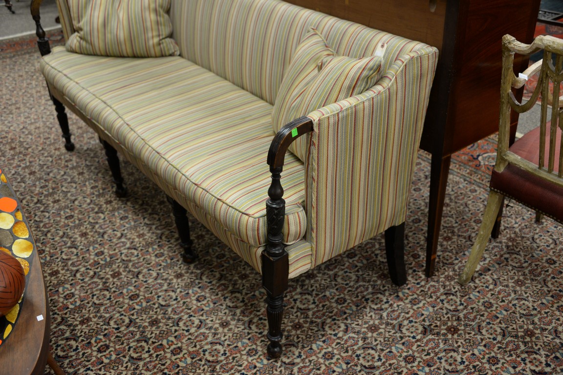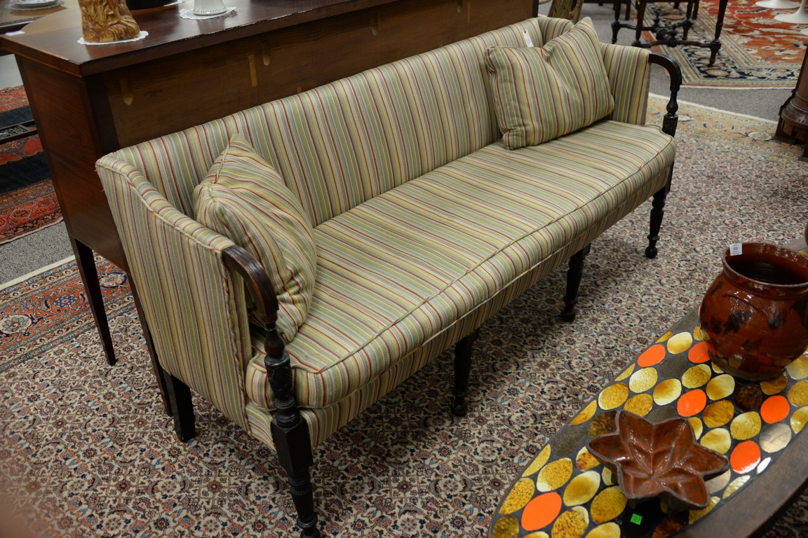 Lot 192: Sheraton upholstered sofa having exposed wood hand rests on carved fluted and turned supports and legs ending in ball feet, probably…
