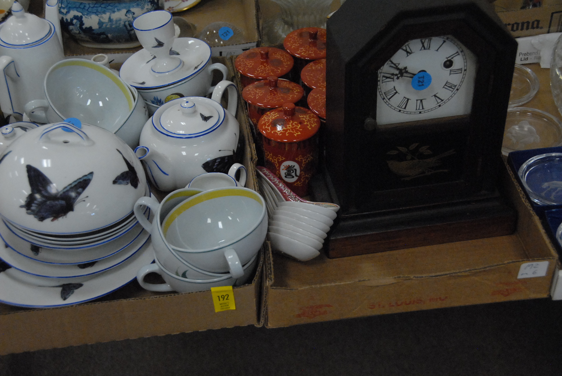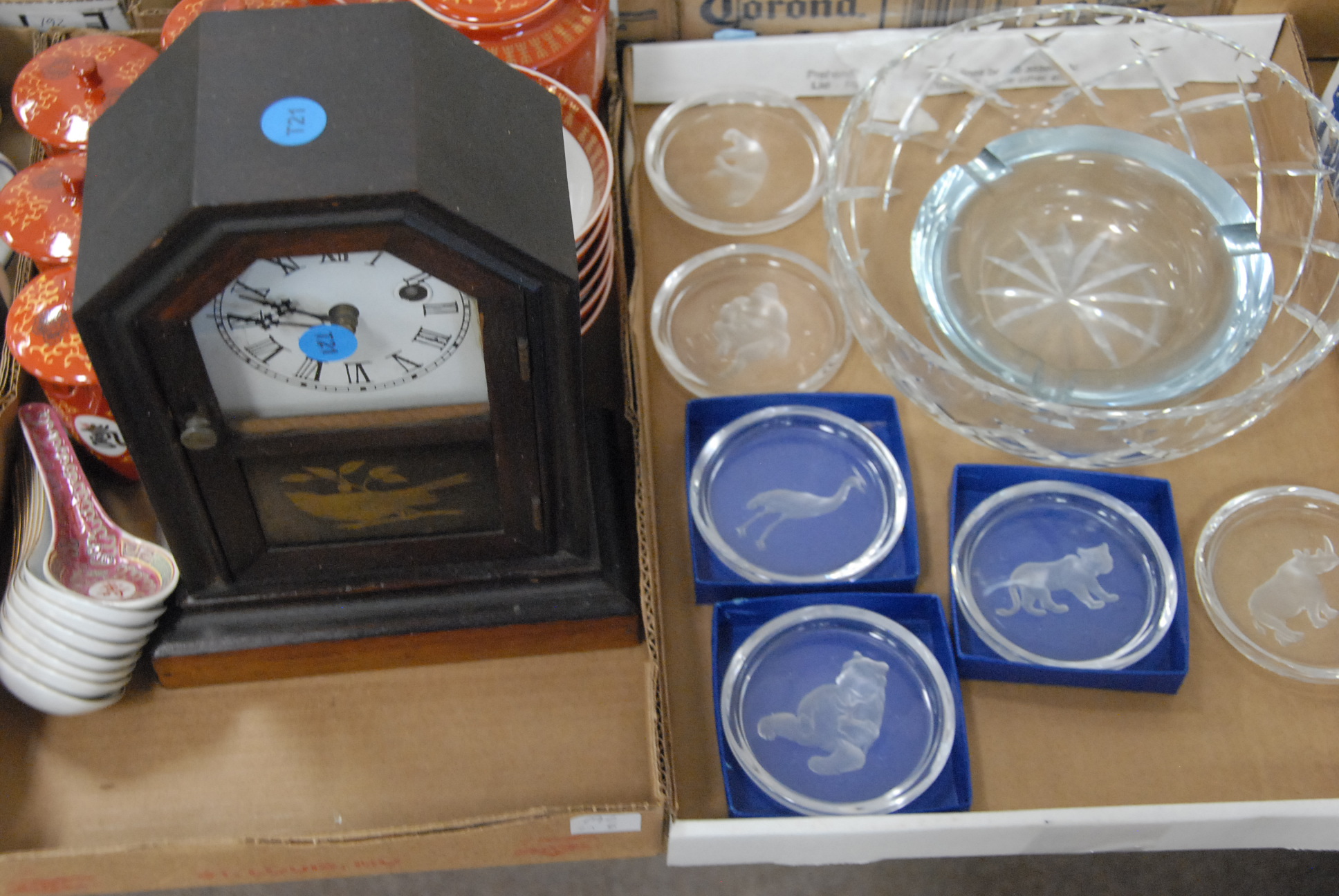 Six box lots to include a cottage clock, a set of Austrian china with birds, glassware, candlesticks, Venetian glass, Japanese bowls, crystal coasters, Staffordshire, sugar bowl, and miscellaneous.