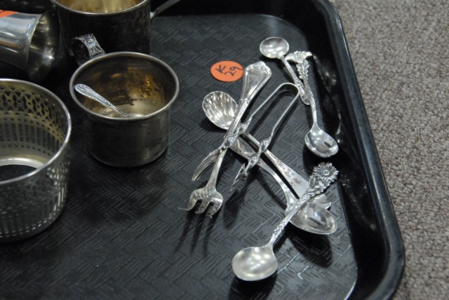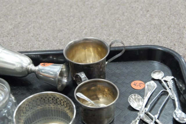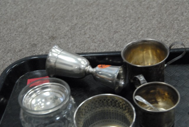 Sterling silver lot including shot glasses, cups, spoons and various other items.