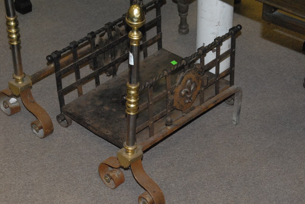 Three piece lot to include iron log holder and pair of brass and steel andirons.
