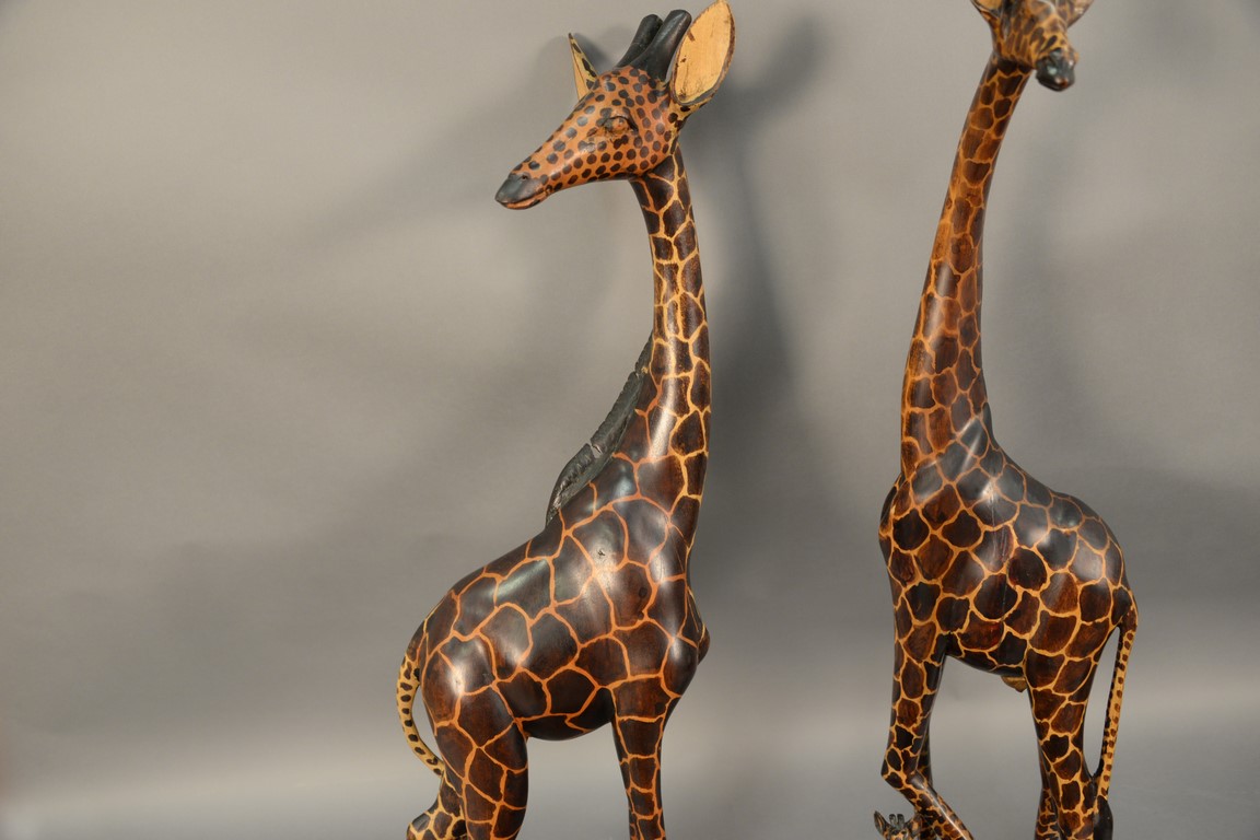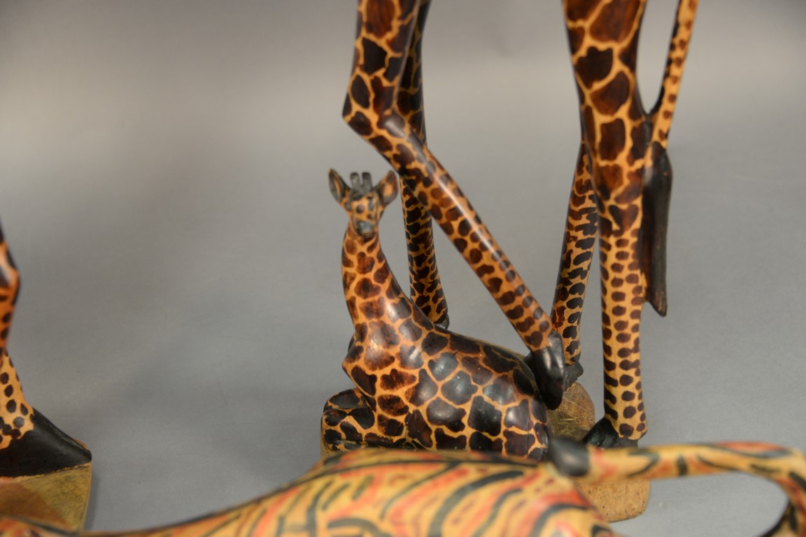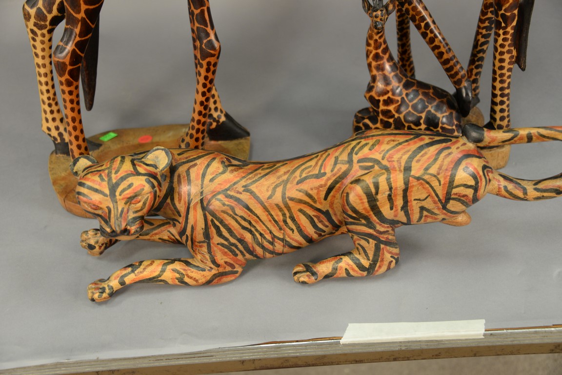 Three piece lot to include two carved giraffes and a tiger. giraffes: ht. 35in., tiger: 22 1/2in.