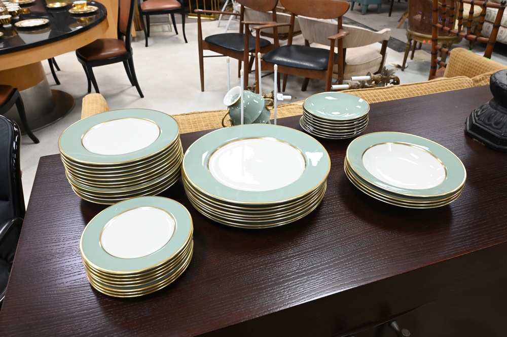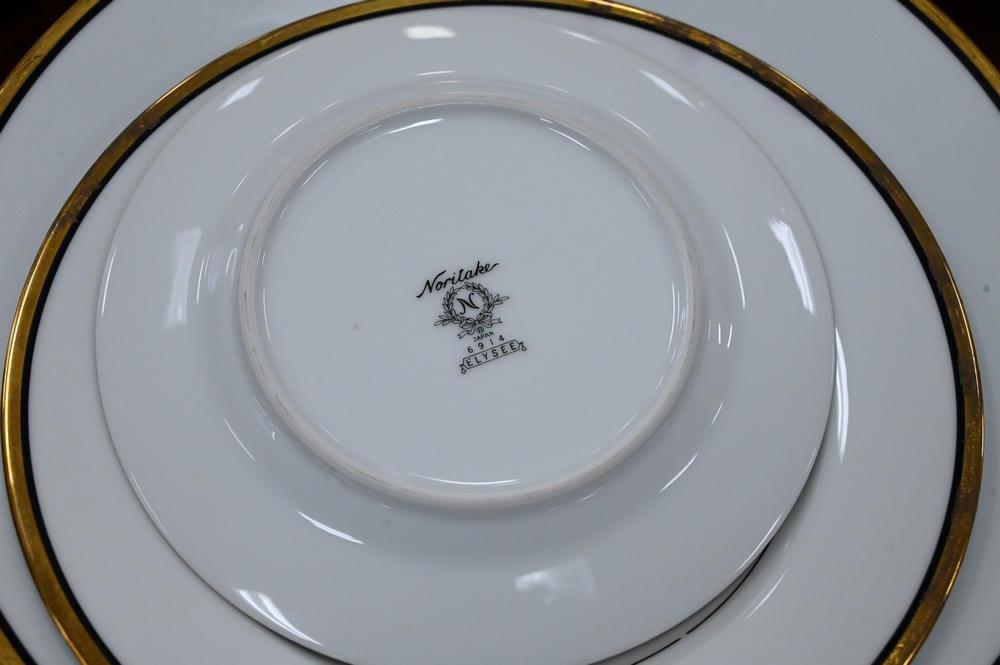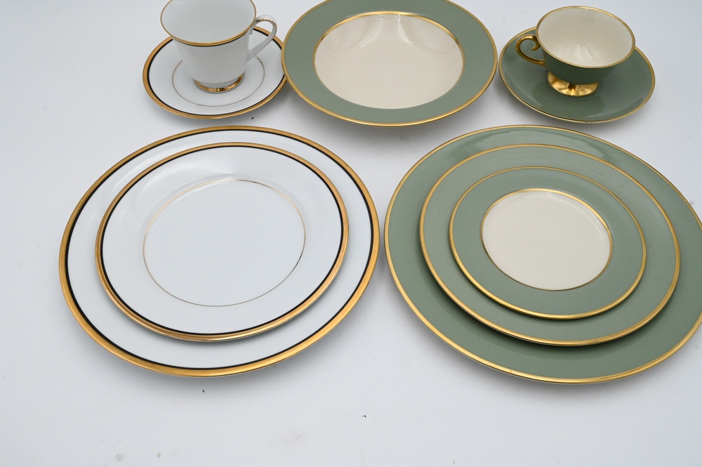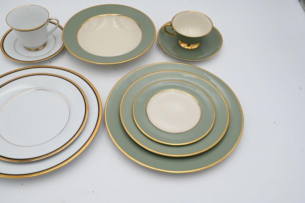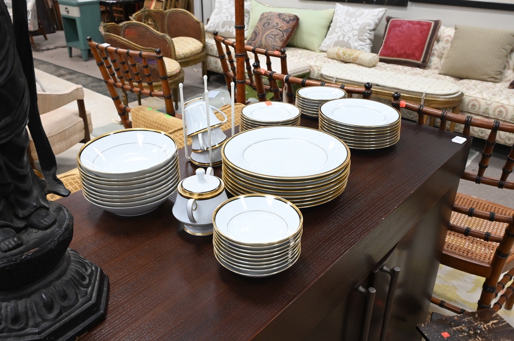 Lot 192: Two Porcelain Dinnerware Sets, Noritake Elysee, setting for 12 along with a flintridge set with green and gold.
