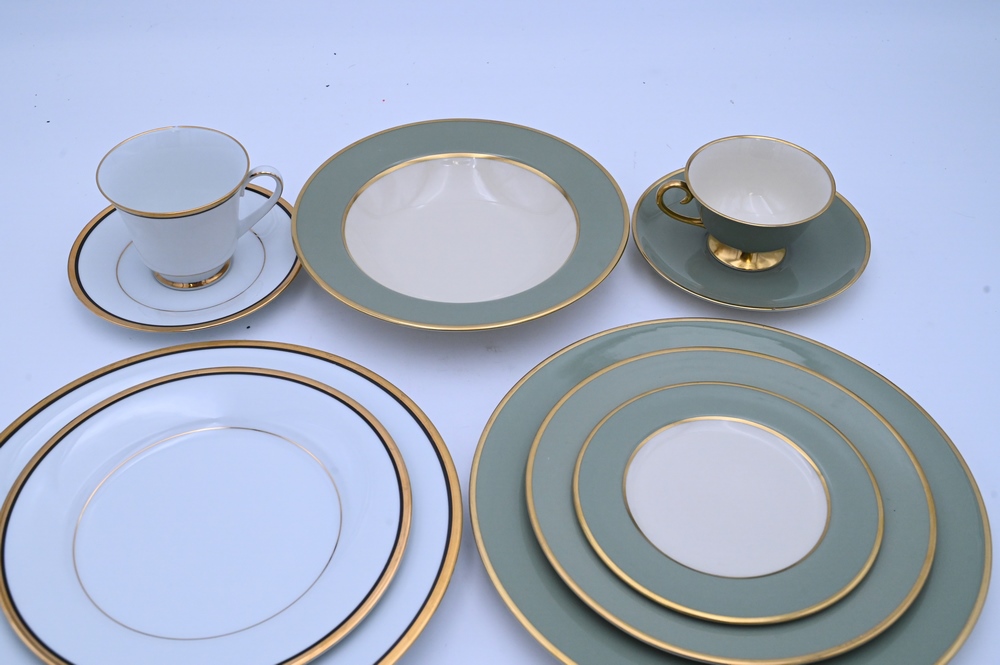 Two Porcelain Dinnerware Sets, Noritake Elysee, setting for 12 along with a flintridge set with green and gold.