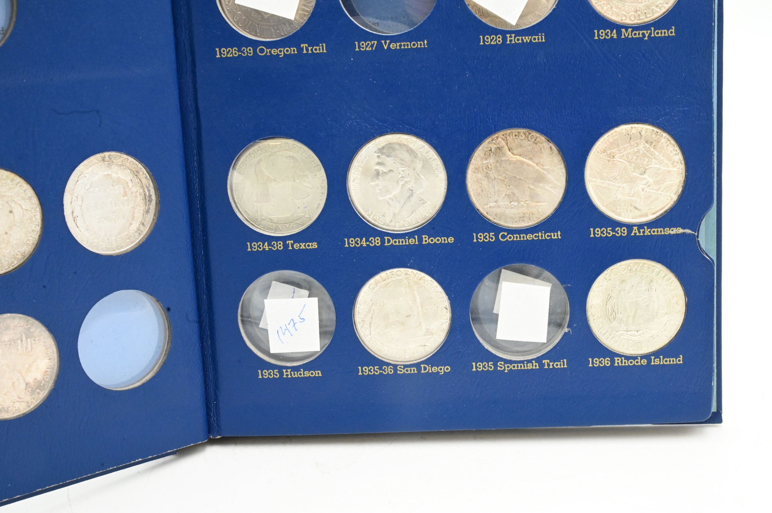 A Partial U.S. Silver Commemorative Album, with 26 coins in it XF to UNC, 1918 Illinois AU 1936 San Diego UNC, 1920 Maine AU,1936 Rhode Island UNC, 1920 pilgrim UNC, 1936 Cleveland UNC, 1921 Alabama XF , 1936 York UNC, 1923-S Monroe XF, 1936 Lynch UNC, 1925 Lexington AU, 1936 Elgin, 1925 Stone mt xf ,1936 Albany, 1925-S California UNC, 1936 Columbia SC UNC, 1926 Sesqui UNC, 1936 Robinson UNC, 1934 Maryland UNC, 1935-D boone UNC, 1946 Iowa UNC, Connecticut UNC, 1946 BT Washington UNC, 1936-s Arkansas UNC, 1951 Wash Carver UNC, George Washington modern