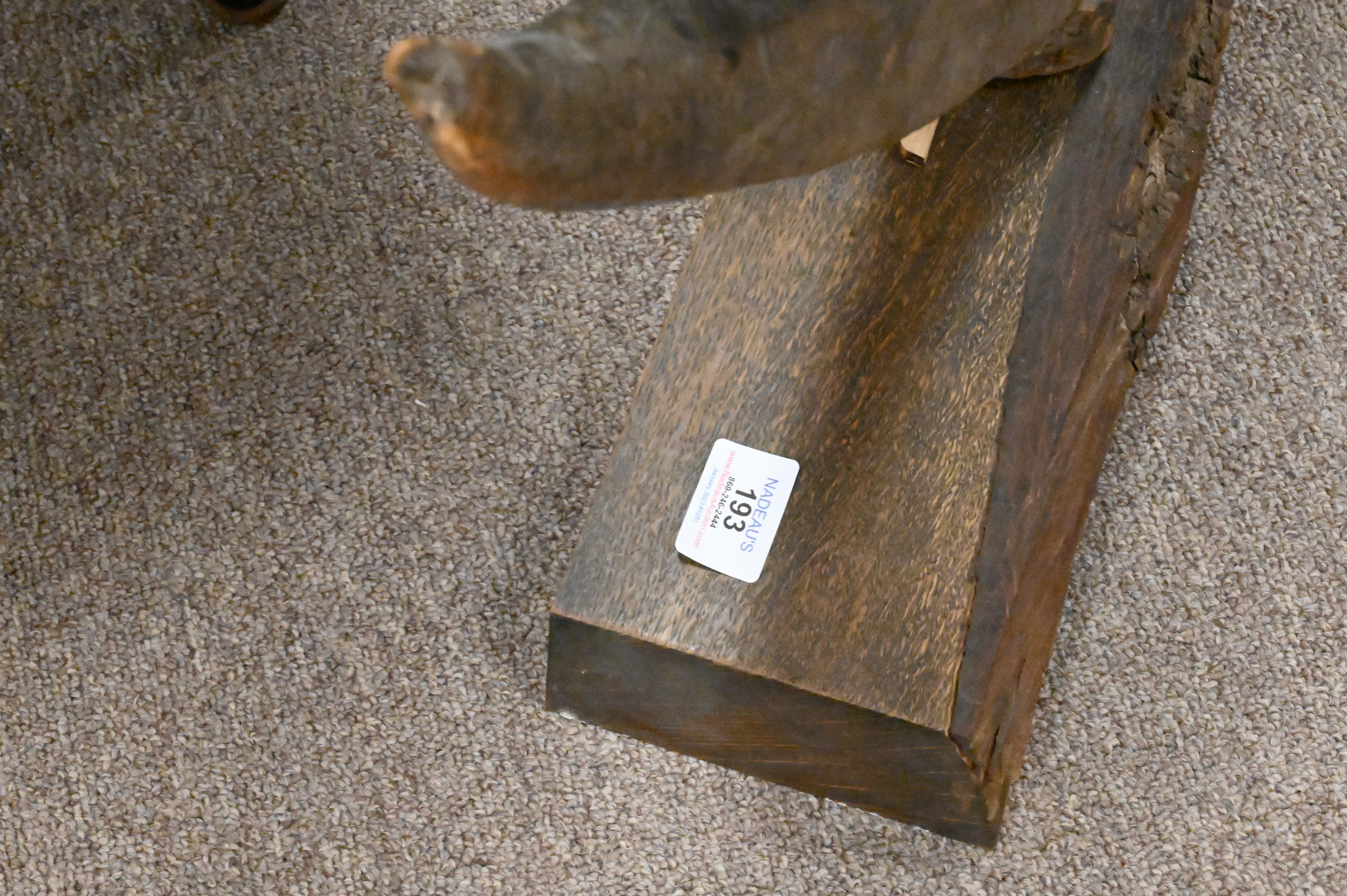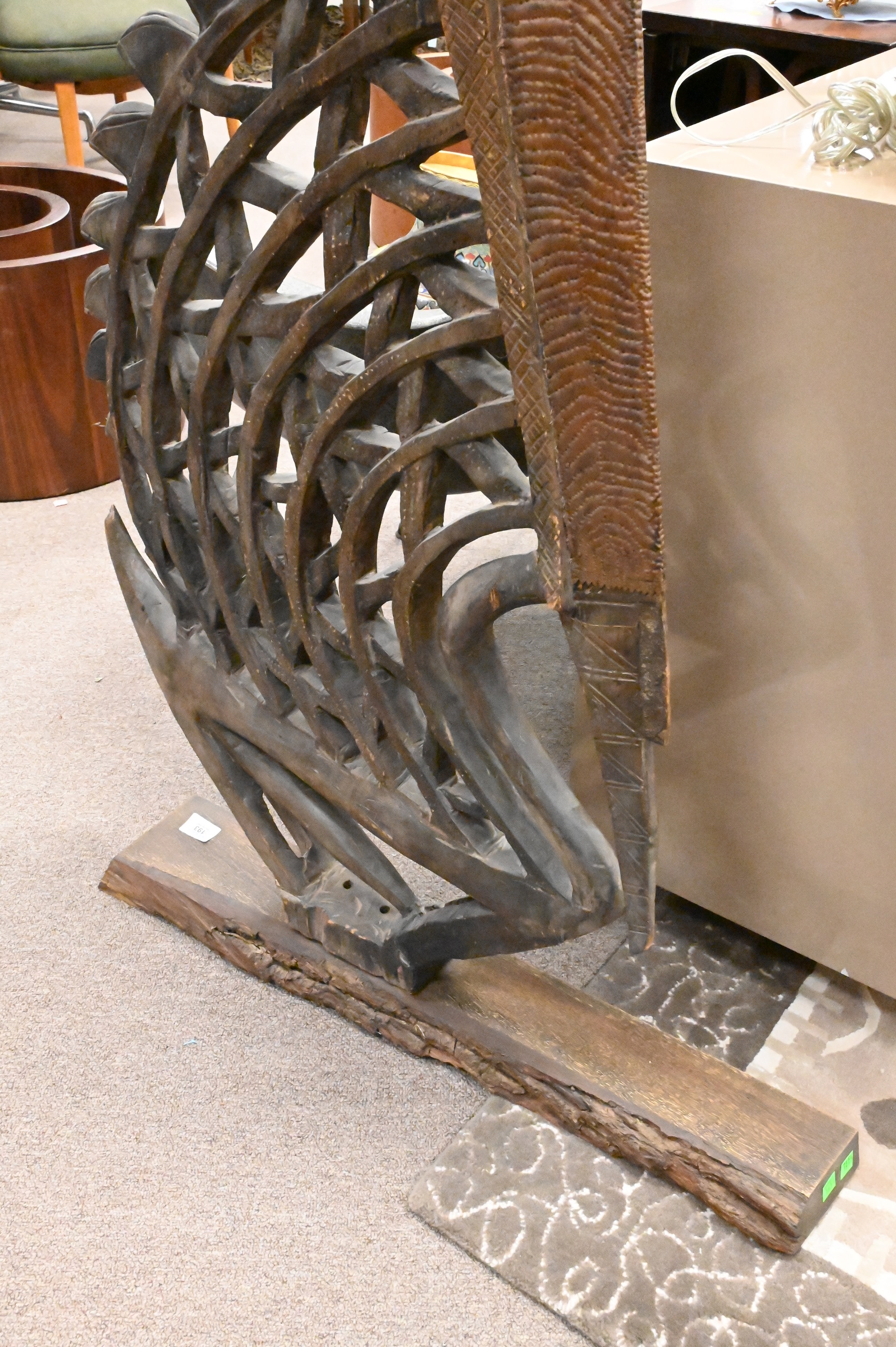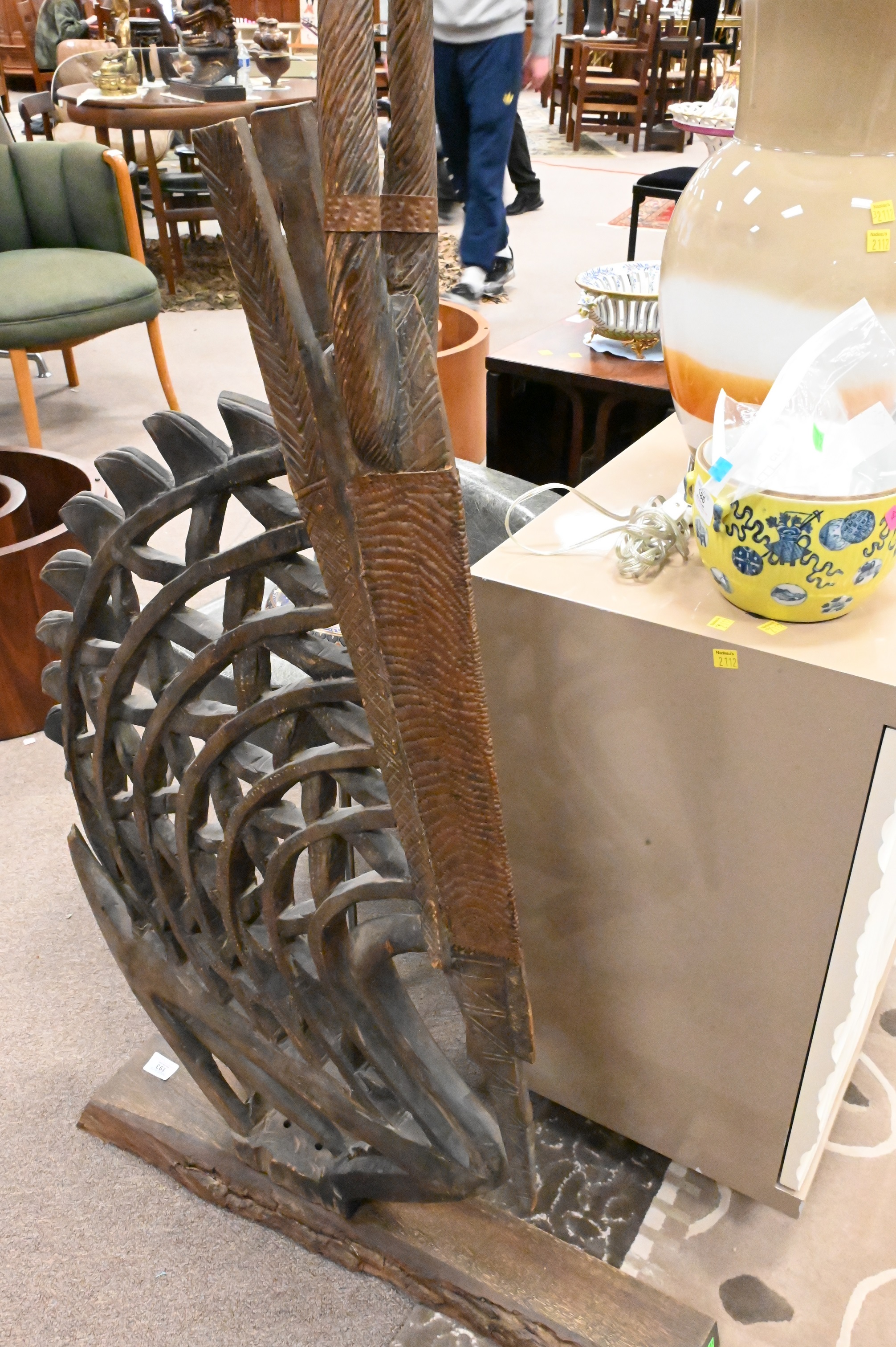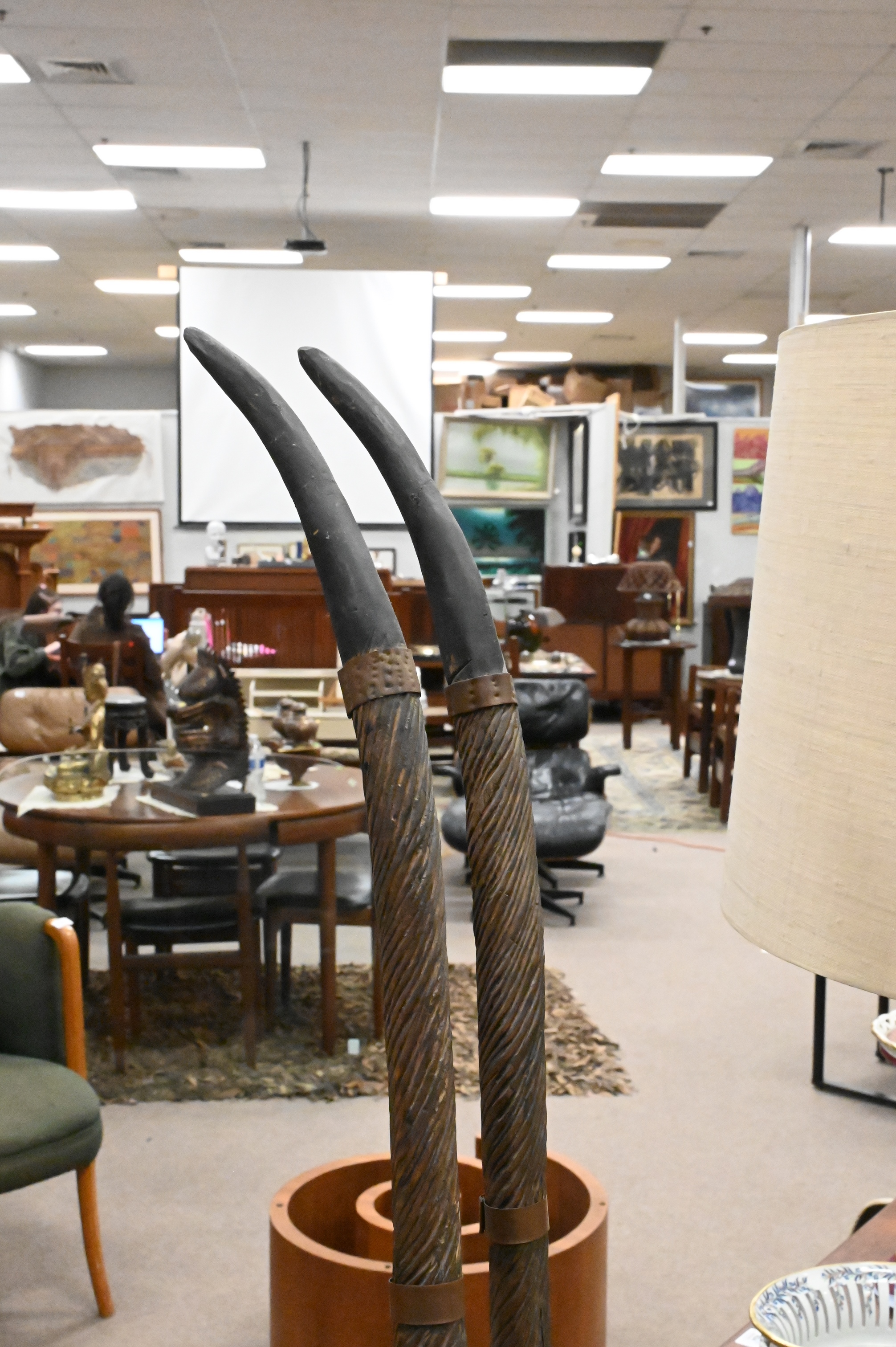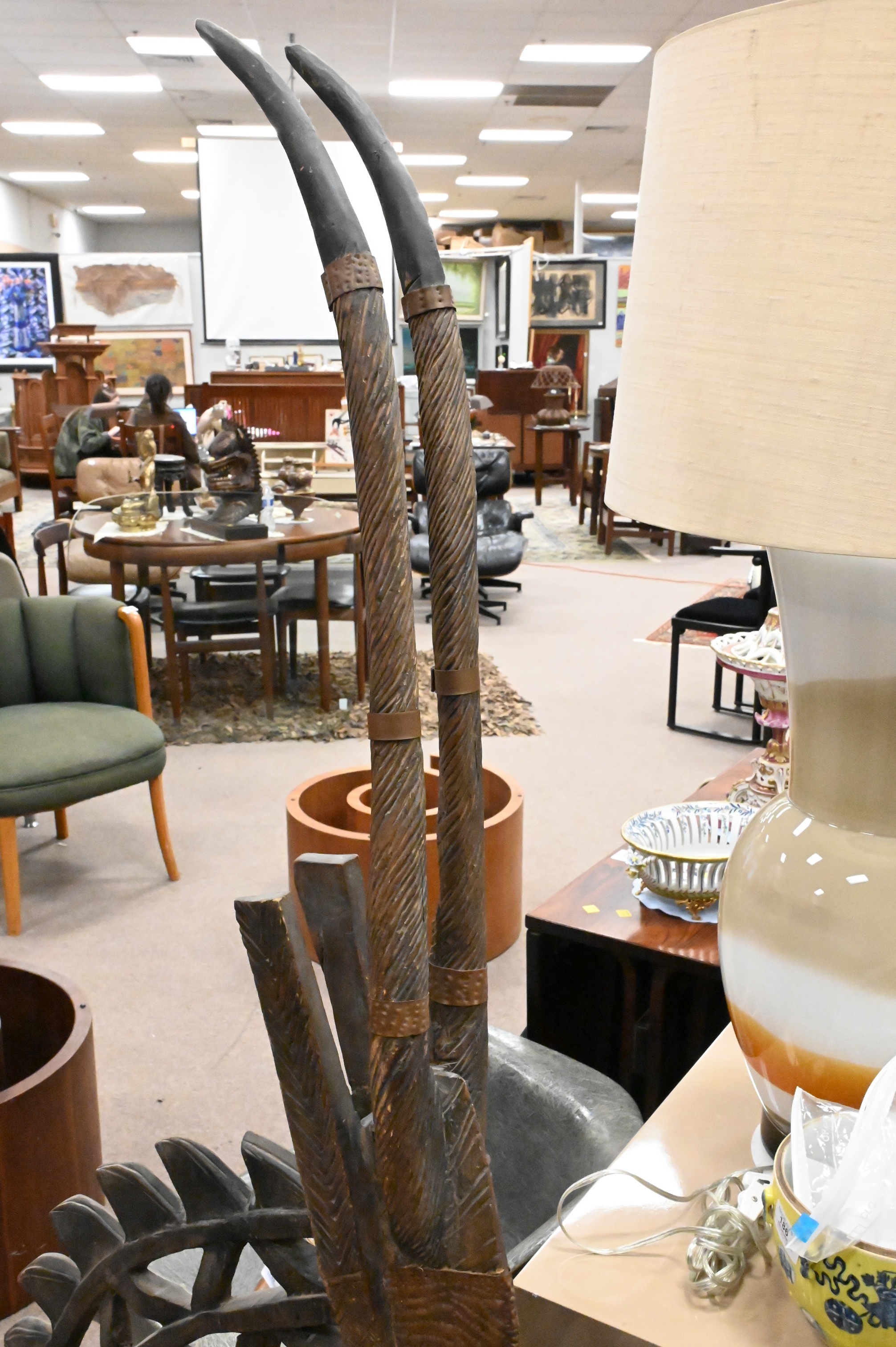 heavy cylindrical neck in seven sections, large horizontal head with a stippled copper plate on the forehead and three copper bands on the gently backward curvy spiral fluted horns