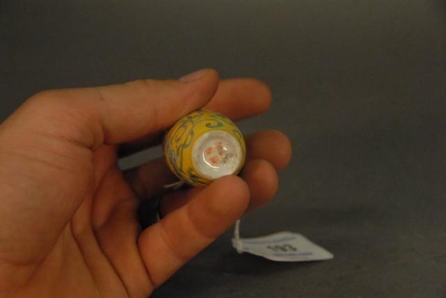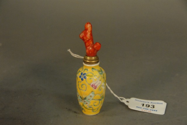 Familie Rose porcelain snuff bottle having yellow ground with scrolling vines, blossoming flowers and butterflies with coral finial top, 18th century