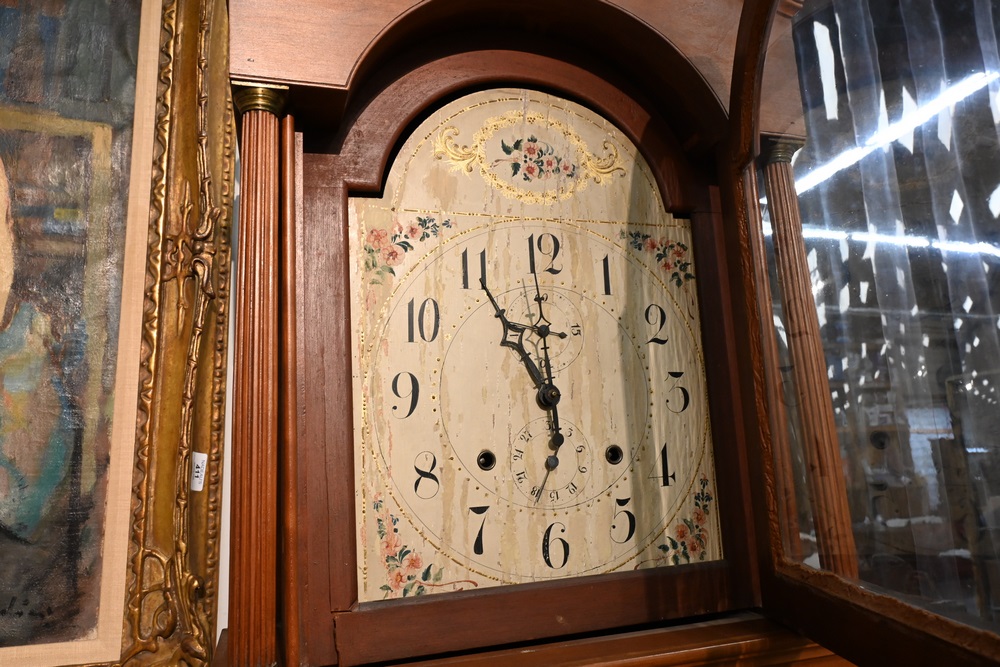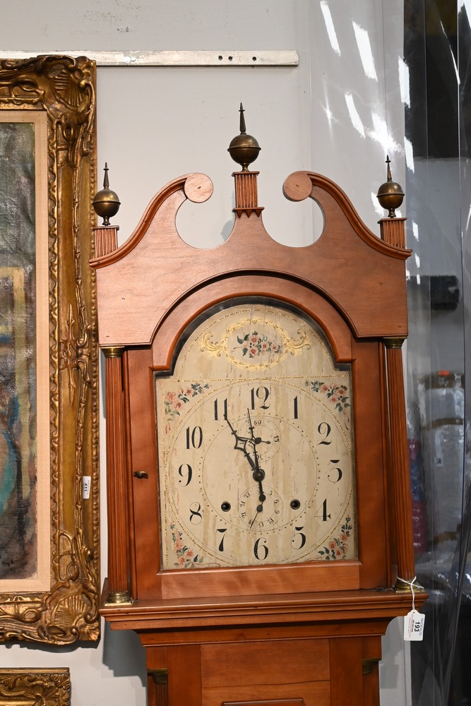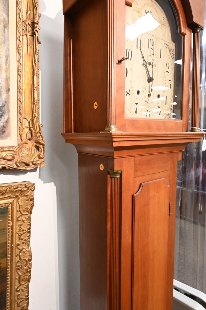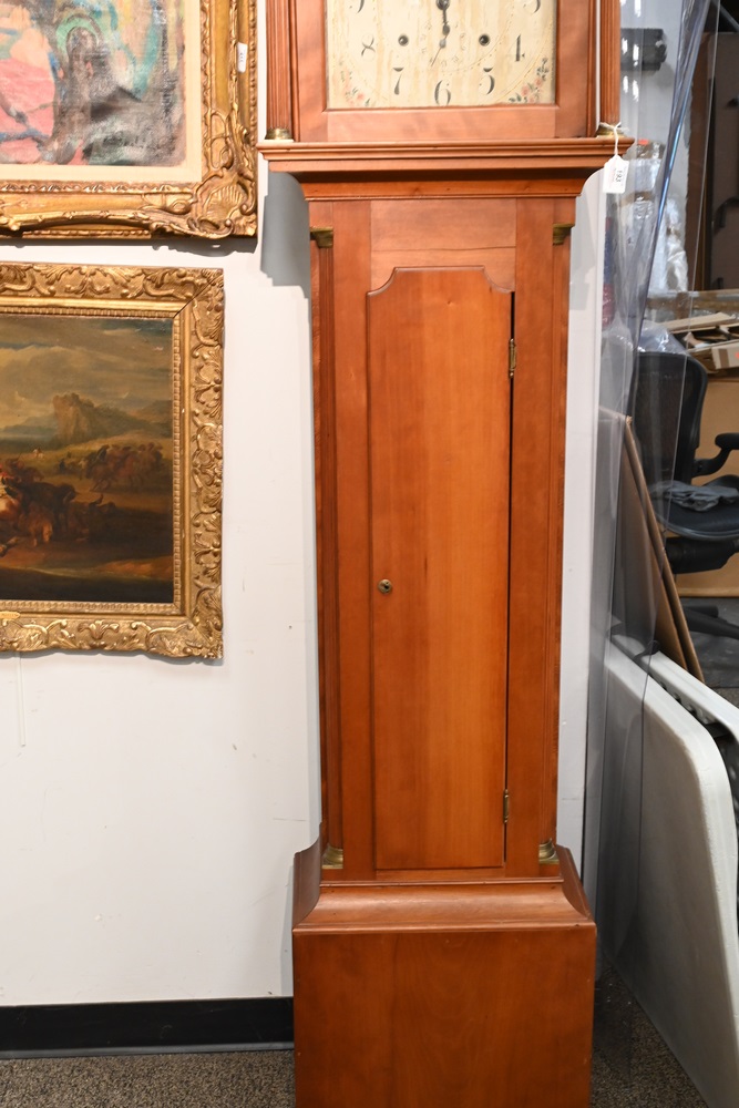 Lot 193: Federal Cherry Tall Clock with Tombstone Dial having painted wooden dial and wood works case having fluted columns height 90 inches Provenance: Fifty Year Personal Collection of Clocks and American Antiques from Thomas Bailey, Manchester, Connecticut.