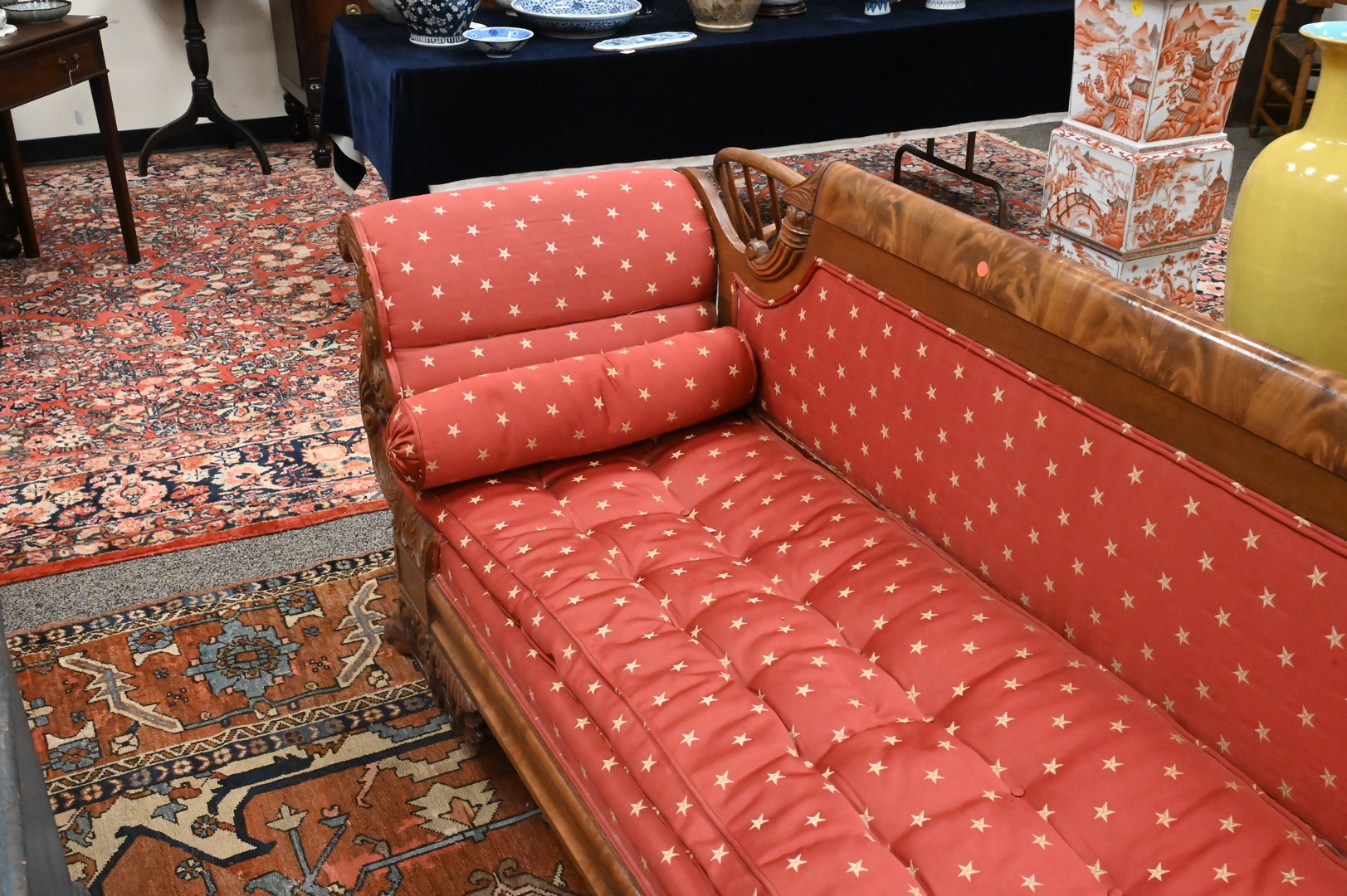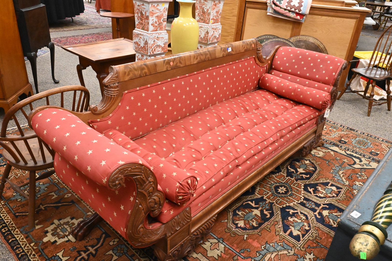 Federal Mahogany Sofa, having cornucopia carving, along with large paw feet, height 35 inches, length 92 inches. Provenance: Estate of Peter Tillou, Litchfield, Connecticut.