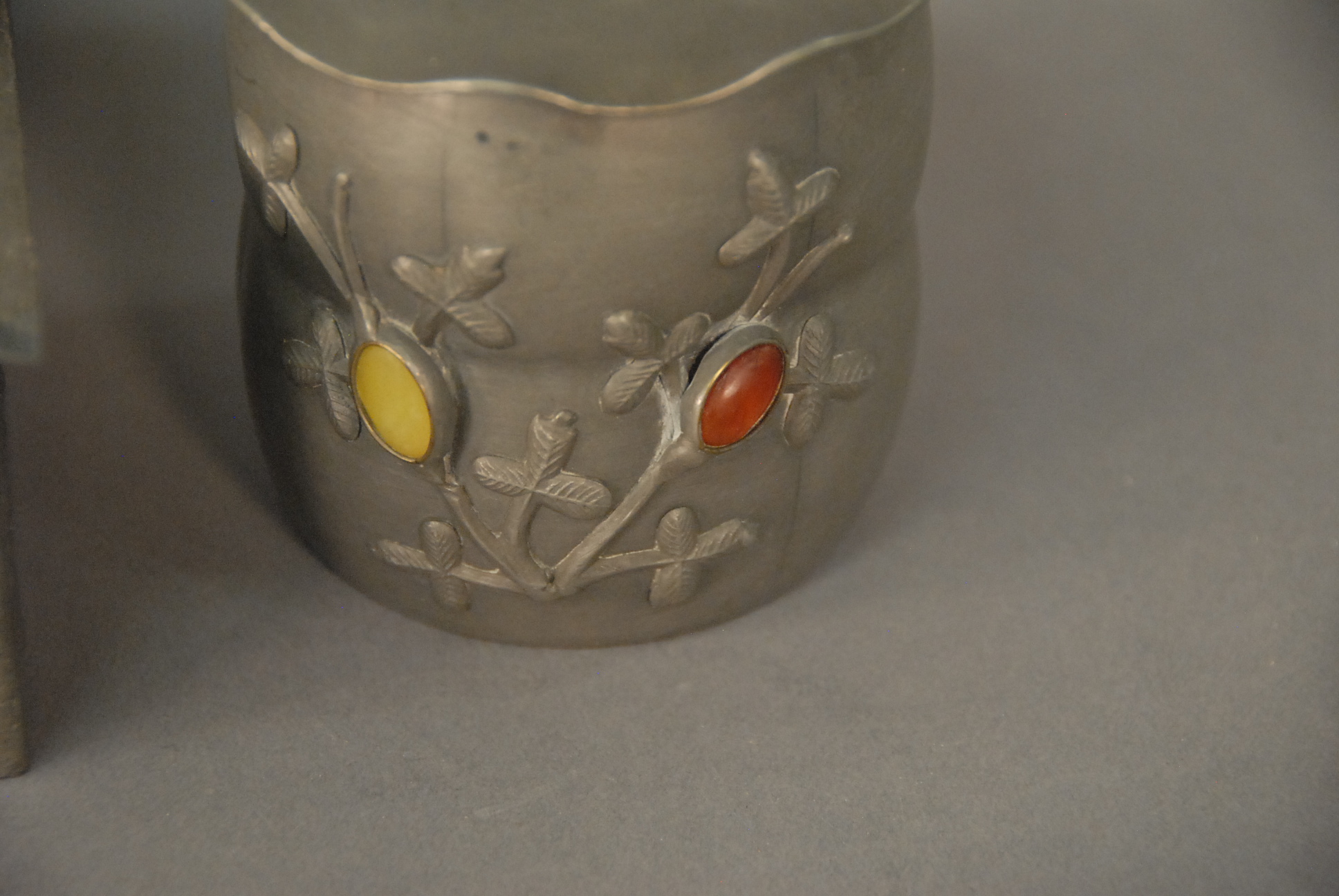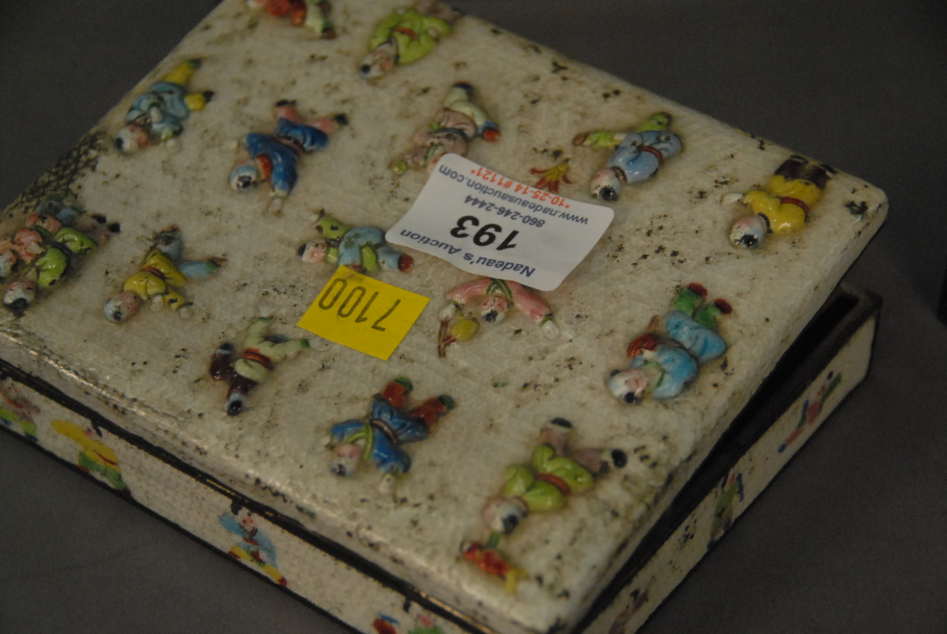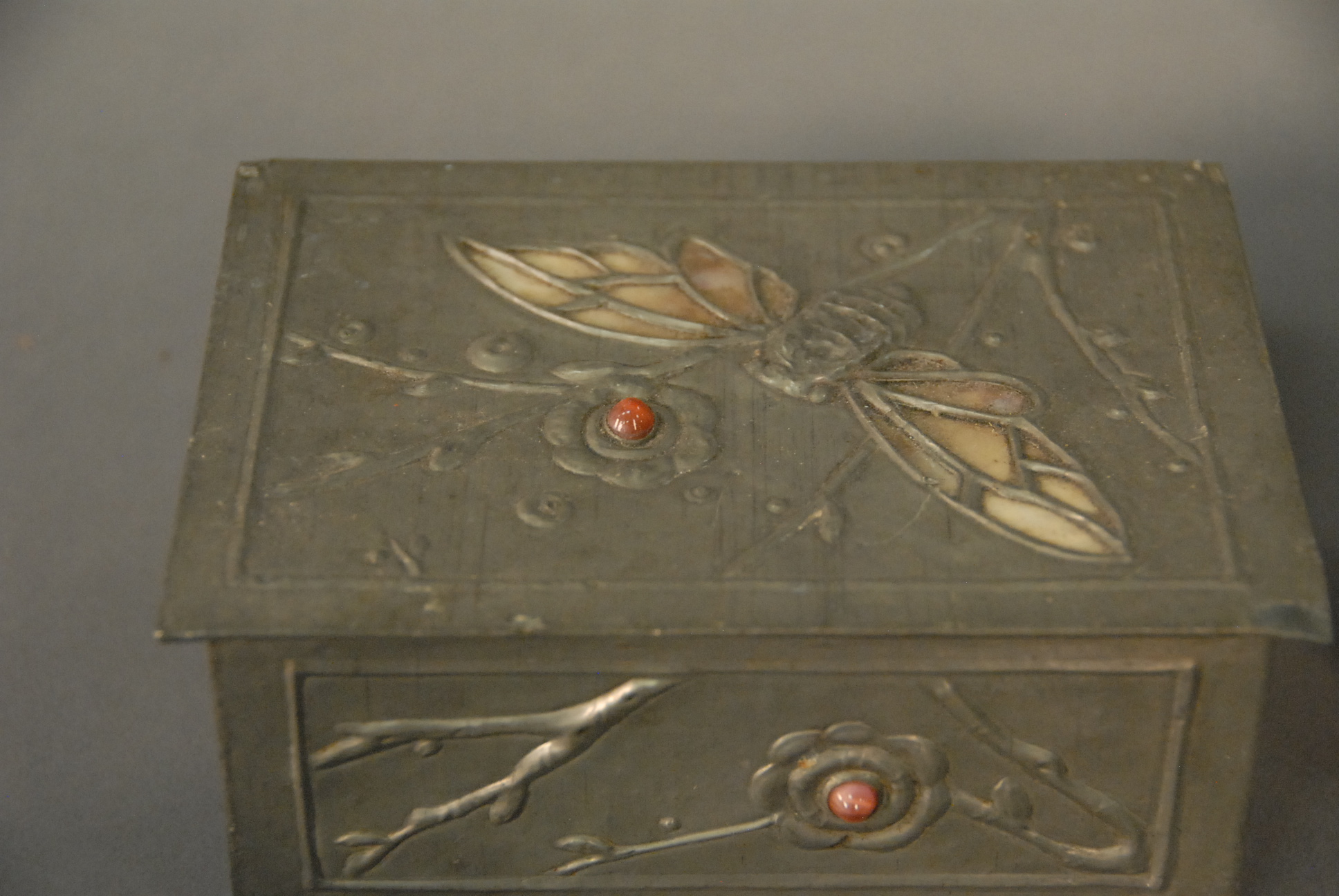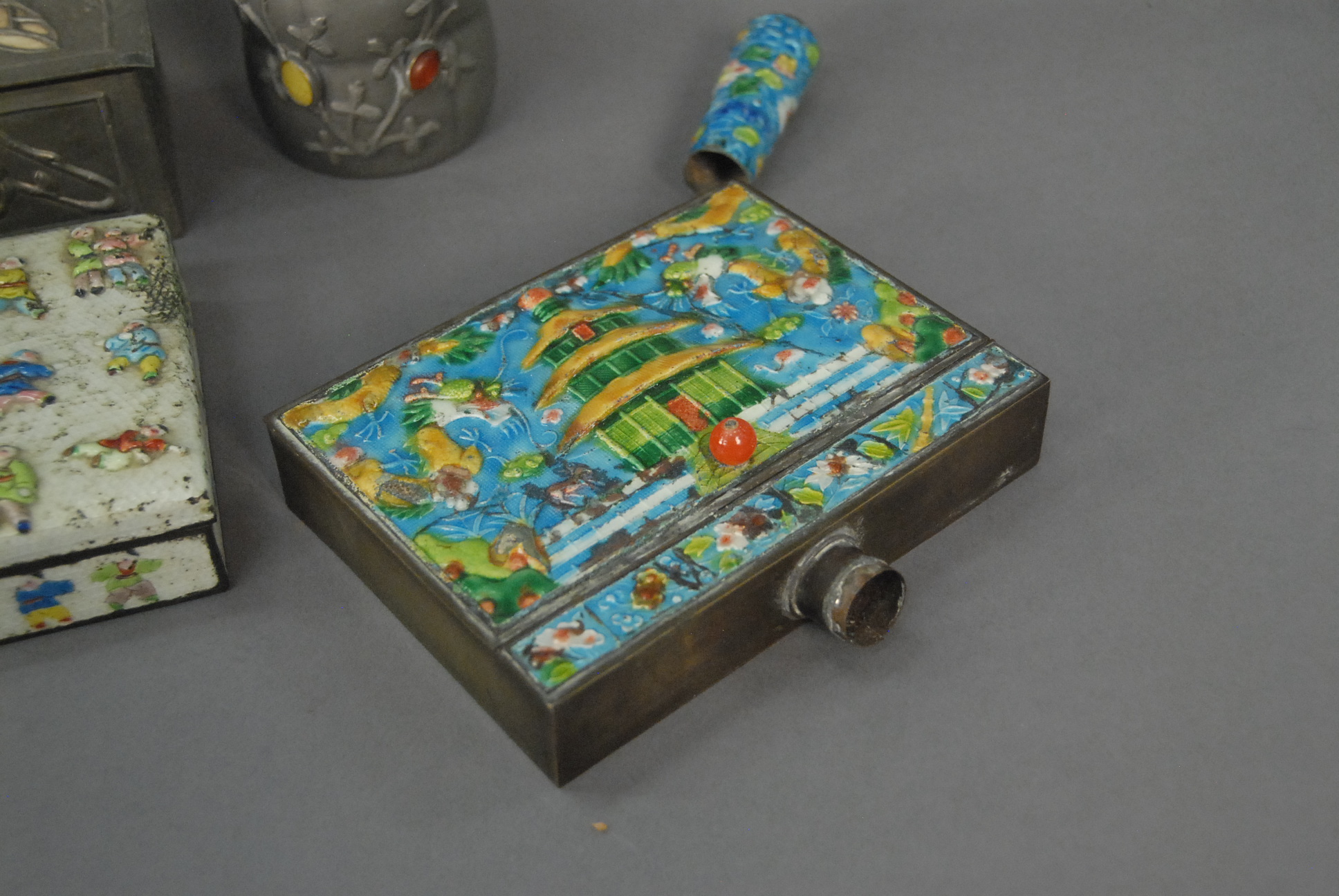 Lot 193: Four Chinese pieces to include enameled boys cigar box, enameled box with handle, and two pewter boxes mounted with hard stones.