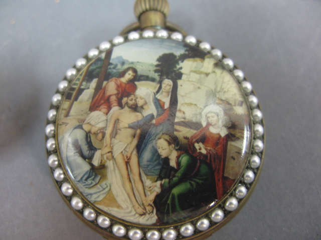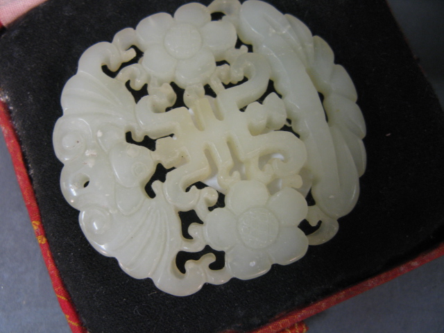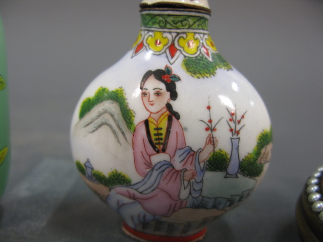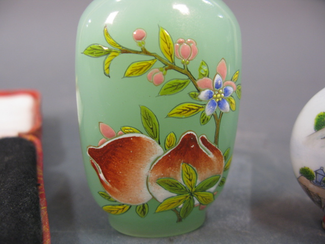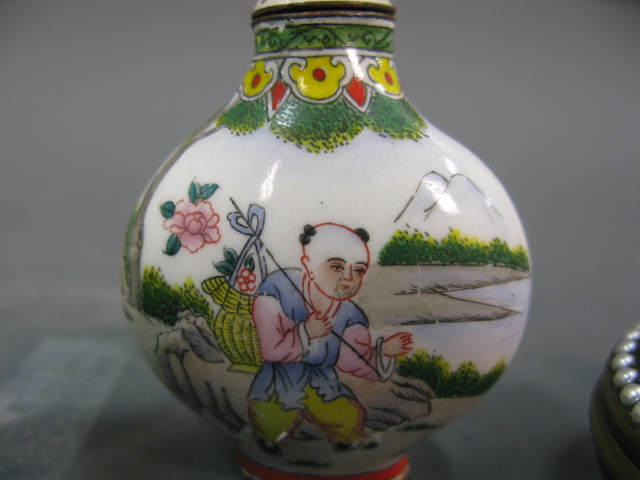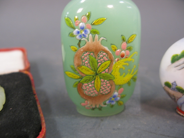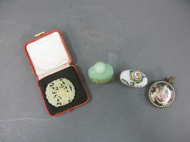 Four piece lot Oriental white jade pendant, enameled glass snuff bottle, enameled over copper snuff bottle and Omega pocket watch.