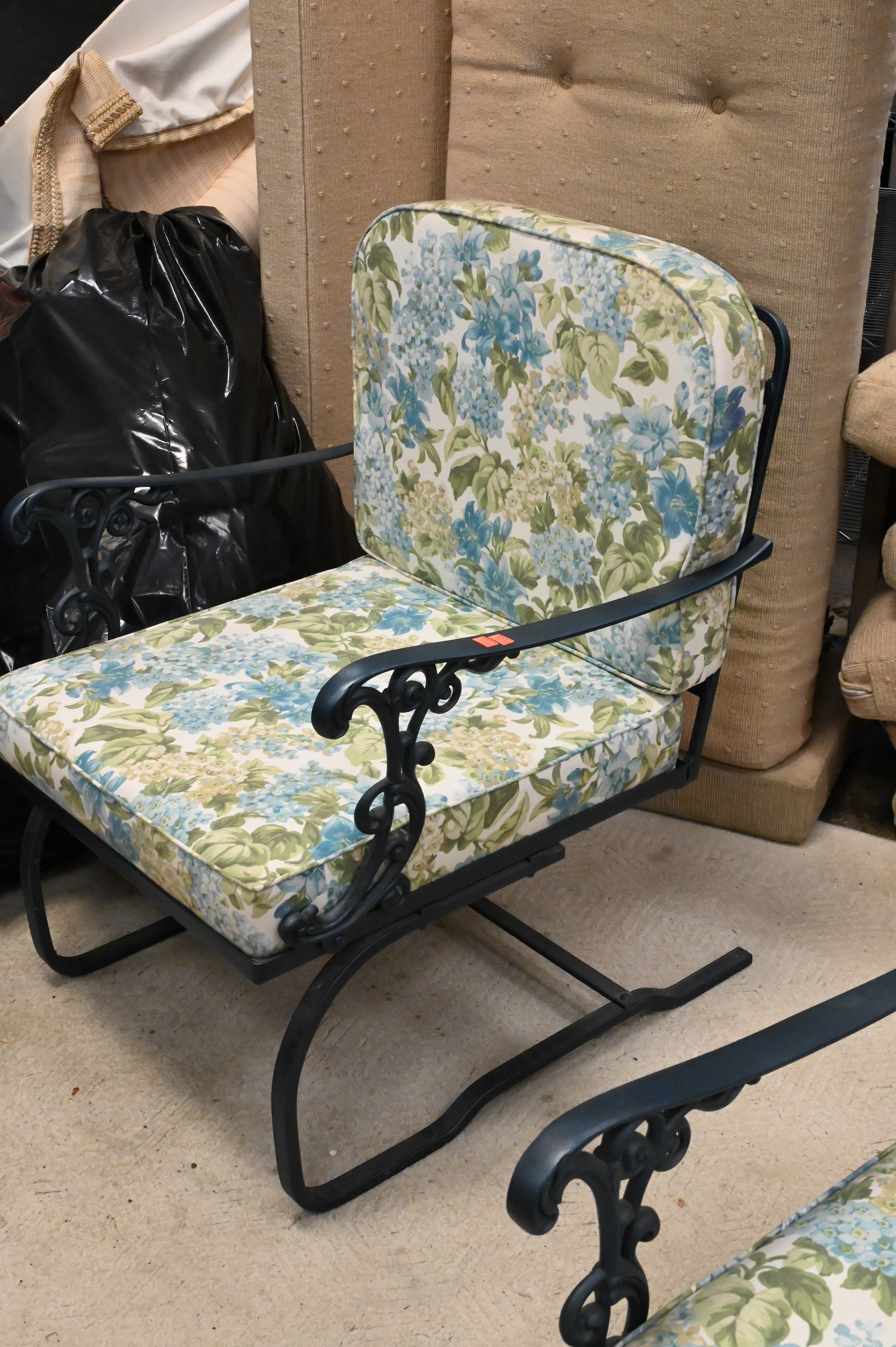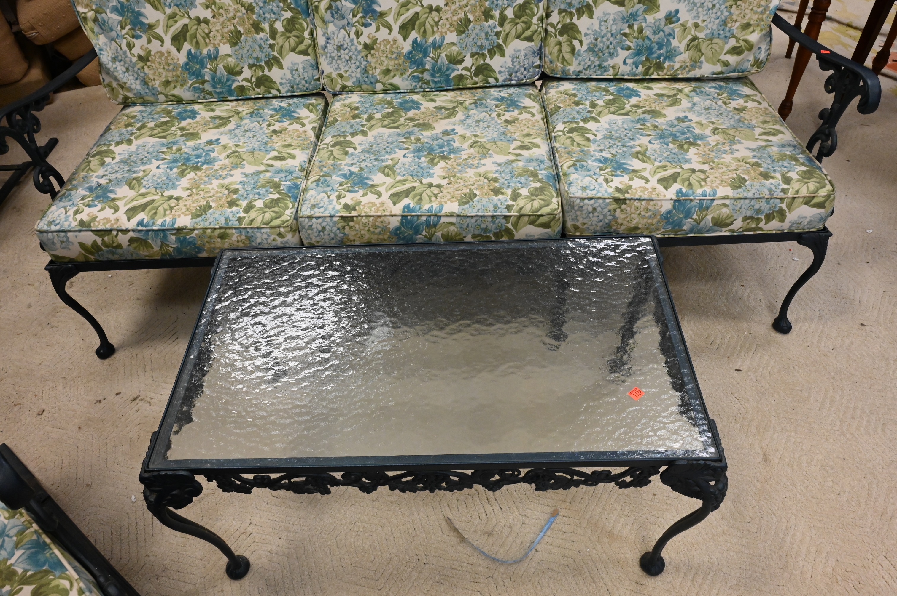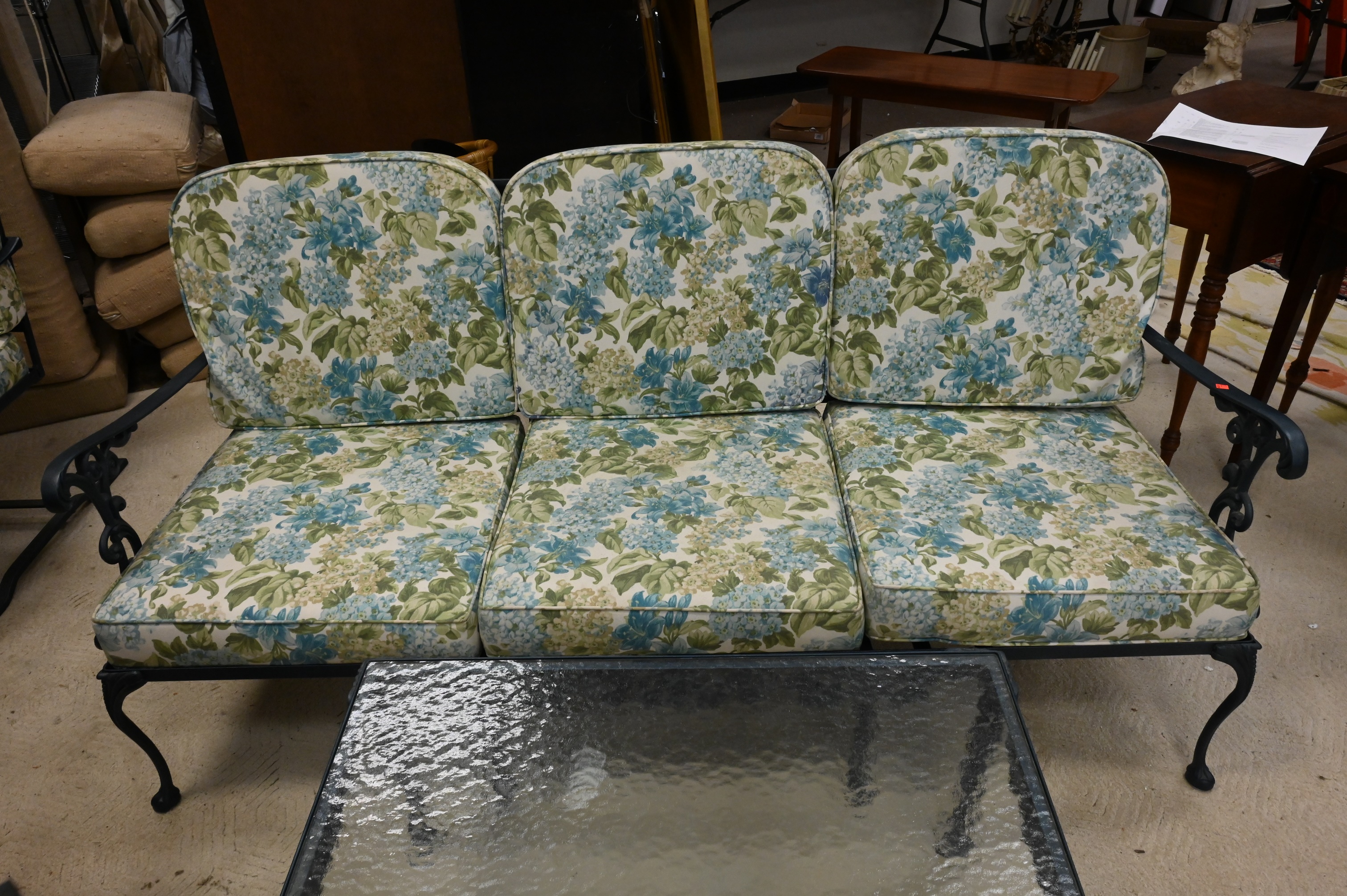 Four Piece Outdoor Set, to include a sofa, a pair of armchairs, all with cushions, along with a glass top coffee table sofa width 66 inches, height 30 inches, chair height 34 inches, width 24 inches.