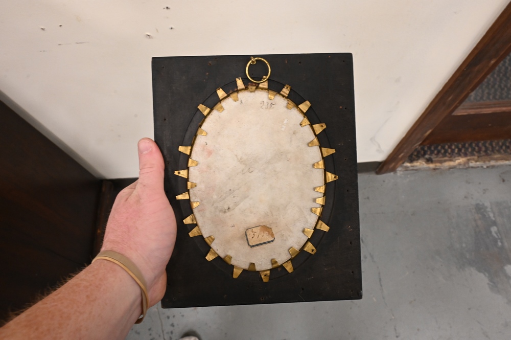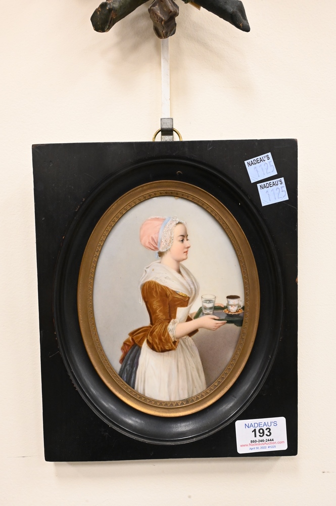 Lot 193: German Painting on Porcelain Plaque, of a young woman, plaque height 6 5/8 inches. Provenance: Estate of Florence Yannios, Cheshire, CT.