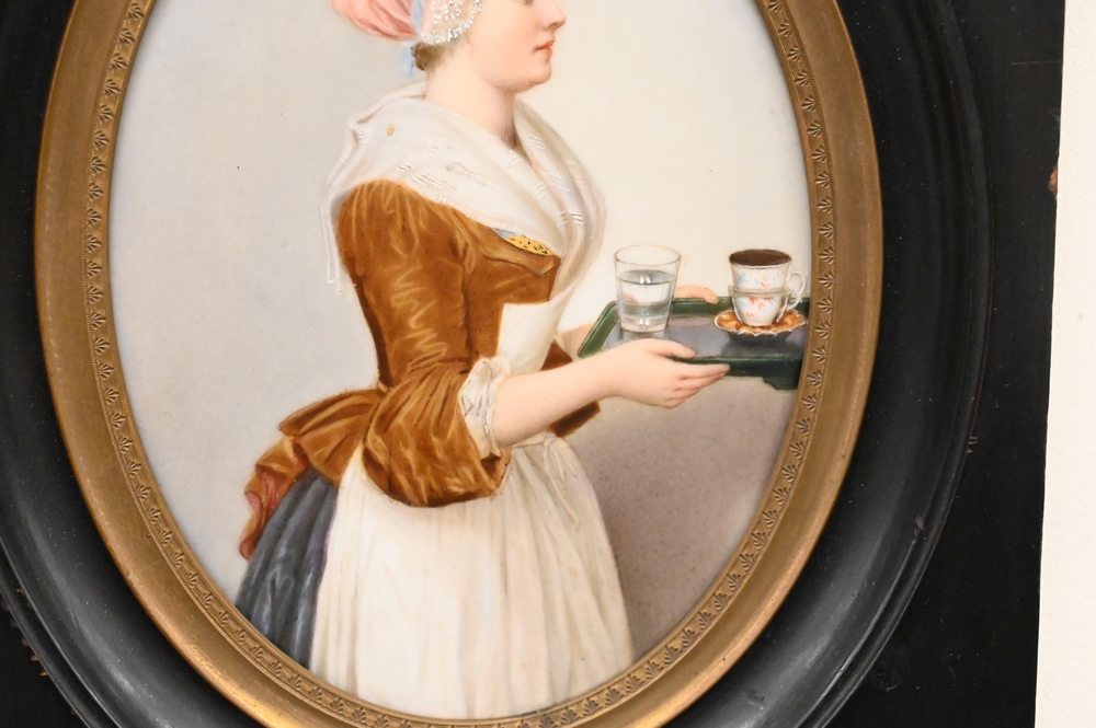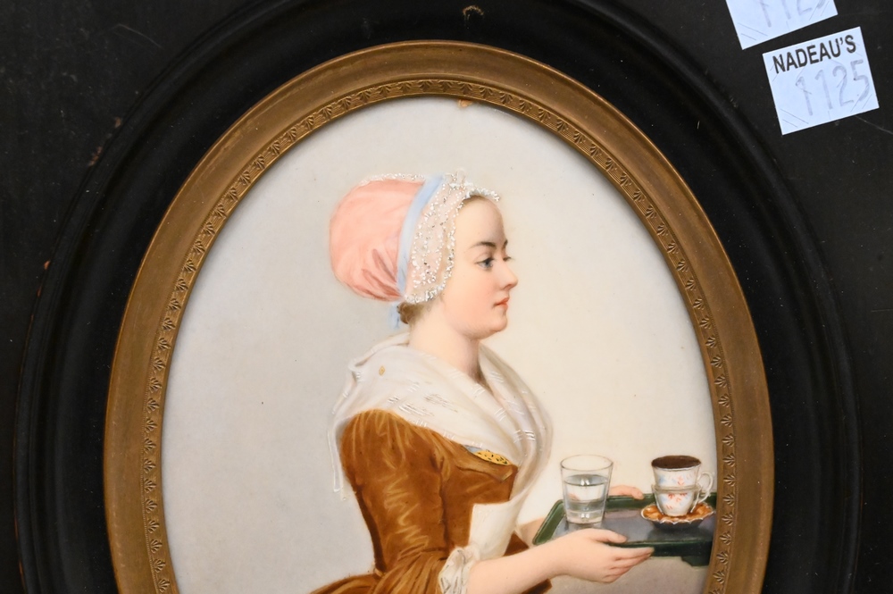 German Painting on Porcelain Plaque, of a young woman, plaque height 6 5/8 inches. Provenance: Estate of Florence Yannios, Cheshire, CT.