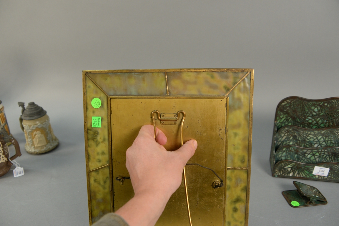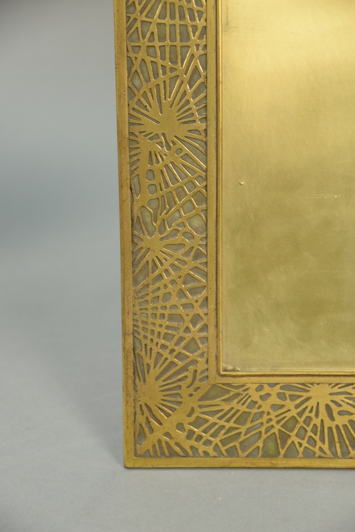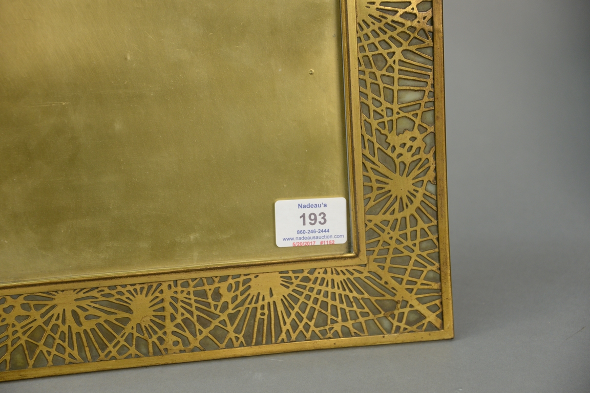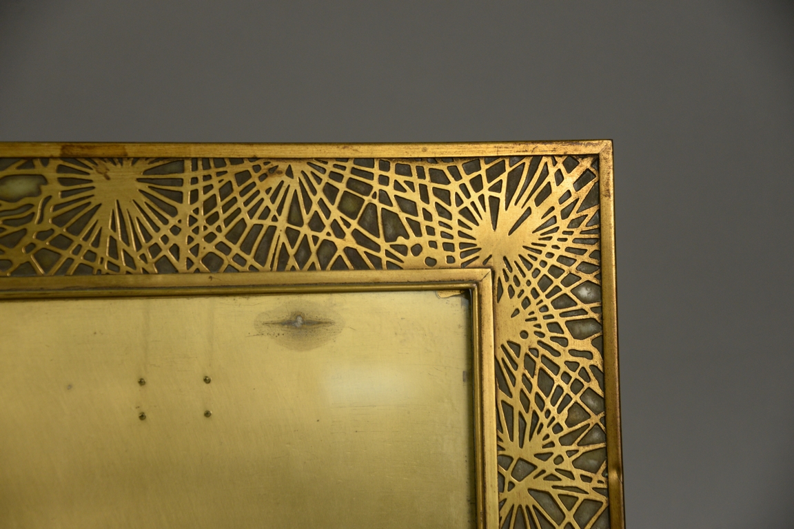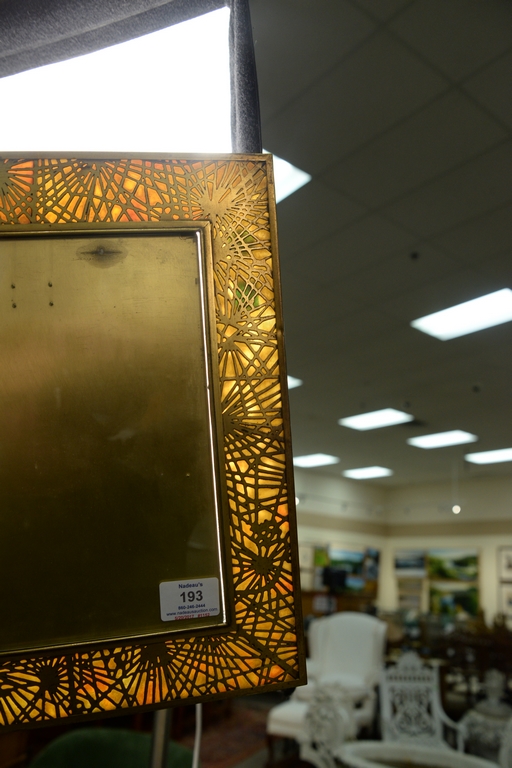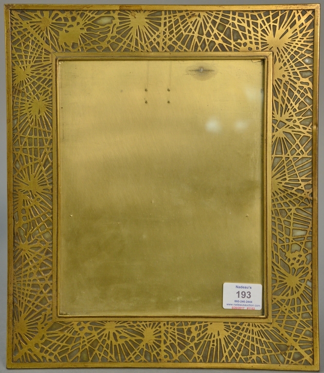 Lot 193: Large Tiffany Studios pine needle picture frame having open work gilt metal frame against butterscotch slag glass ground signed Tiff…