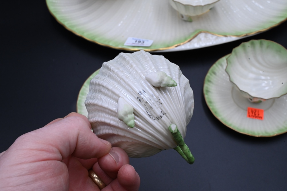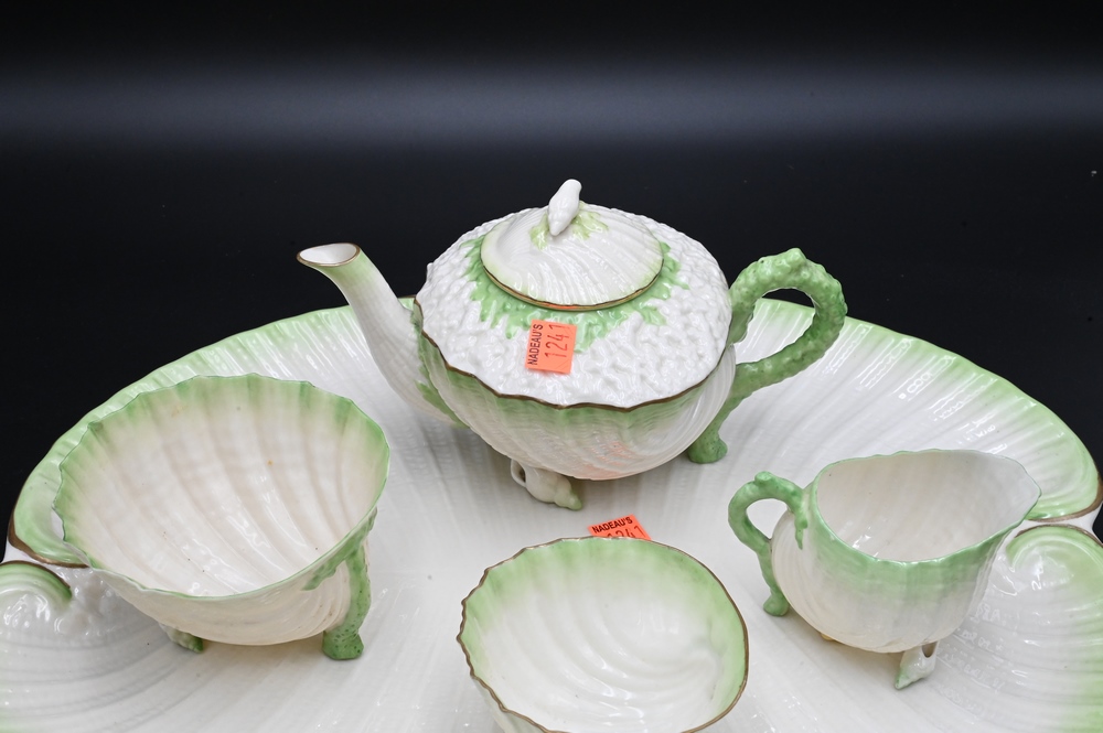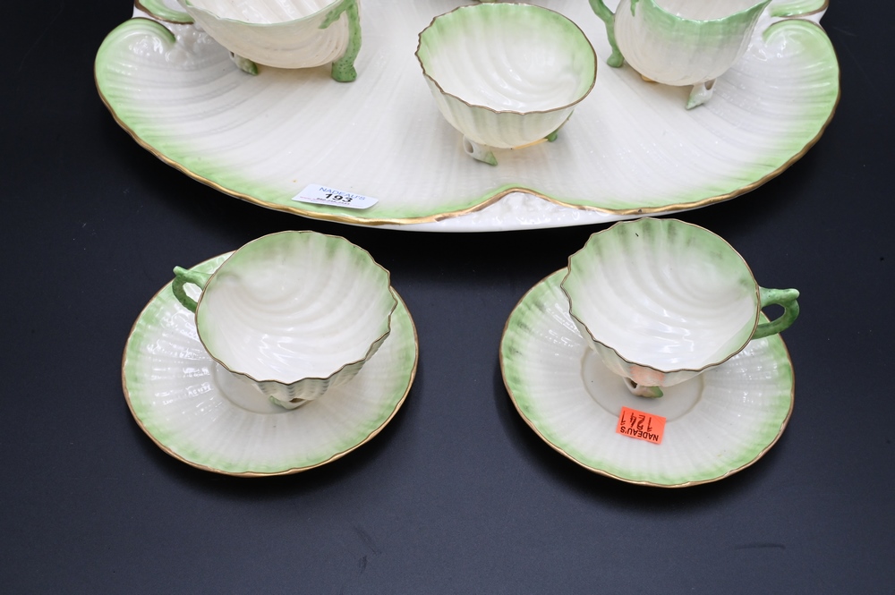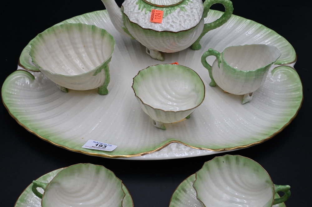 Nine Piece Belleek Neptune Porcelain Green Shell and Coral Form Tea Set, to include teapot, sugar, creamer, cups, saucers, and tray, having black mark on bottom; tallest 5 inches. Provenance: Collections of Norma Reilly, New Jersey.