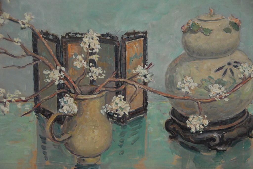 Oil on canvas still life of Oriental jar, flowers, and table screen, unsigned, 20 x 36.