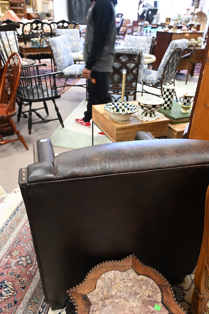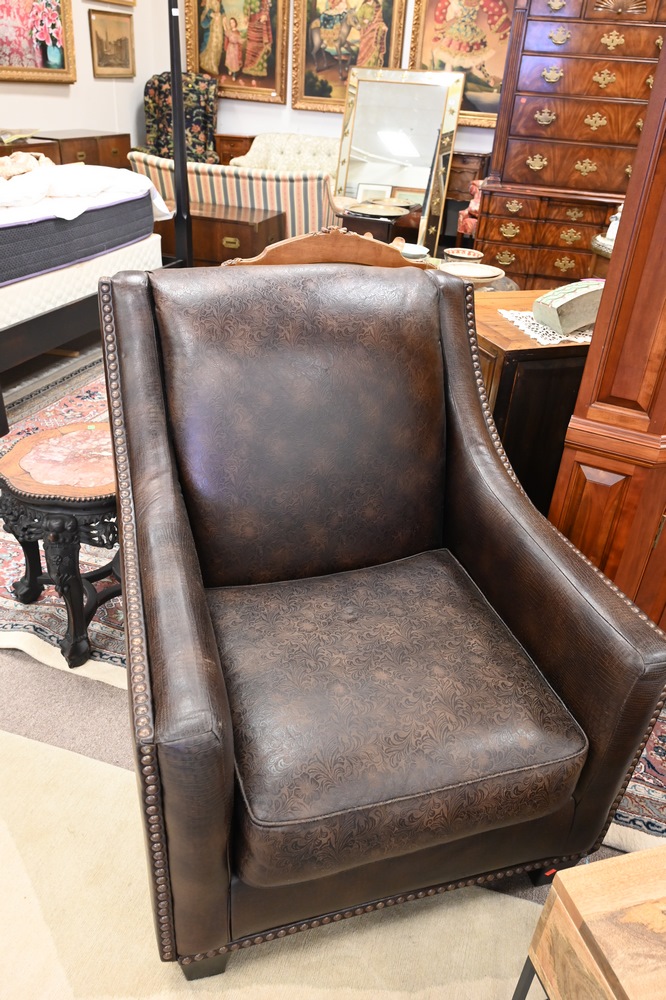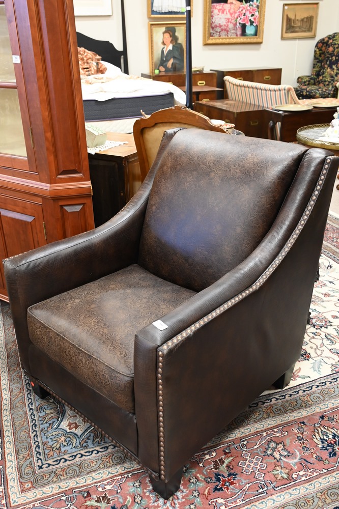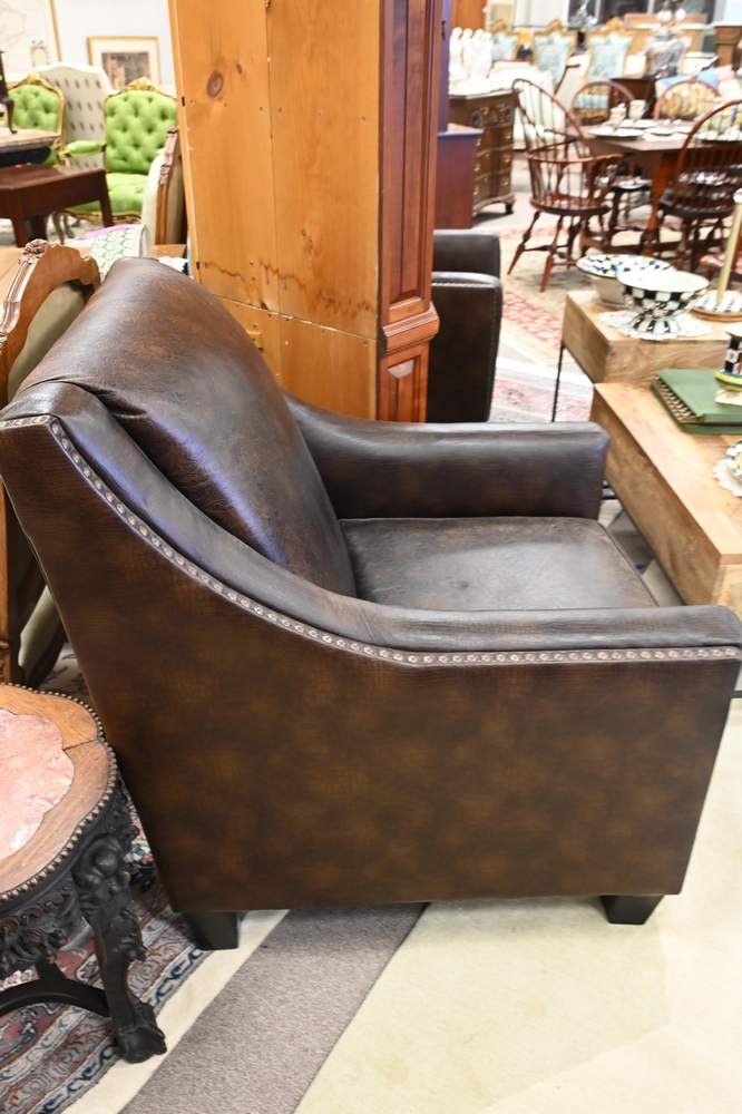 Lot 193: Pair of Brown Leather Armchairs, having large brass tacks, height 38 inches, width 32 inches.