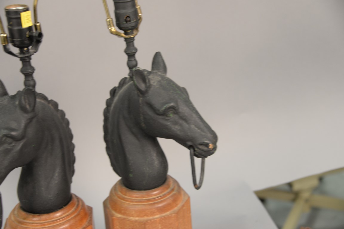Pair of iron horse head hitching post tops, made into table lamps. total ht. 30in.
