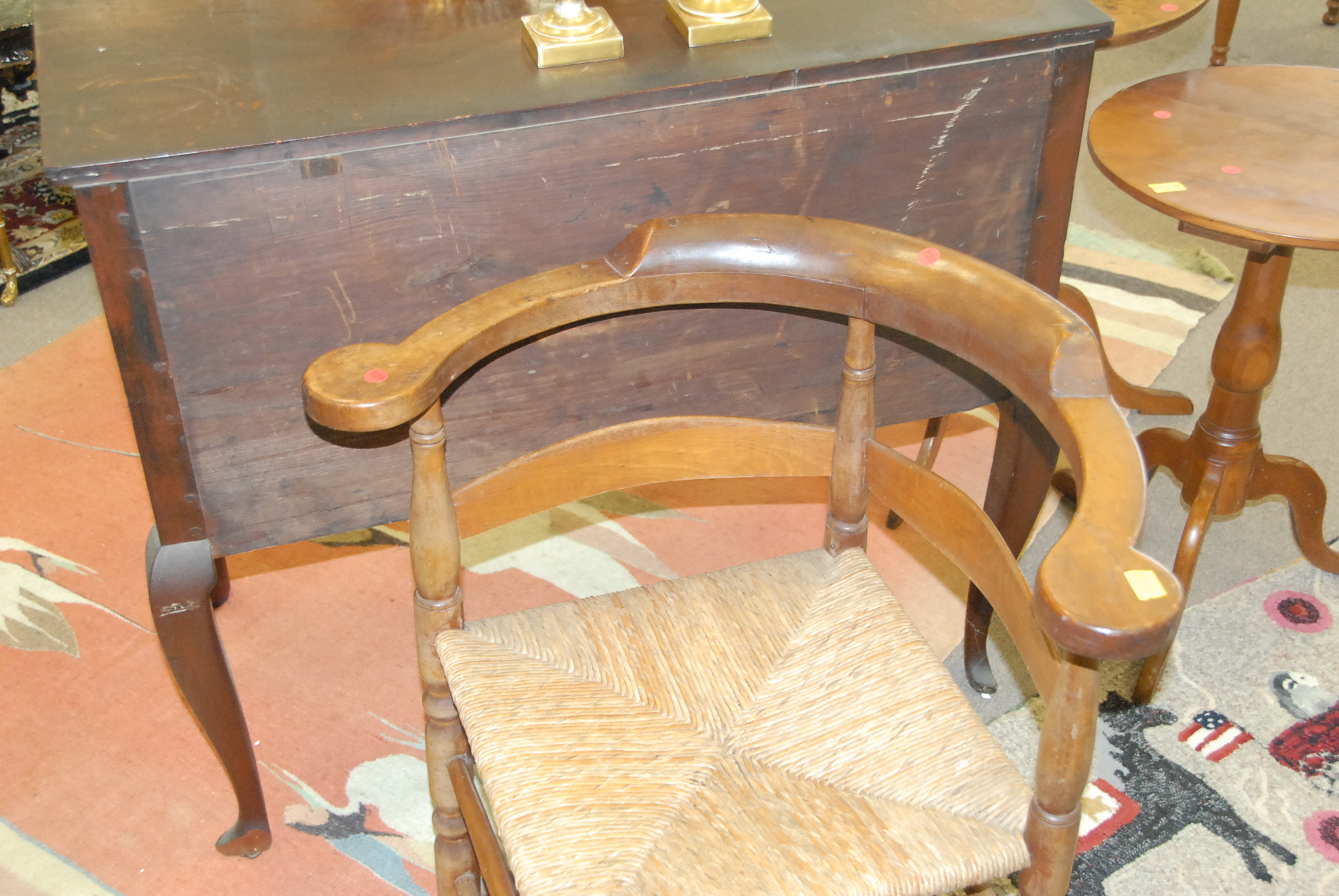 Primitive corner chair with rush seat.