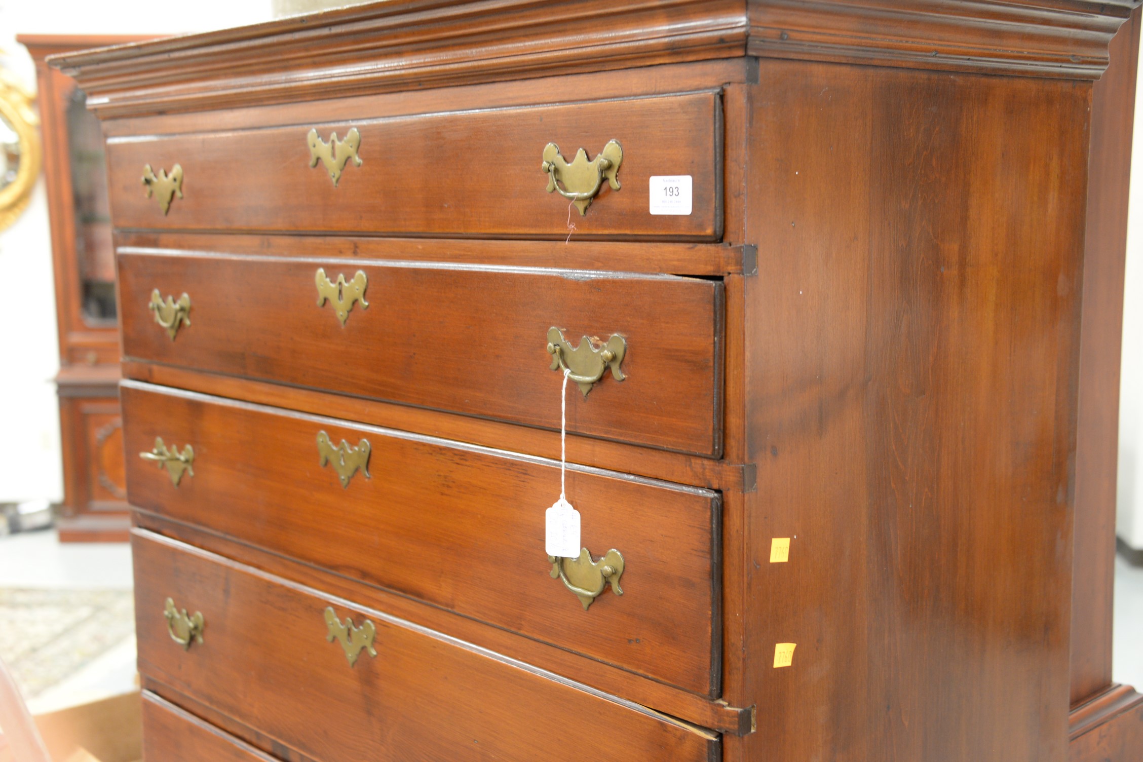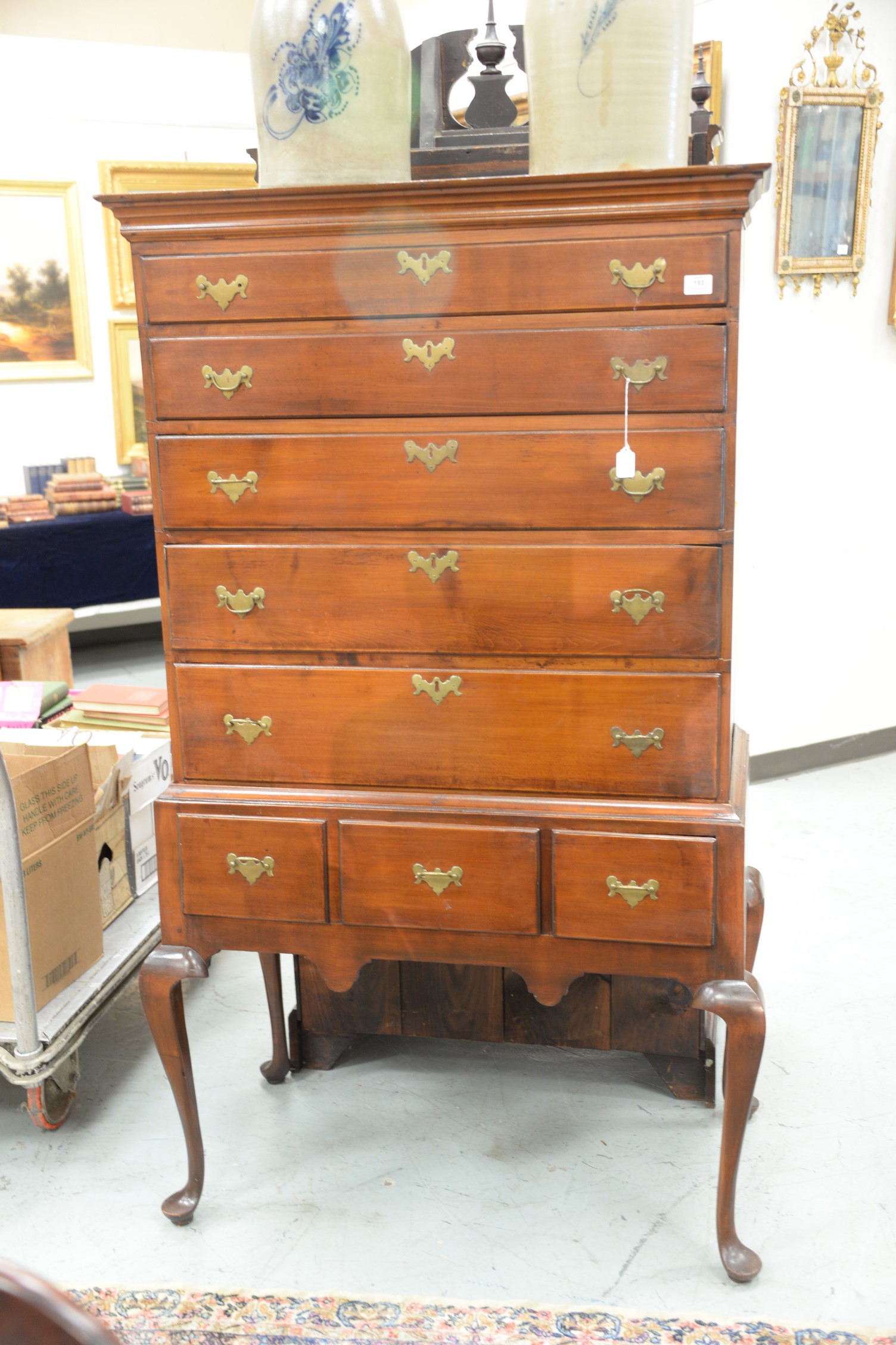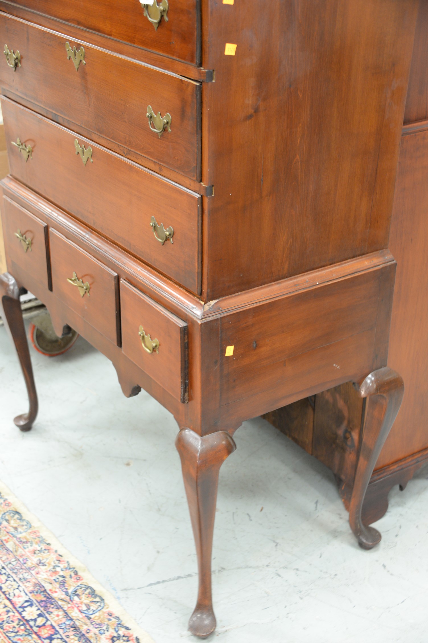 Lot 193: Queen Anne cherry highboy in two parts with cornice molded top over five drawers on lower portion with three short drawers all set o…