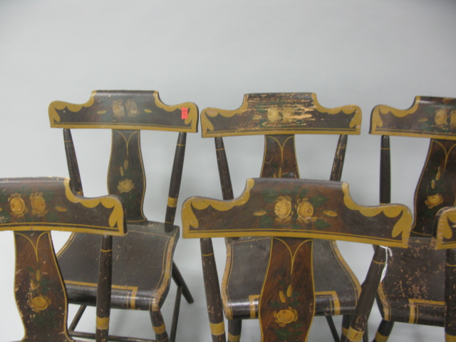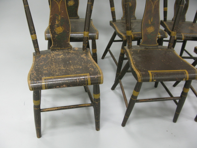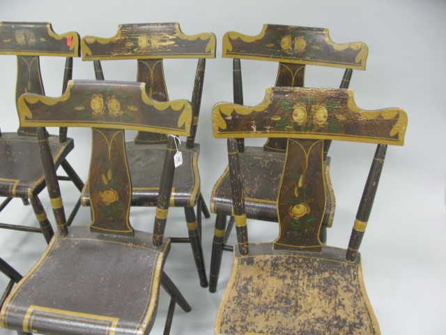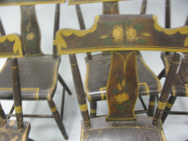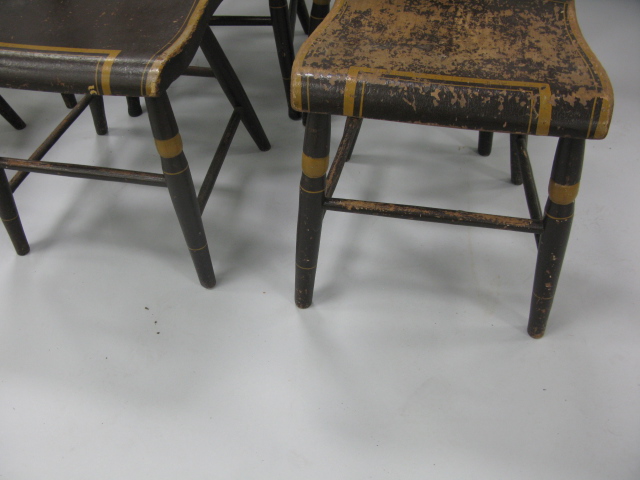 Set of six paint decorated plank set primitive chairs