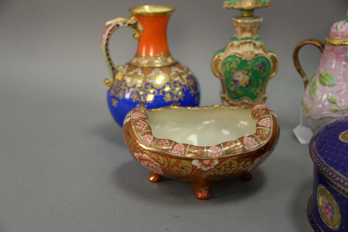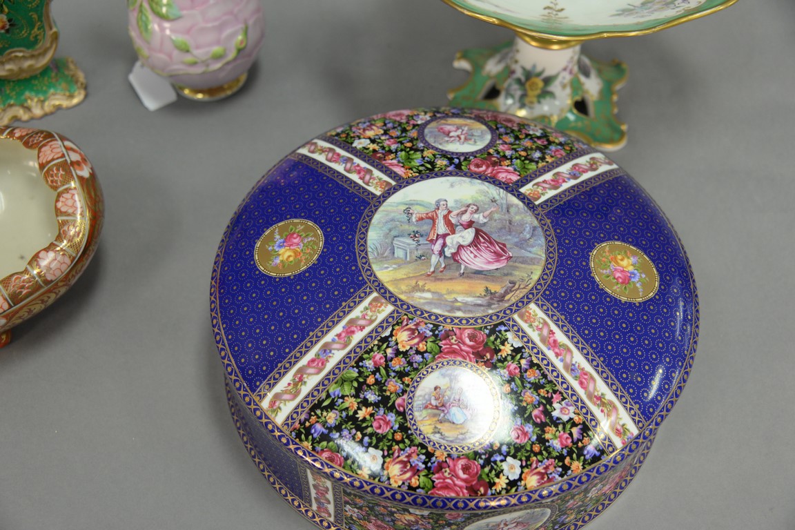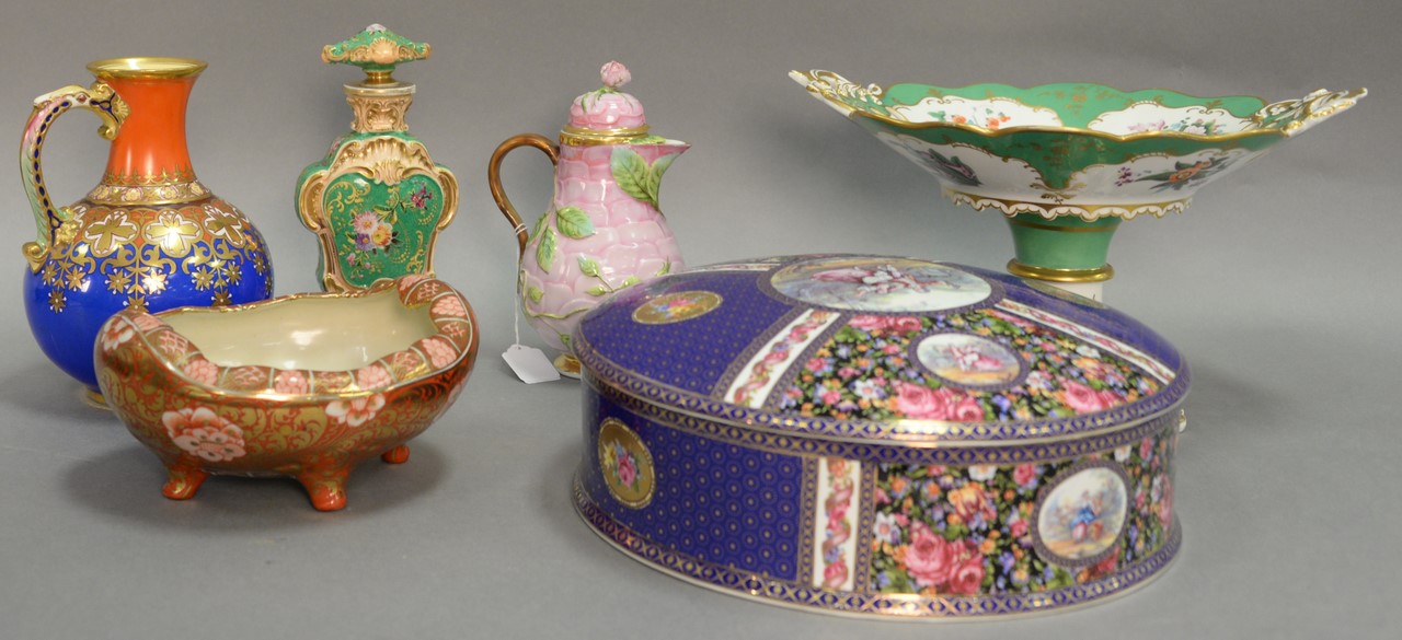 Six porcelain pieces including large French porcelain compote and a French porcelain bottled, molded rose pitcher, hand painted vase with dragon handle dia. 8 1/4, rose bowl, and large Limoges covered box. ht. 8 to 9