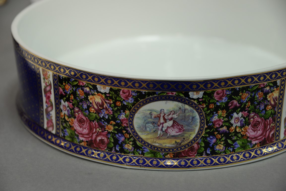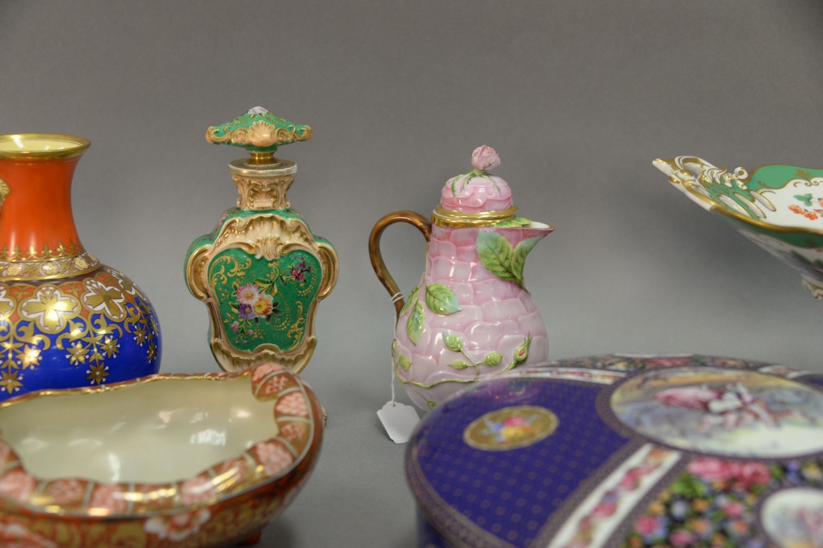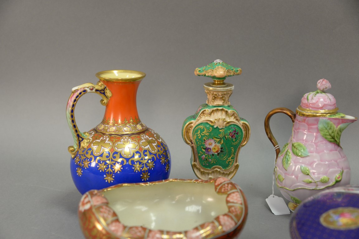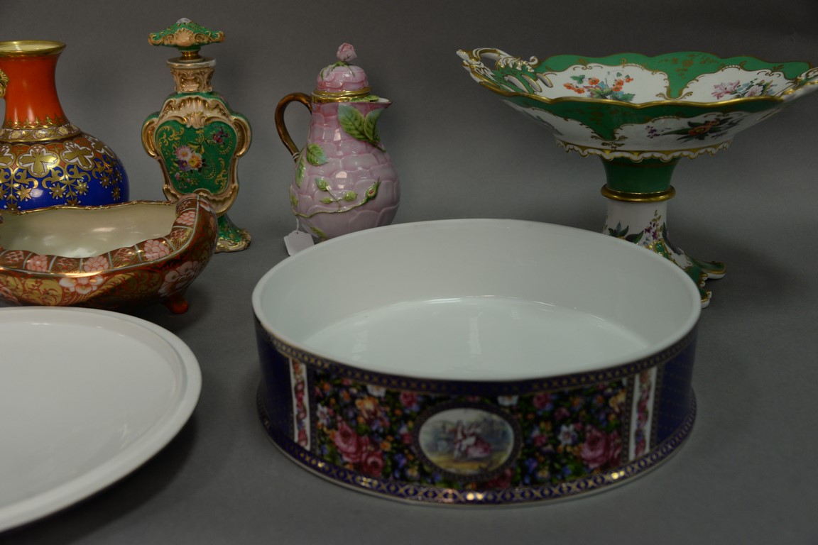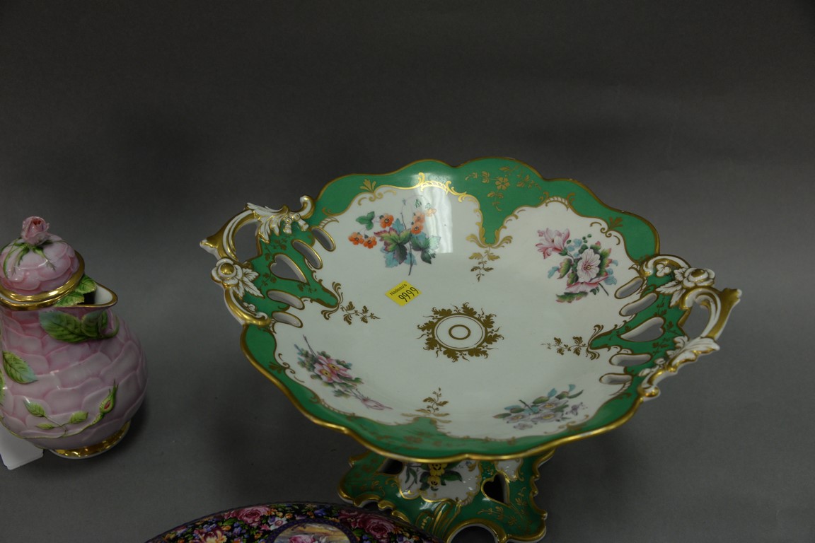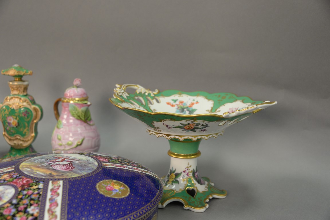 Lot 193: Six porcelain pieces including large French porcelain compote and a French porcelain bottled, molded rose pitcher, hand painted vase…