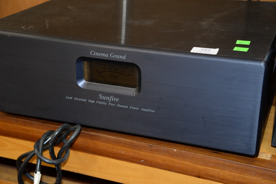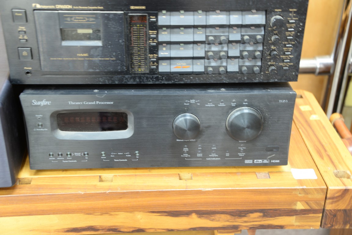 Three piece group to include Sunfire TGP-5 preamplifier surround Theater Grand Processor, Nakamichi cassette deck, and Cinema Grand Sunfire Load Invariant High Fidelity Five channel power amplifier.