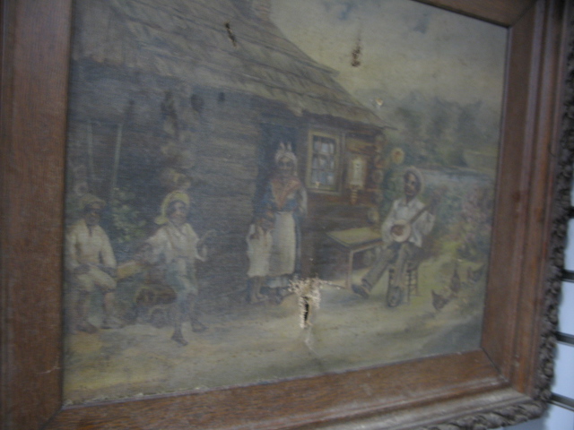 Two oil paintings, one oil on canvas in the manner of Adkins with Afro American by a cabin playing a banjo with chickens in the yard and one oil on board of a dog.