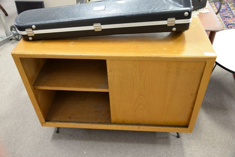 Lot 193: Two piece lot to include Swedish blond sliding door cabinet and a Space Age round/hairpin coffee table Homegrown Aldon’s Woodworki…