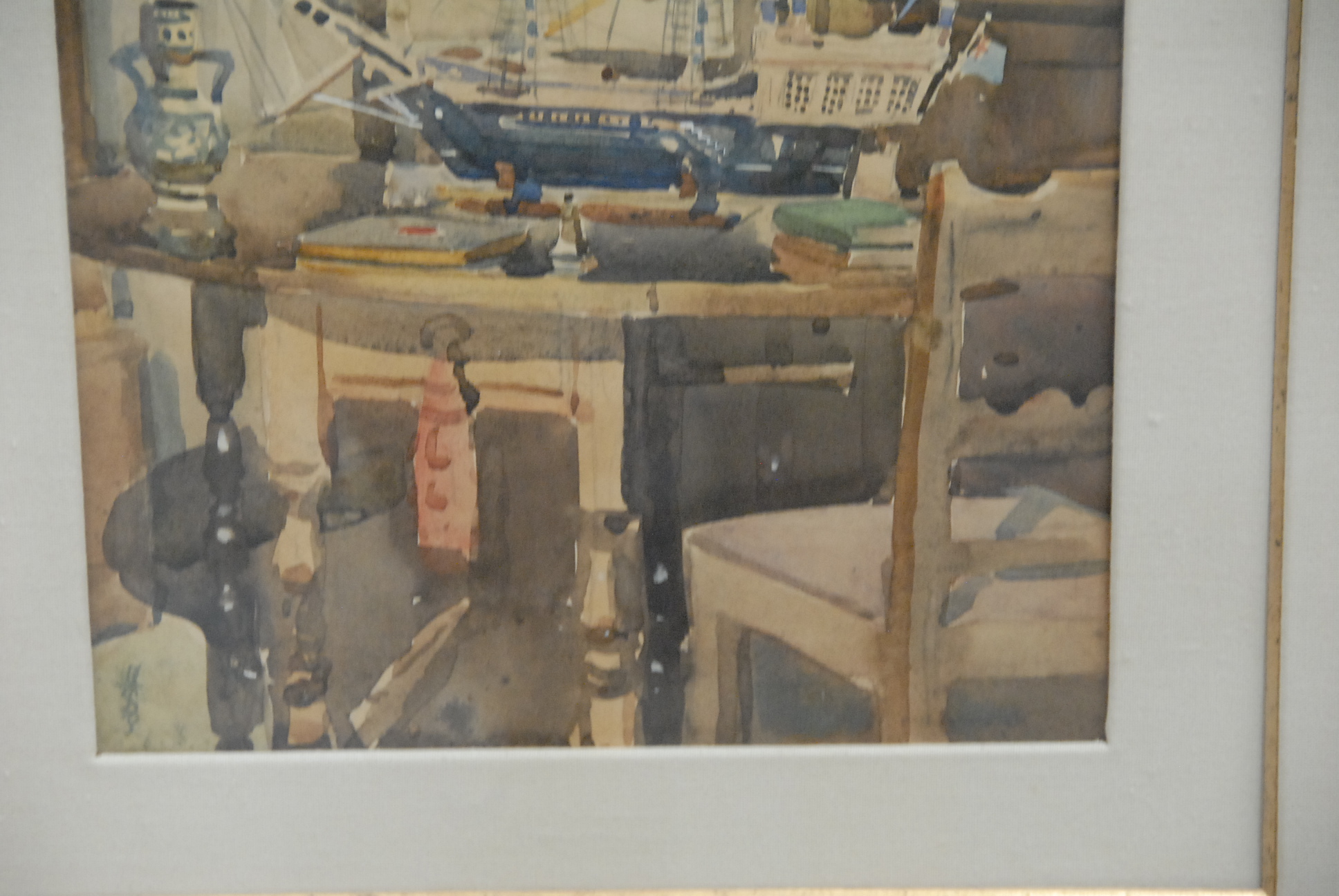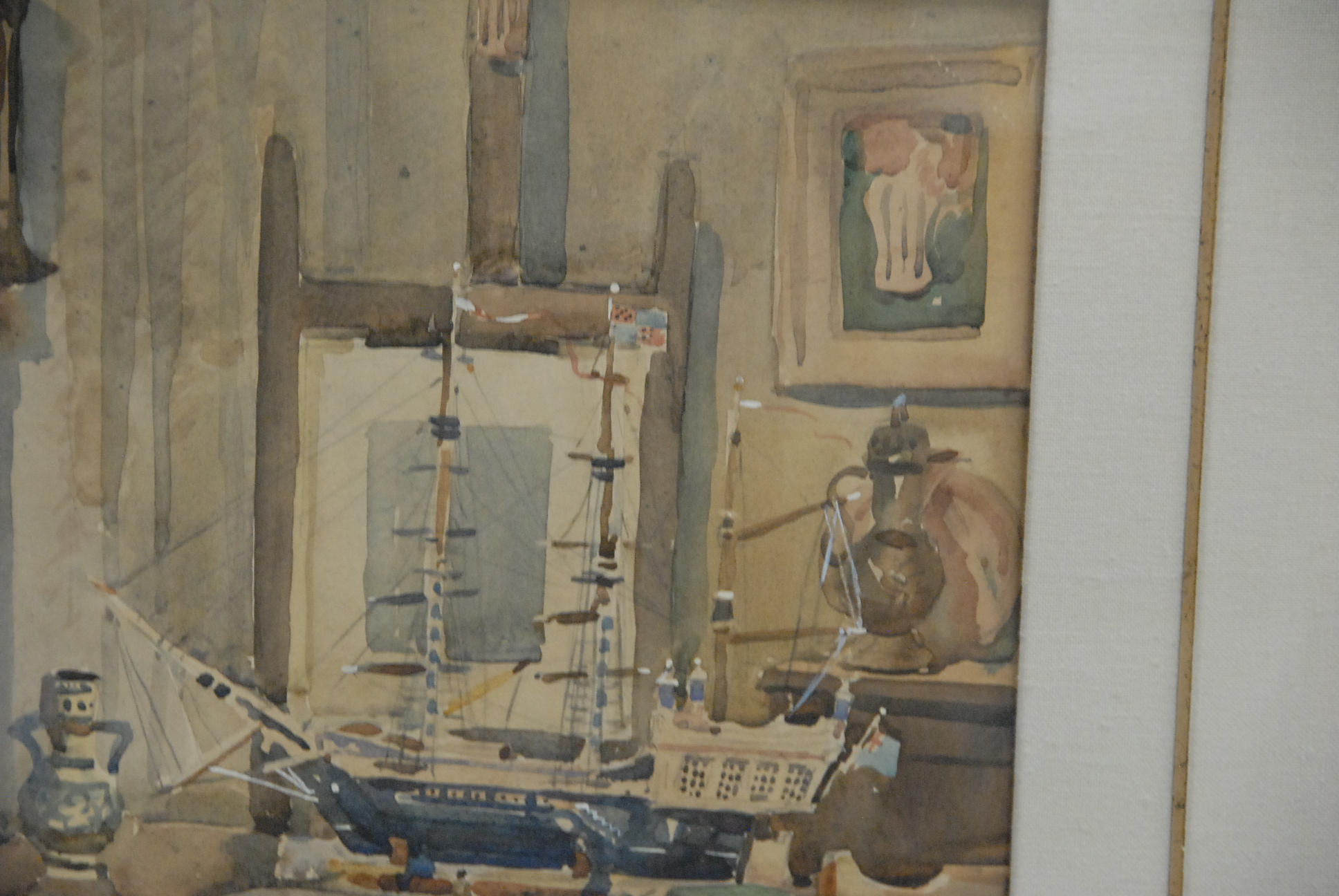 Watercolor of an interior scene with a ship model, monogrammed lower left.