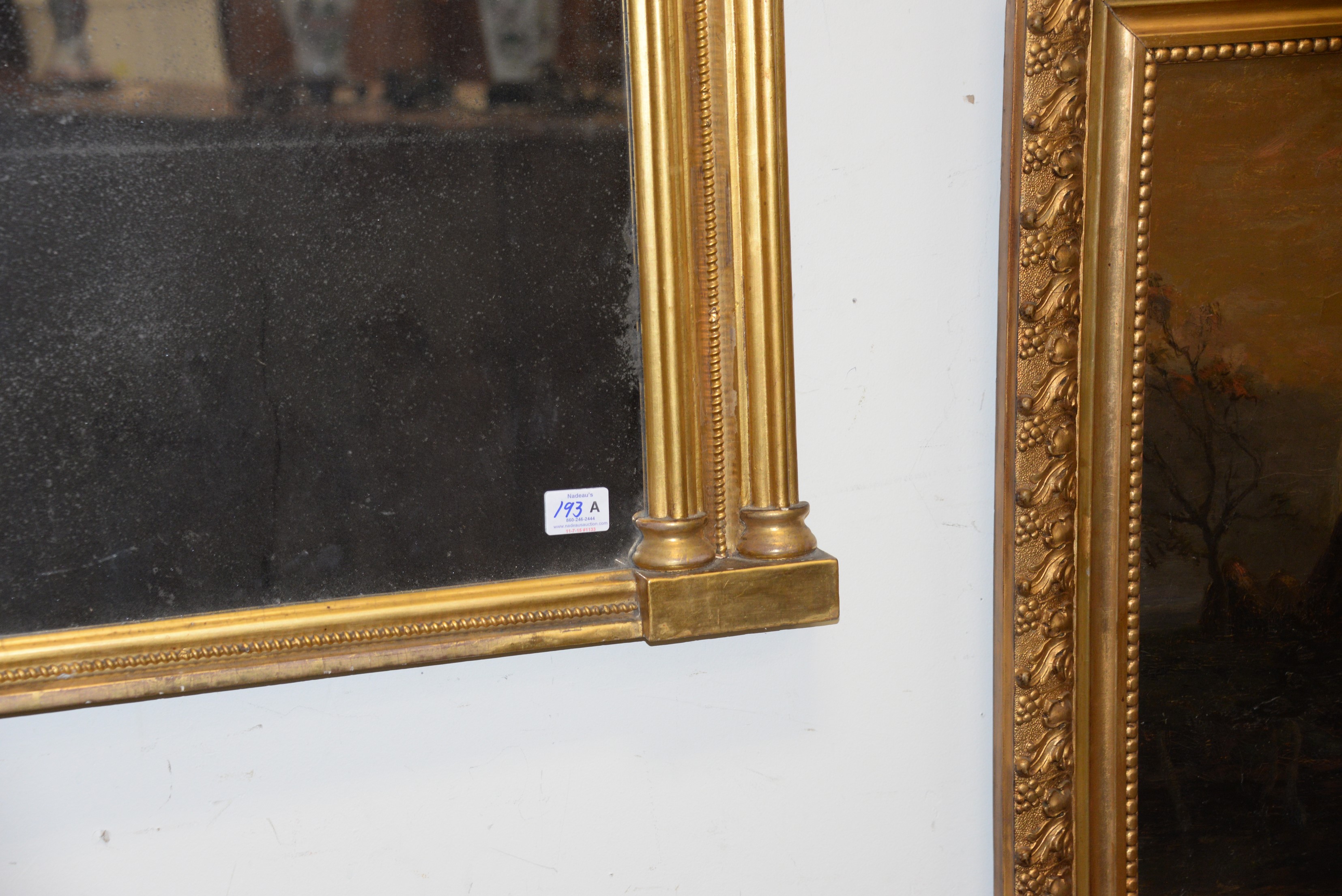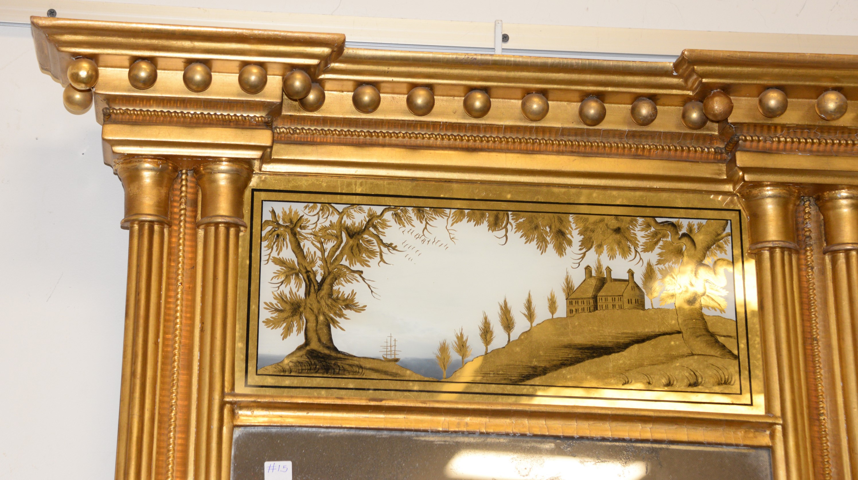 Lot 193A: Federal gilt mirror having cornice top with drop ball decoration over eglomise panel of colonial home on hill, all flanked by fluted…