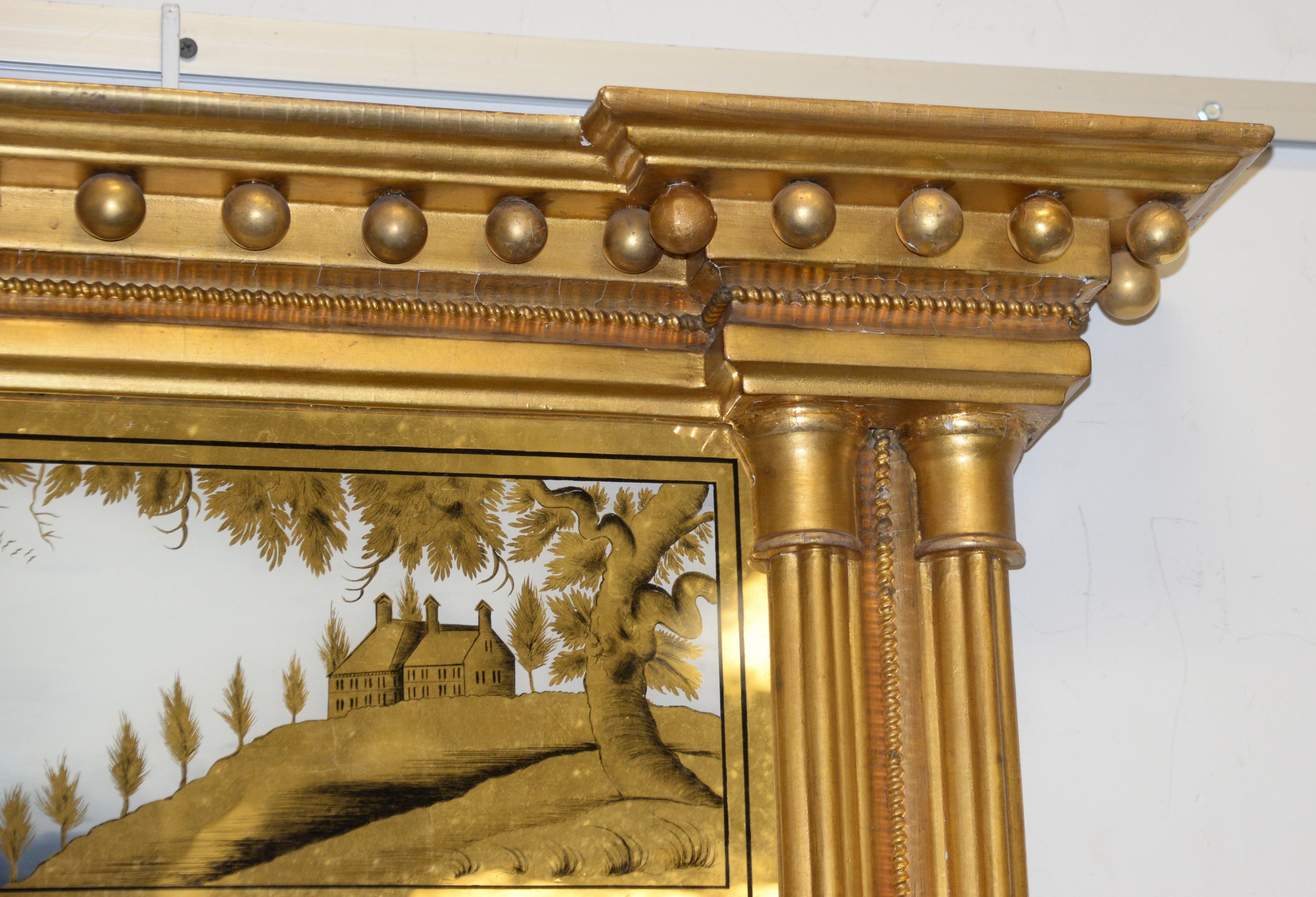 Federal gilt mirror having cornice top with drop ball decoration over eglomise panel of colonial home on hill, all flanked by fluted columns, New York or Boston, circa 1810. ht. 47 in. wd. 32 1/2 in.