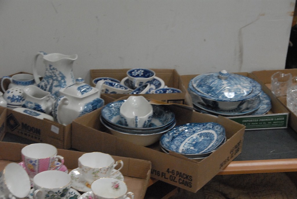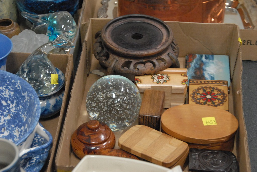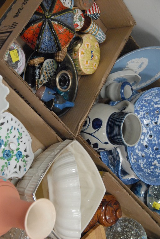 Fifteen boxes small curios, stoneware, cutglass, blue and white dishes etc.