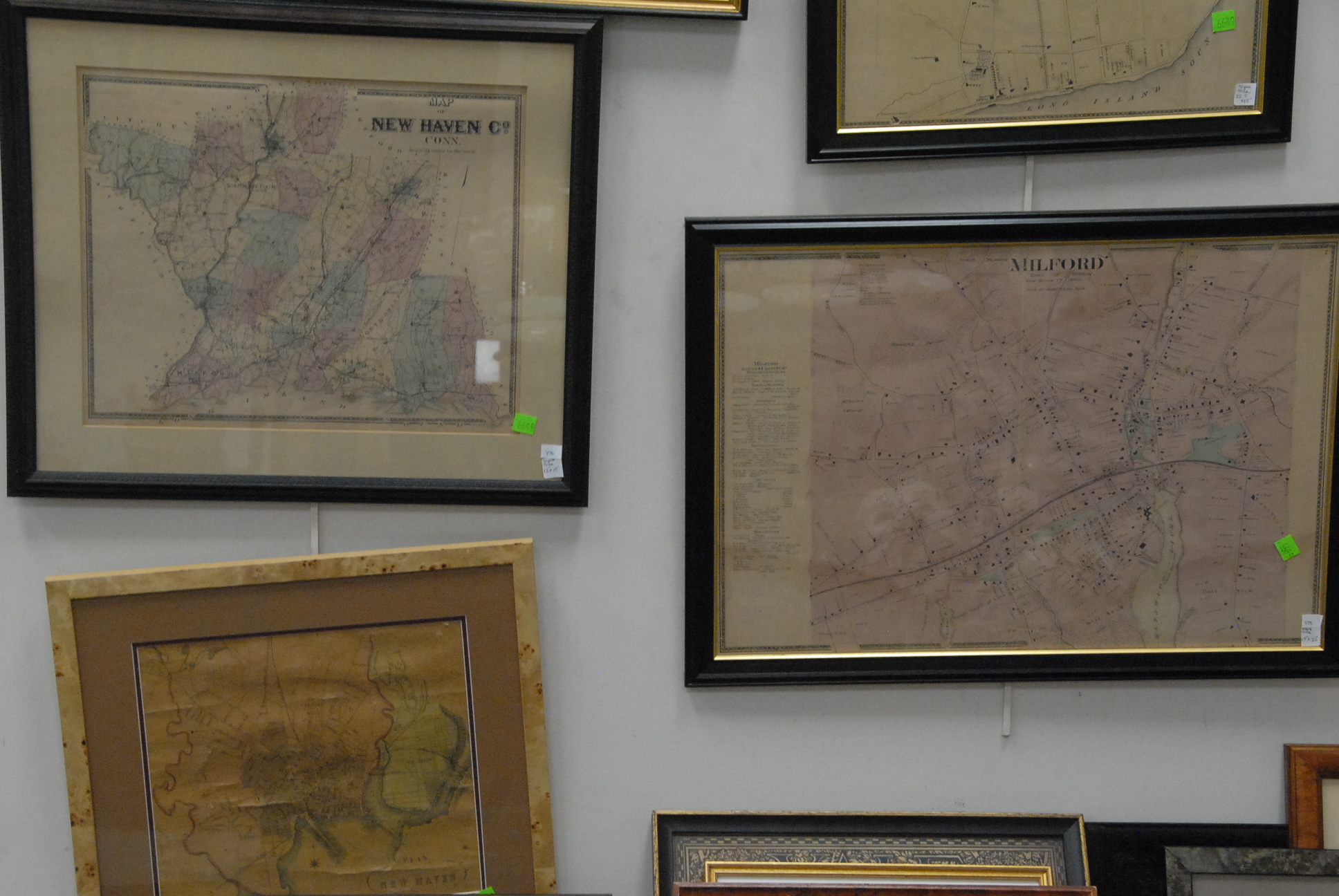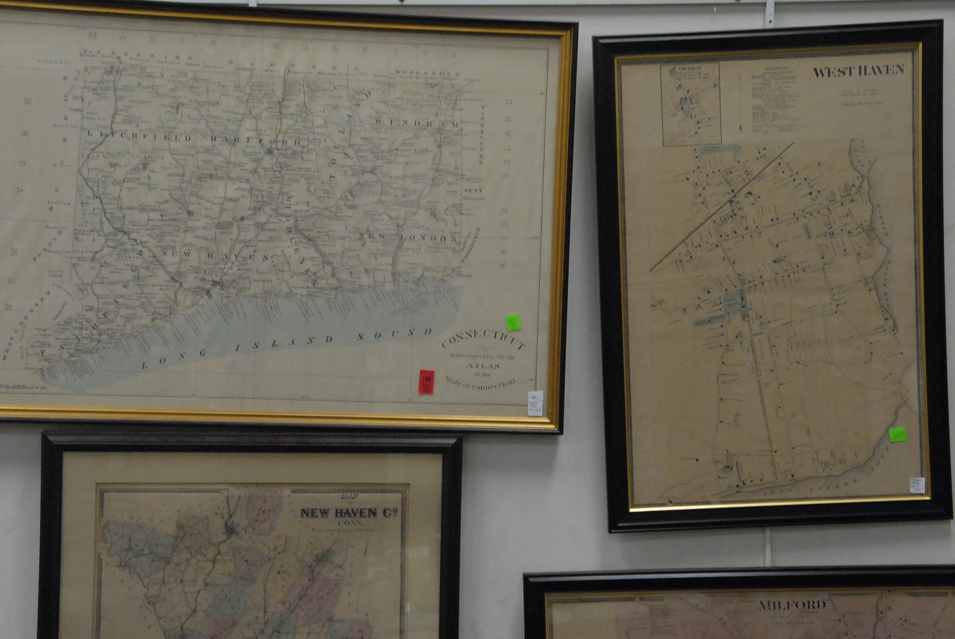 Lot 194: Five framed maps Town Of West Haven Beers 1867, fragment of 1851 wall map City Of New Haven, Town Of New Haven Ward Map Beers 186…
