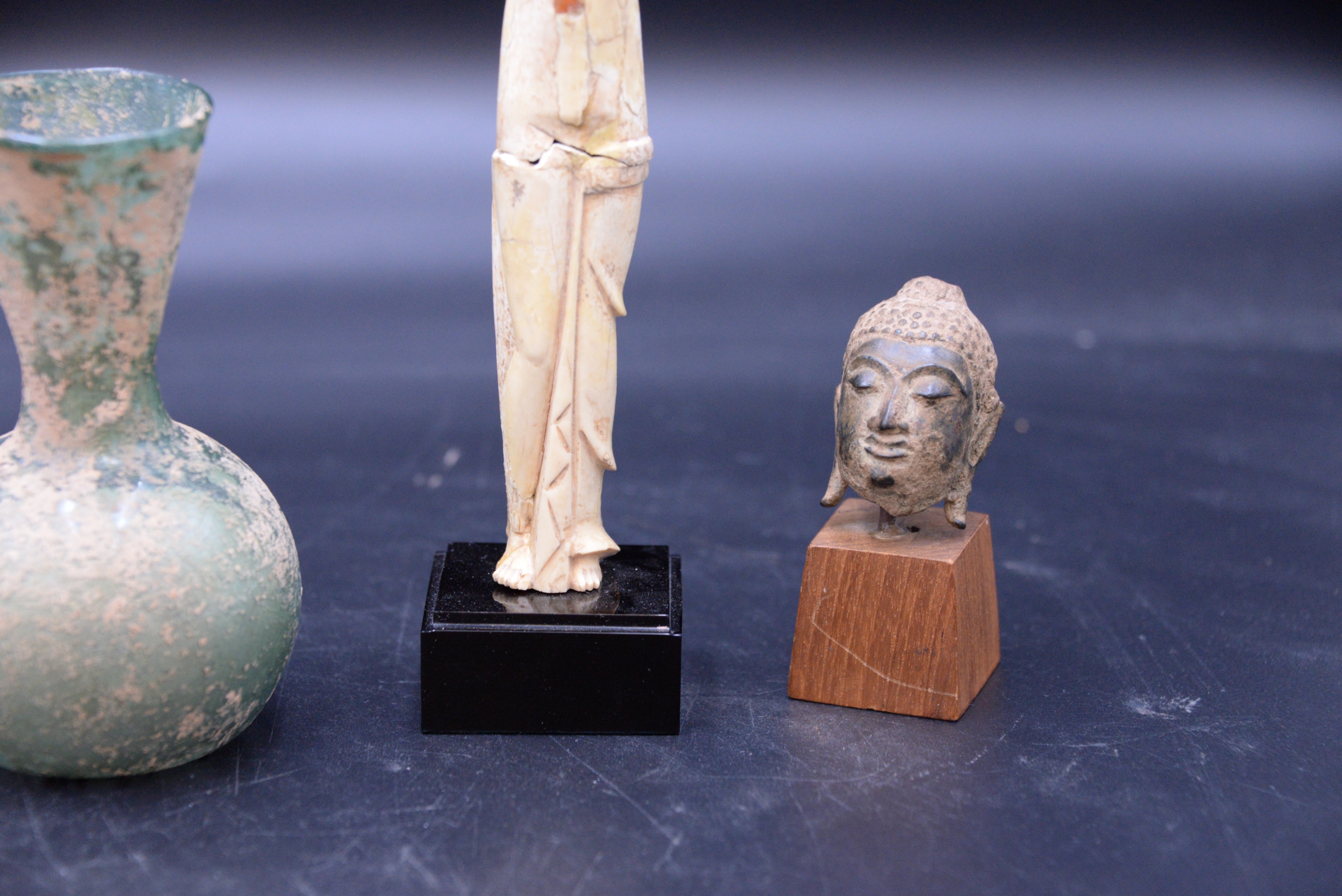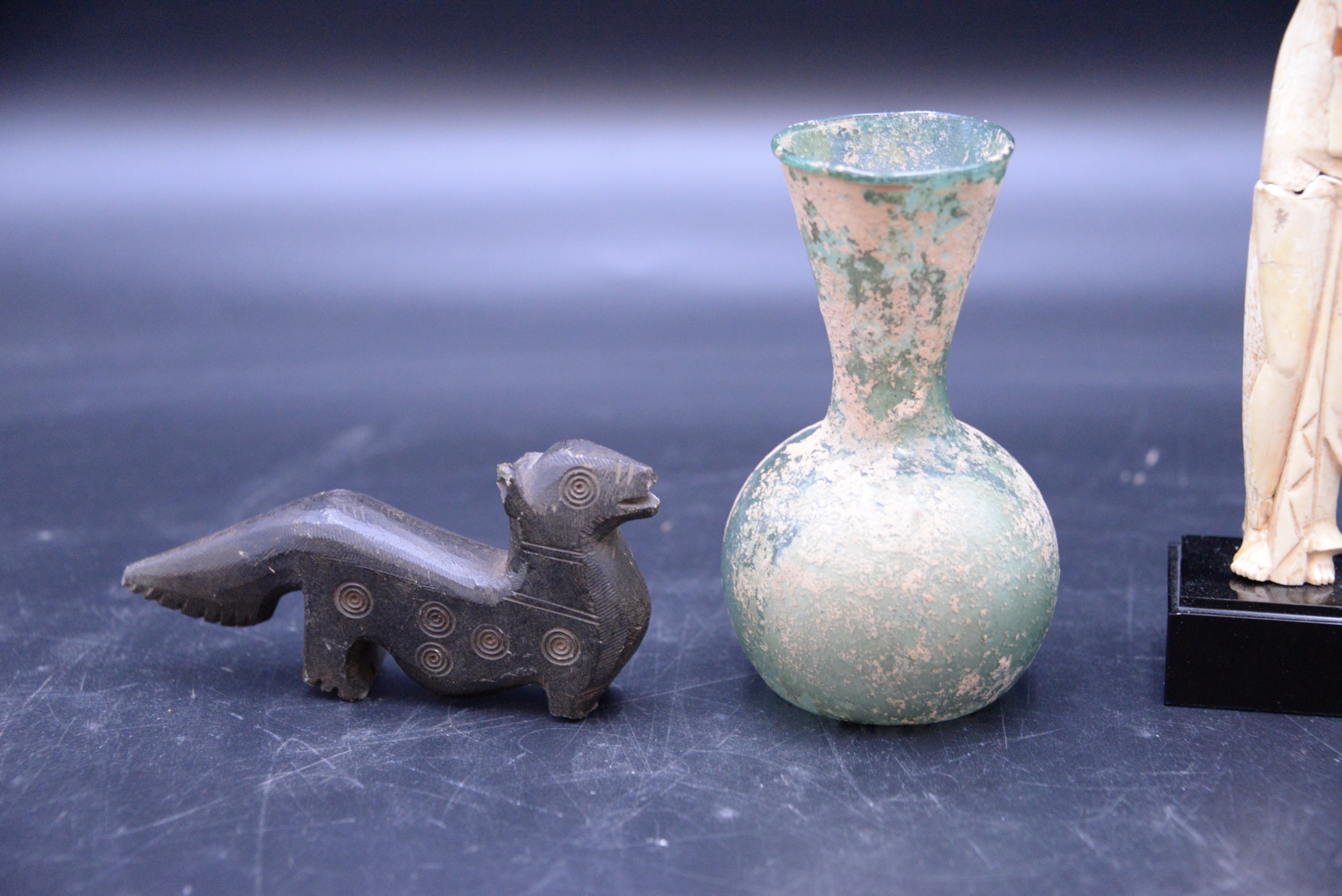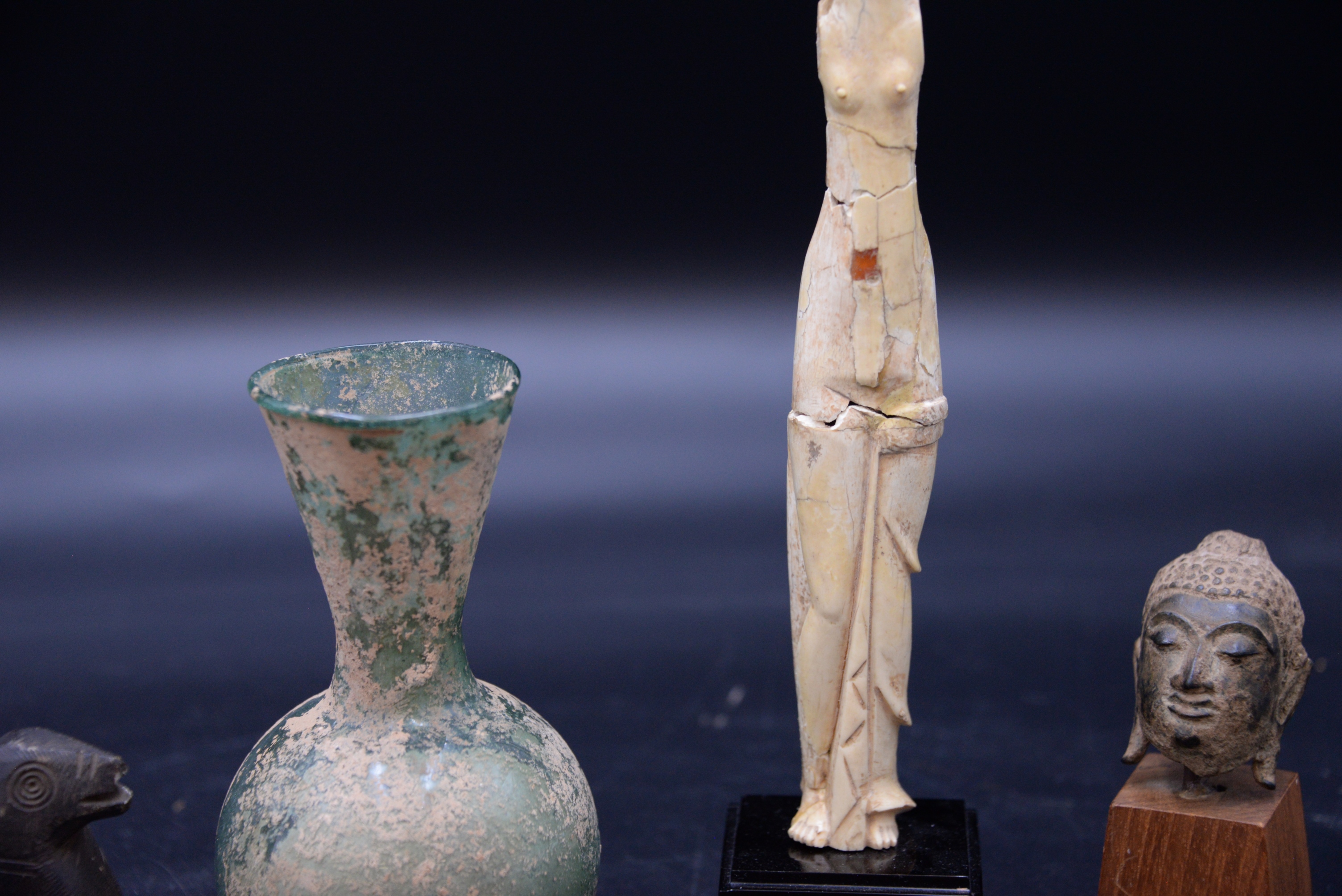 Four Piece Ancient Group, to include a bronze Oriental archaic head; carved figure of a standing English woman (as is), having gold Sotheby’s #41 tag on bottom, height 9 1/4 inches; an early carved stone animal figure; along with a glass bottle.