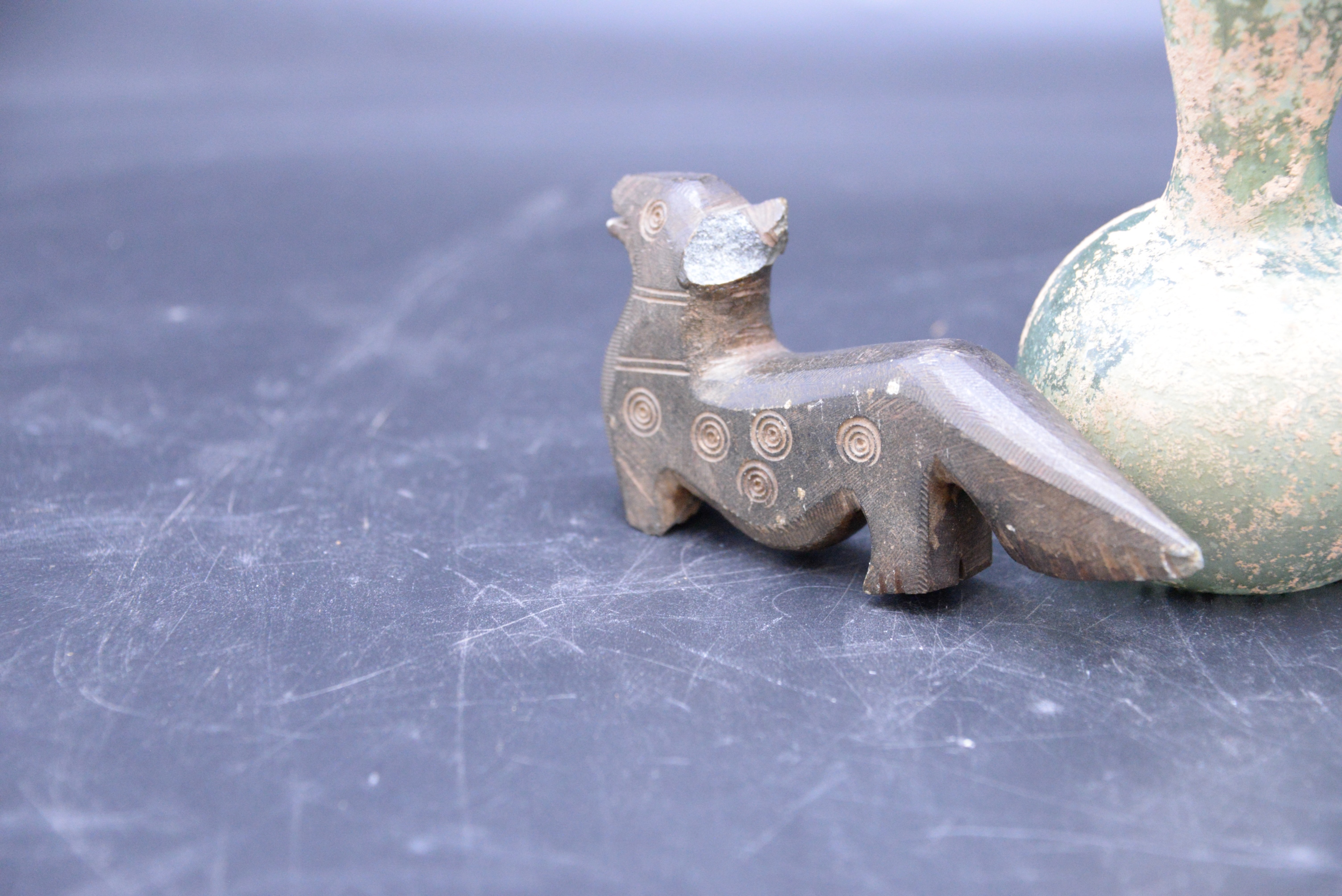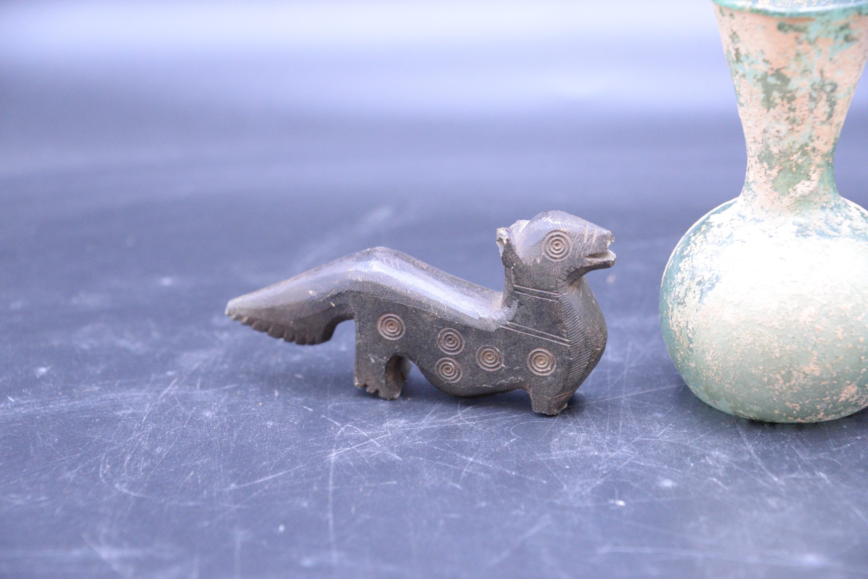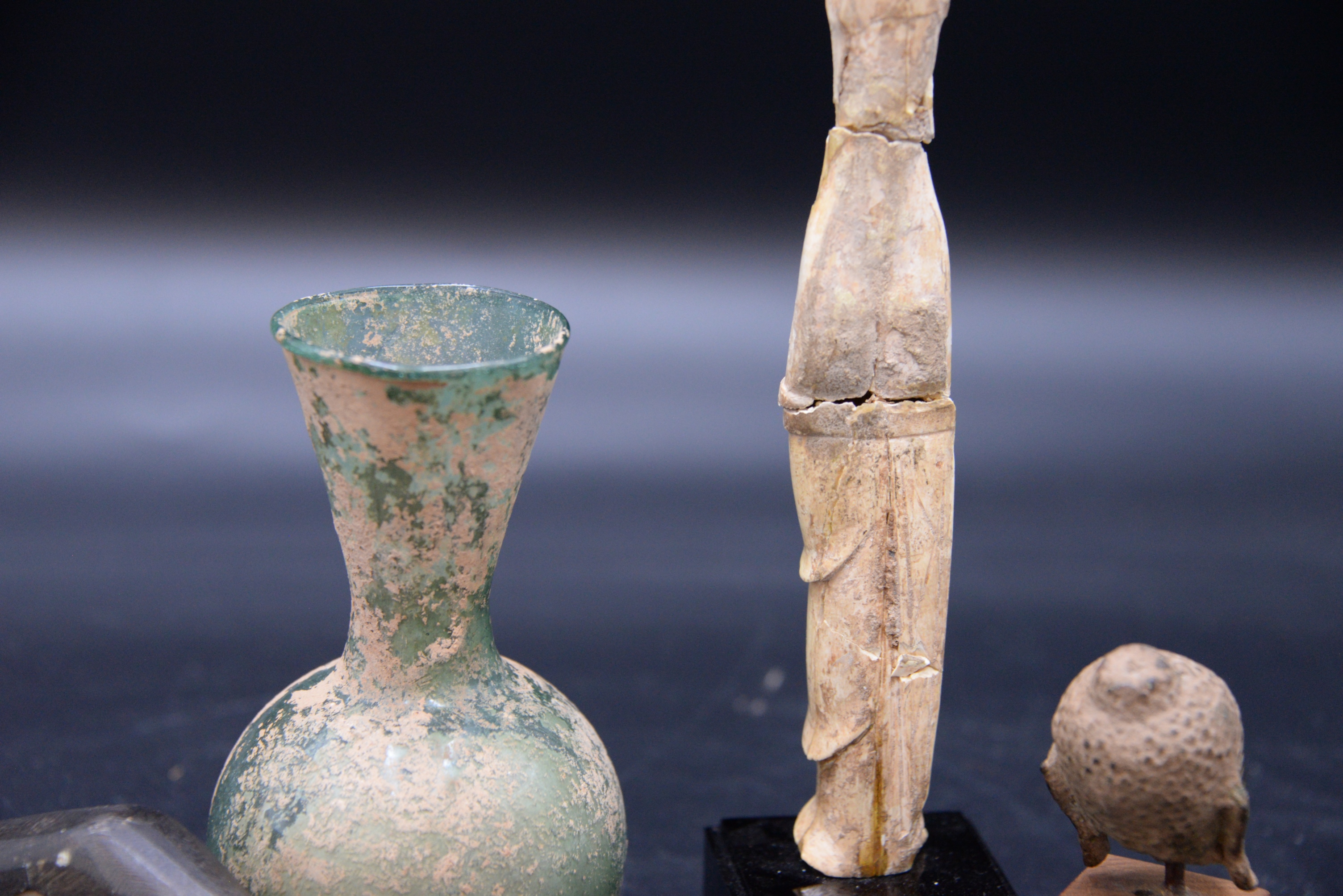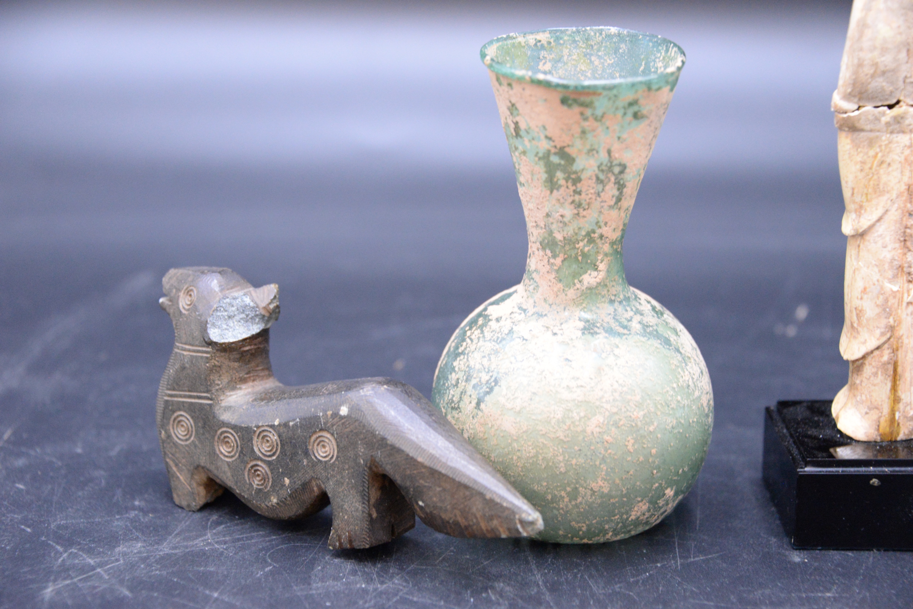 Four Piece Ancient Group, to include a bronze Oriental archaic head; carved figure of a standing English woman (as is), having gold Sotheby’s #41 tag on bottom, height 9 1/4 inches; an early carved stone animal figure; along with a glass bottle.