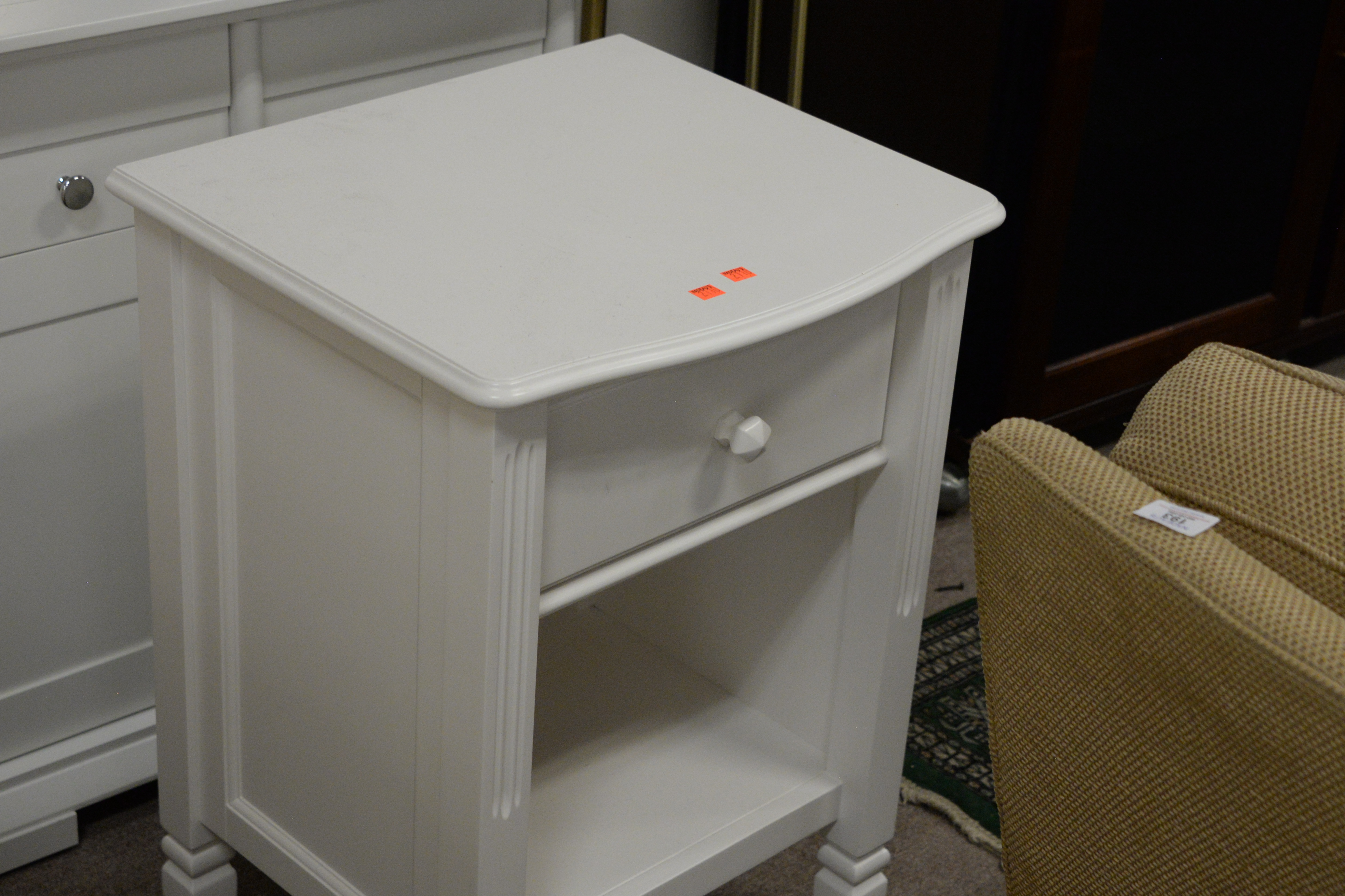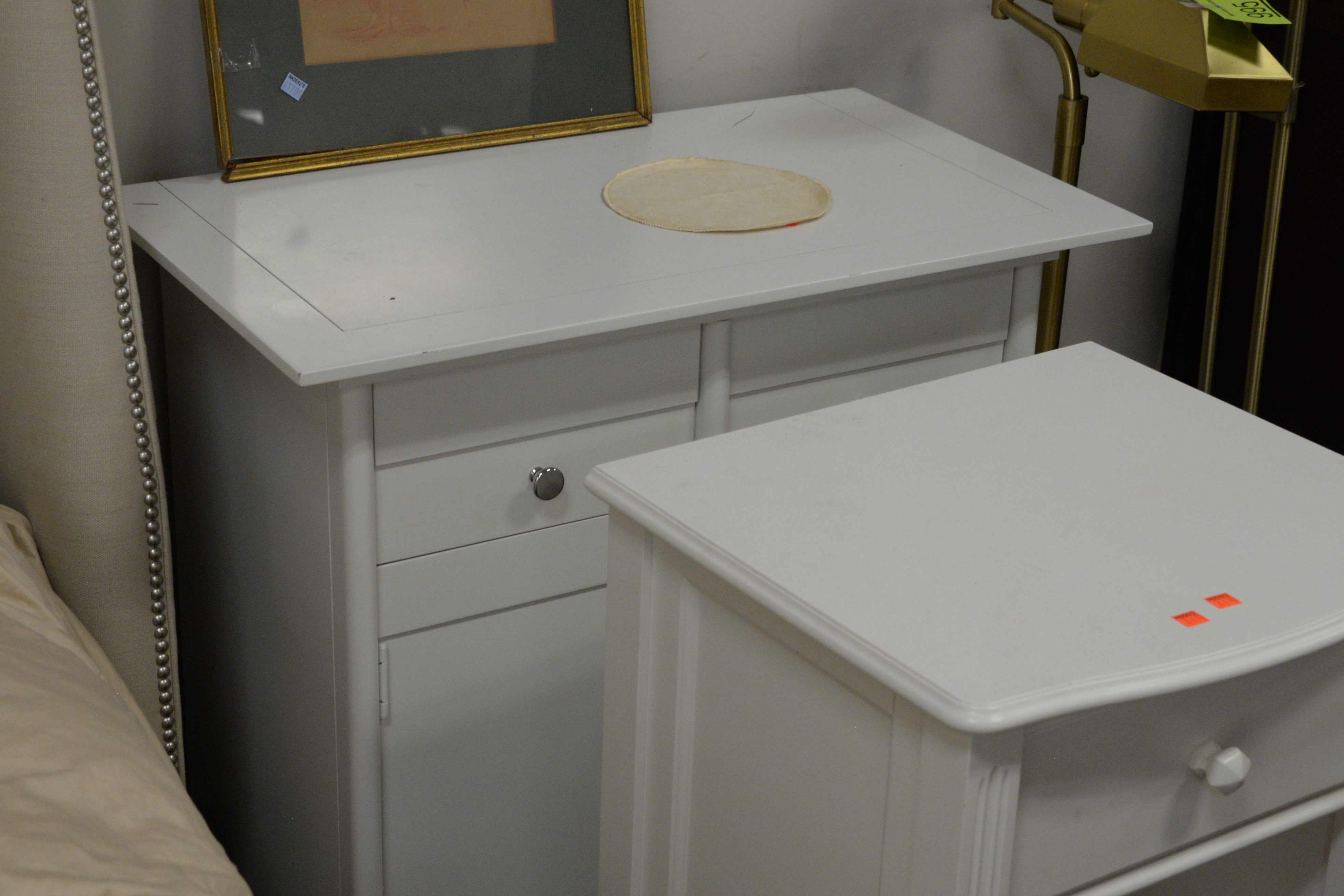 Four piece lot Contemporary Broyhill White Triple Chest, and three bedside tables and cabinets, height 40 inches, top 20″ x 64″