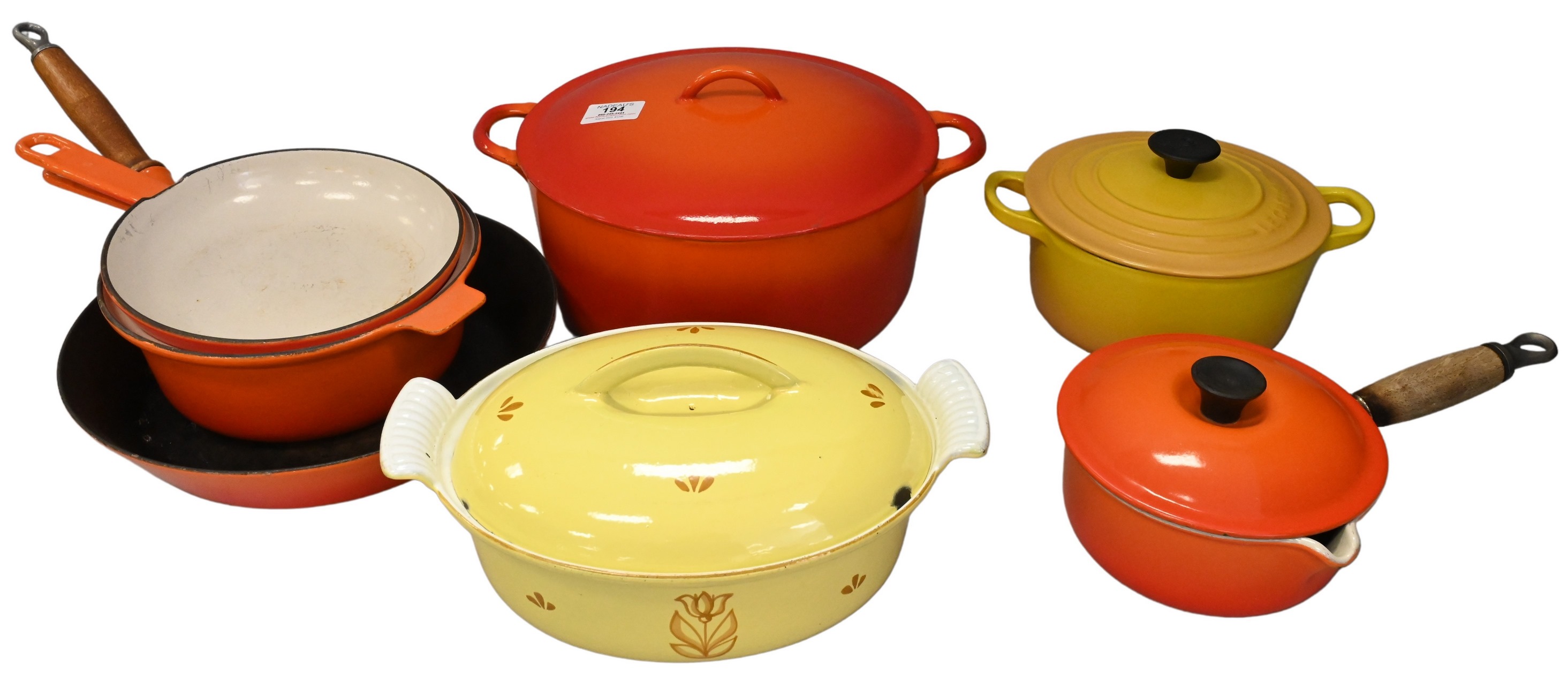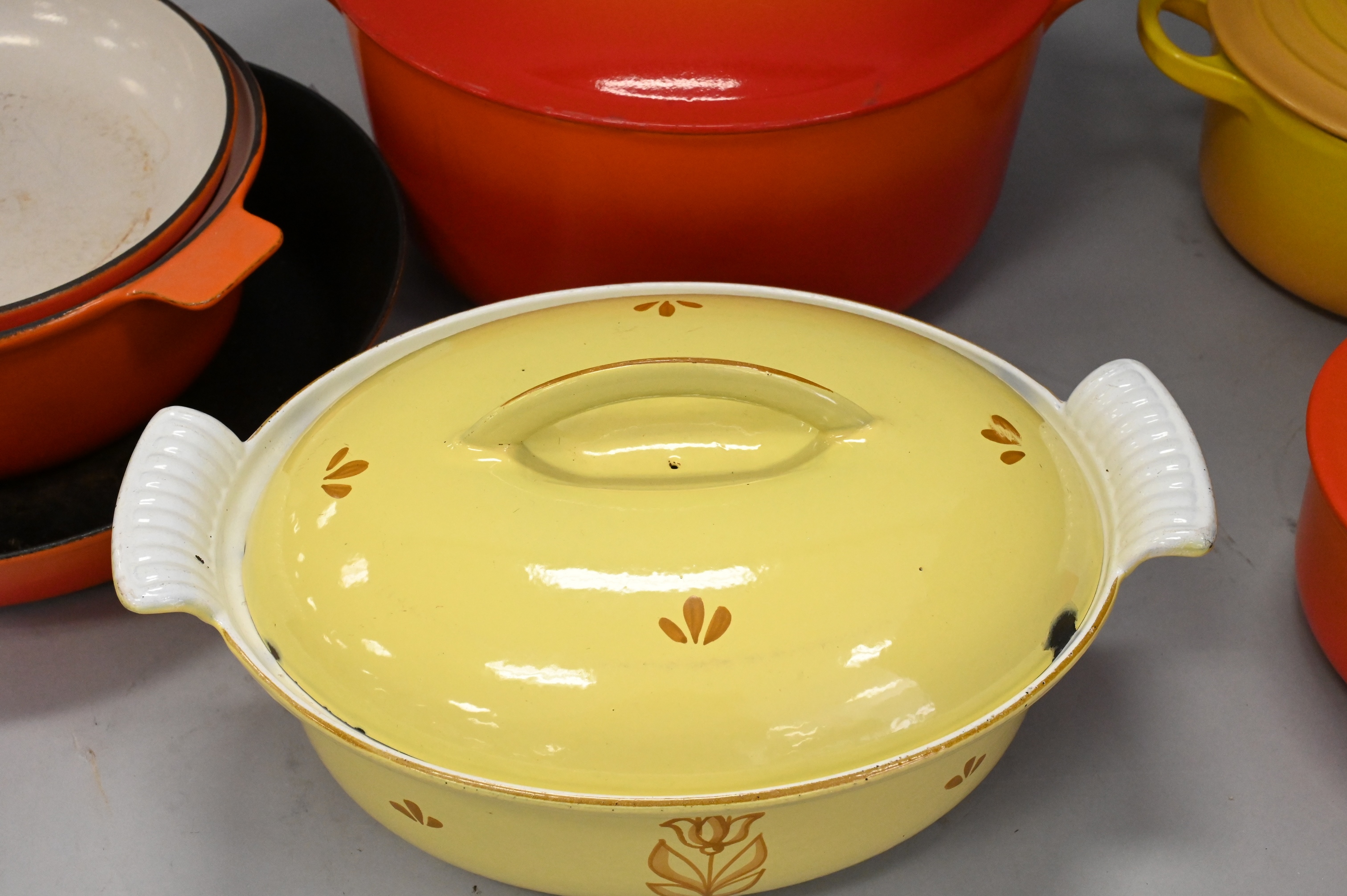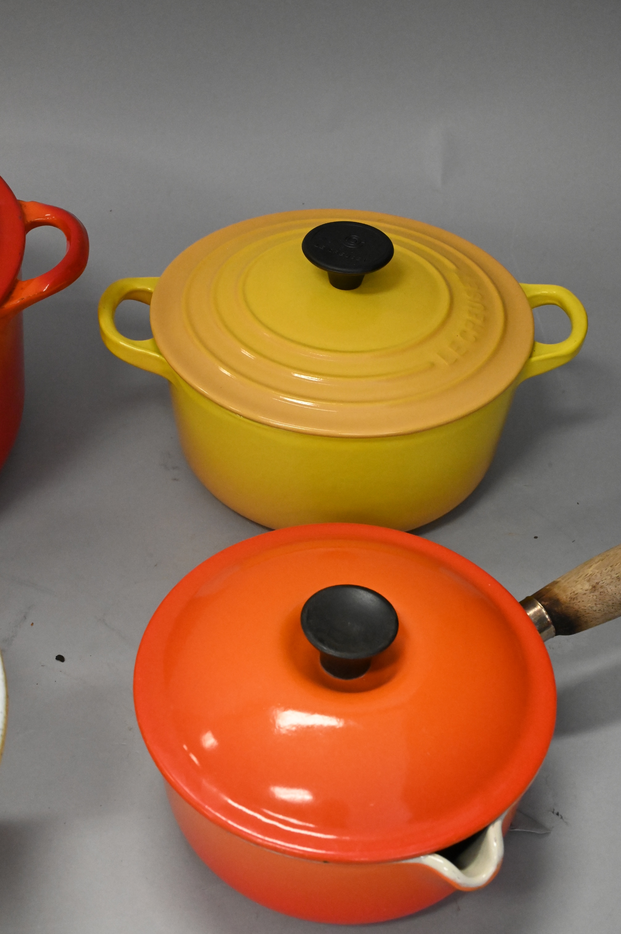Group of Enameled Cookware, to include Le Creuset covered pots, pans, etc.. largest pot height 5 inches, diameter 11 inches.