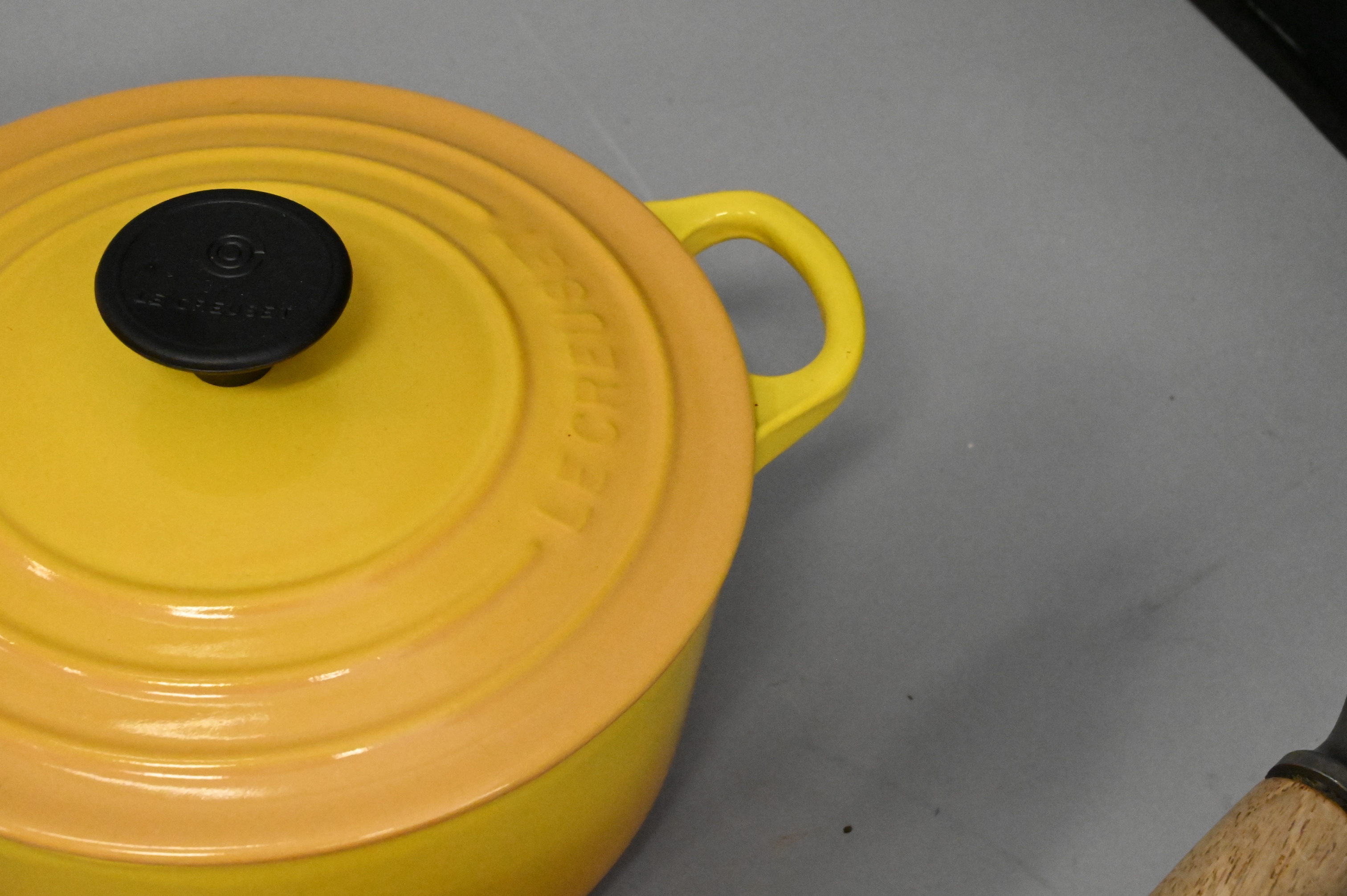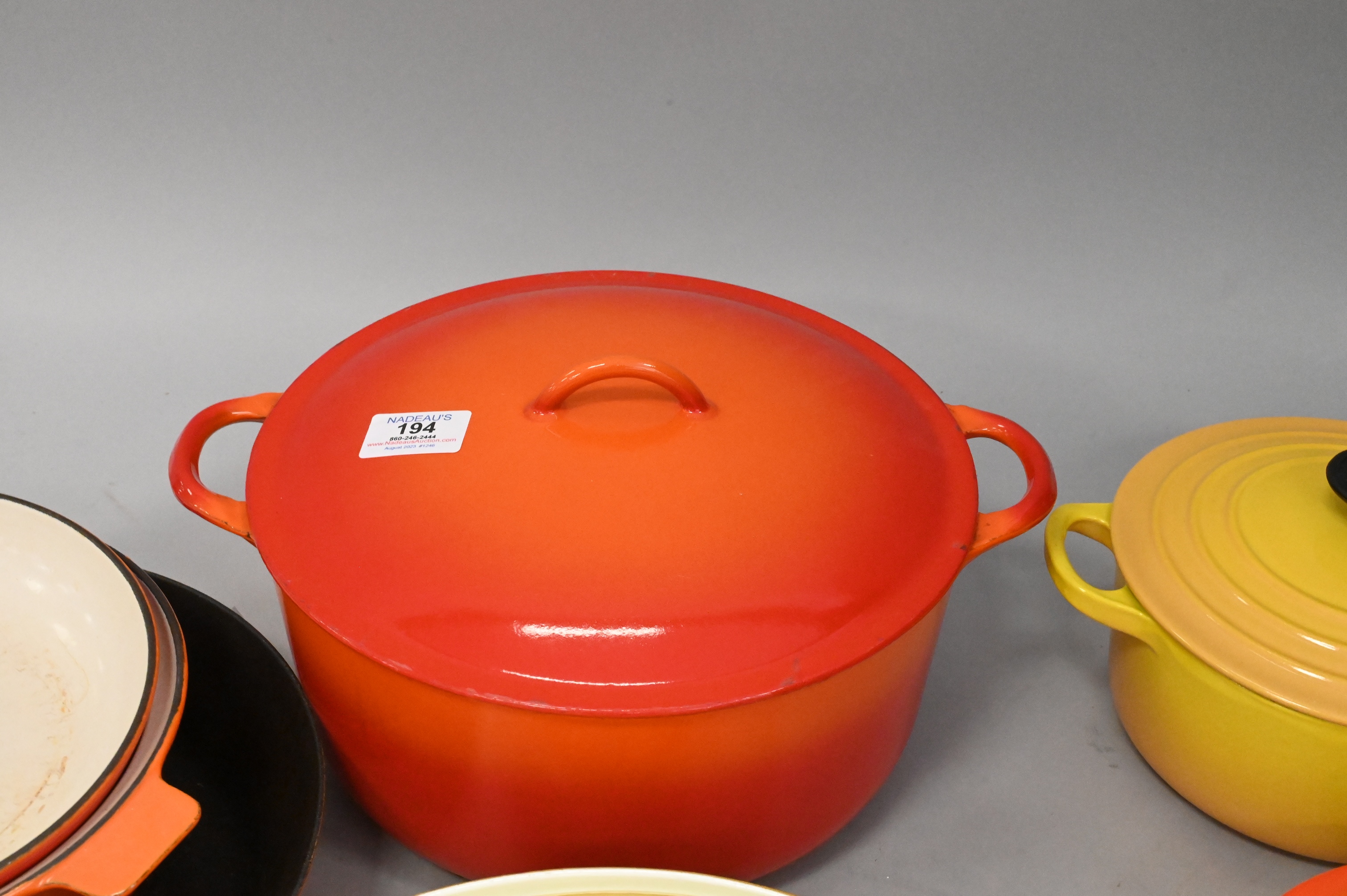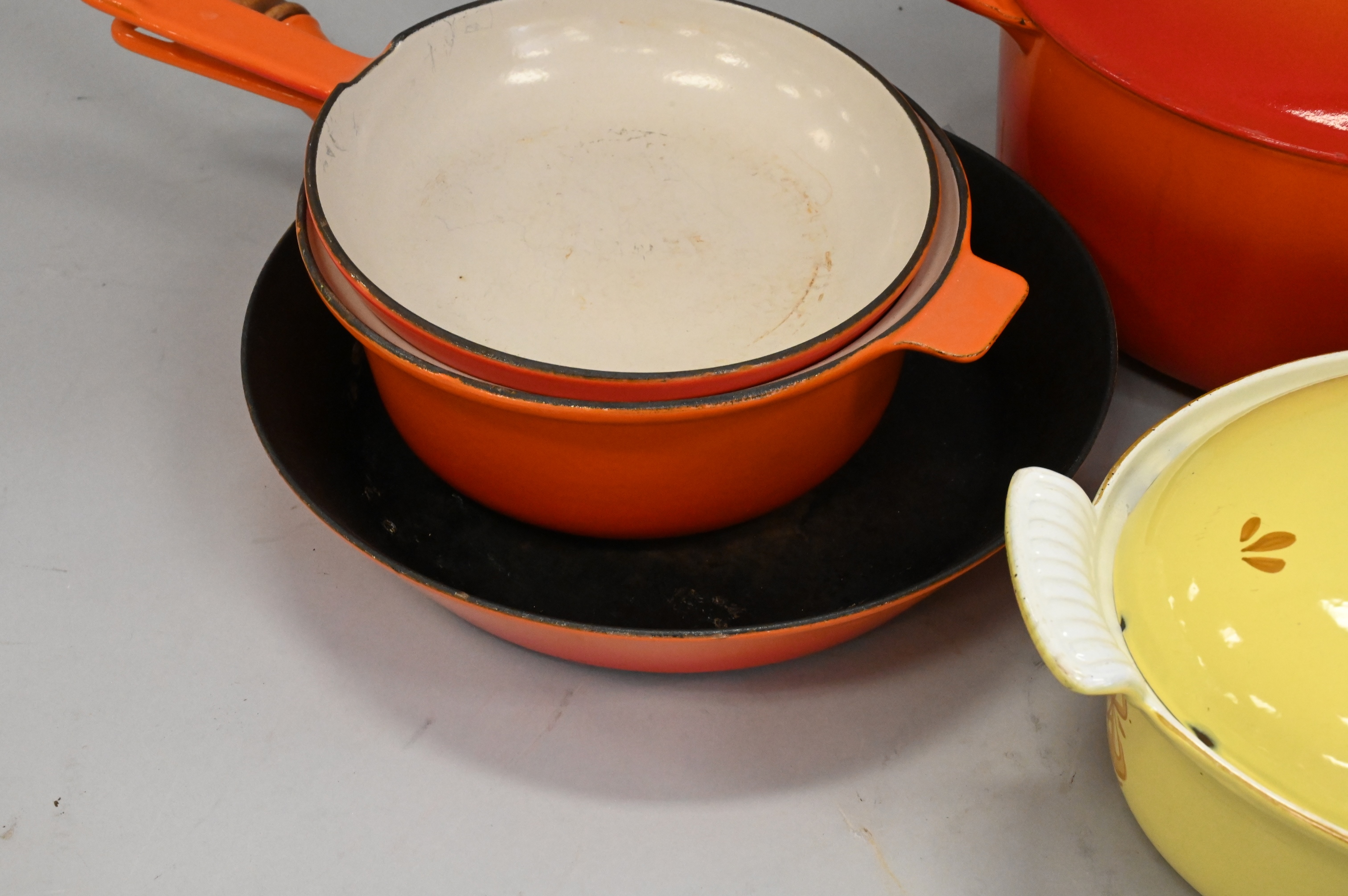 Group of Enameled Cookware, to include Le Creuset covered pots, pans, etc.. largest pot height 5 inches, diameter 11 inches.