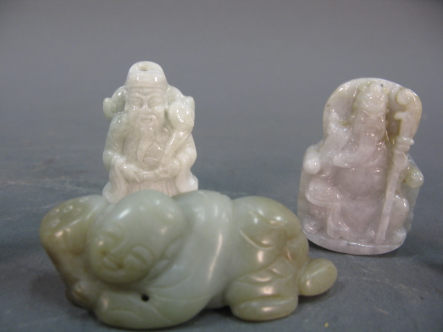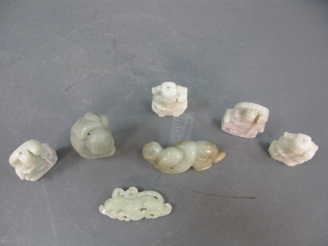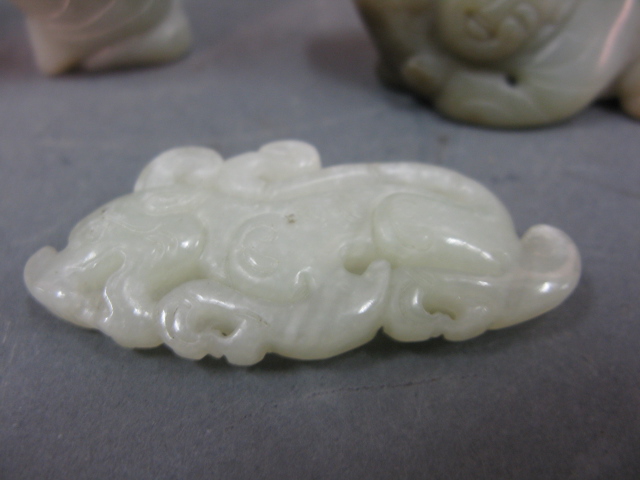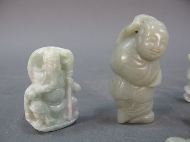 Group of Jade to include two pairs of Oriental carved jade figures, two Oriental carved jade figures and Oriental carved white jade dragon.