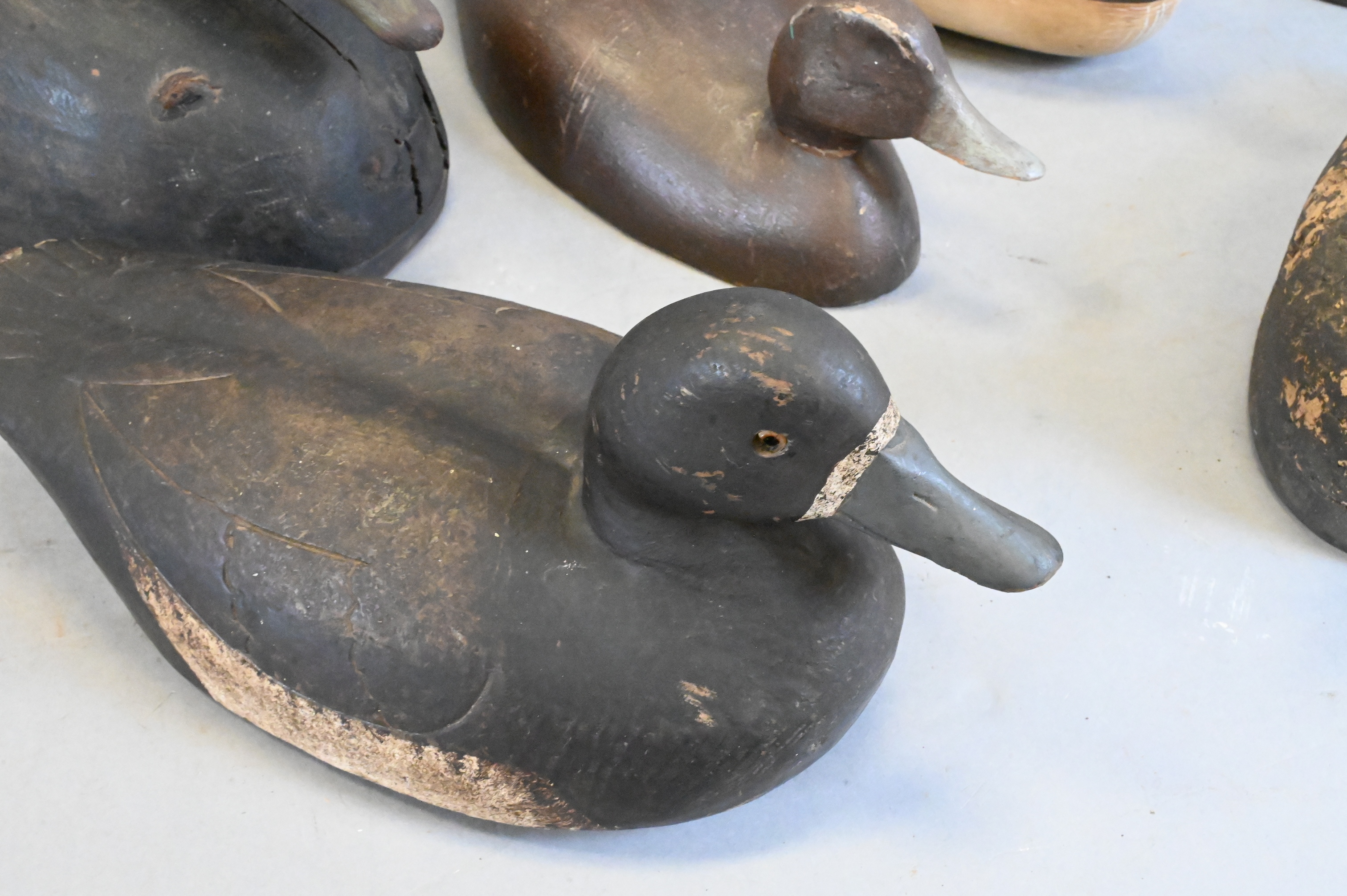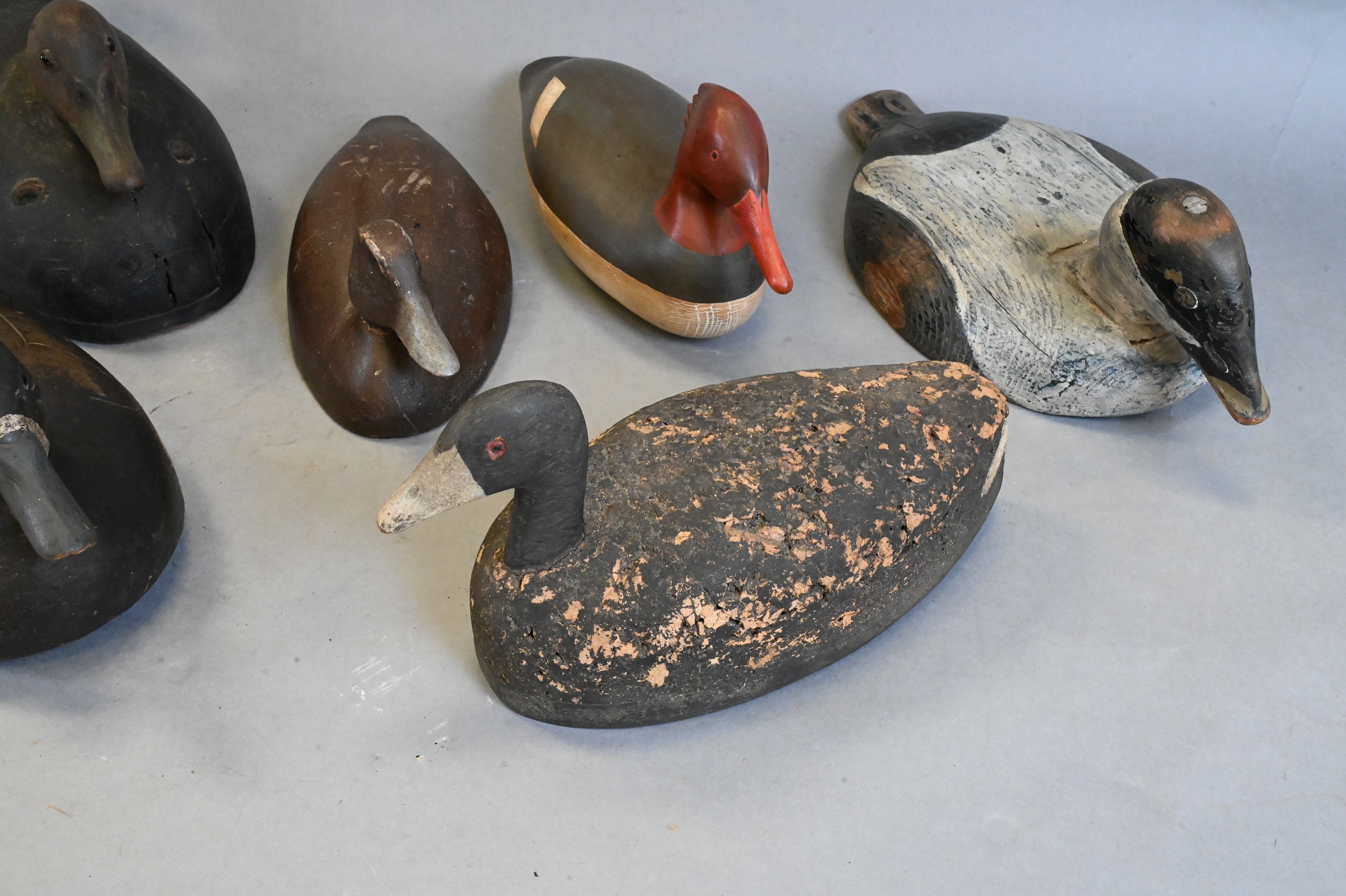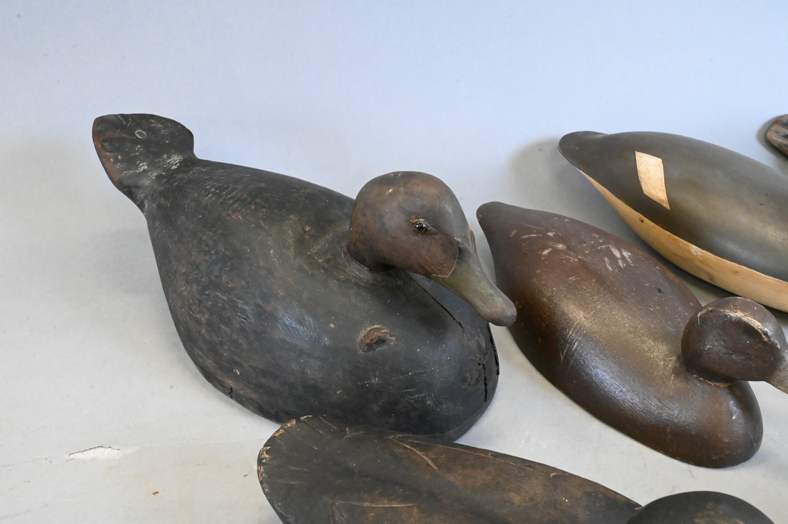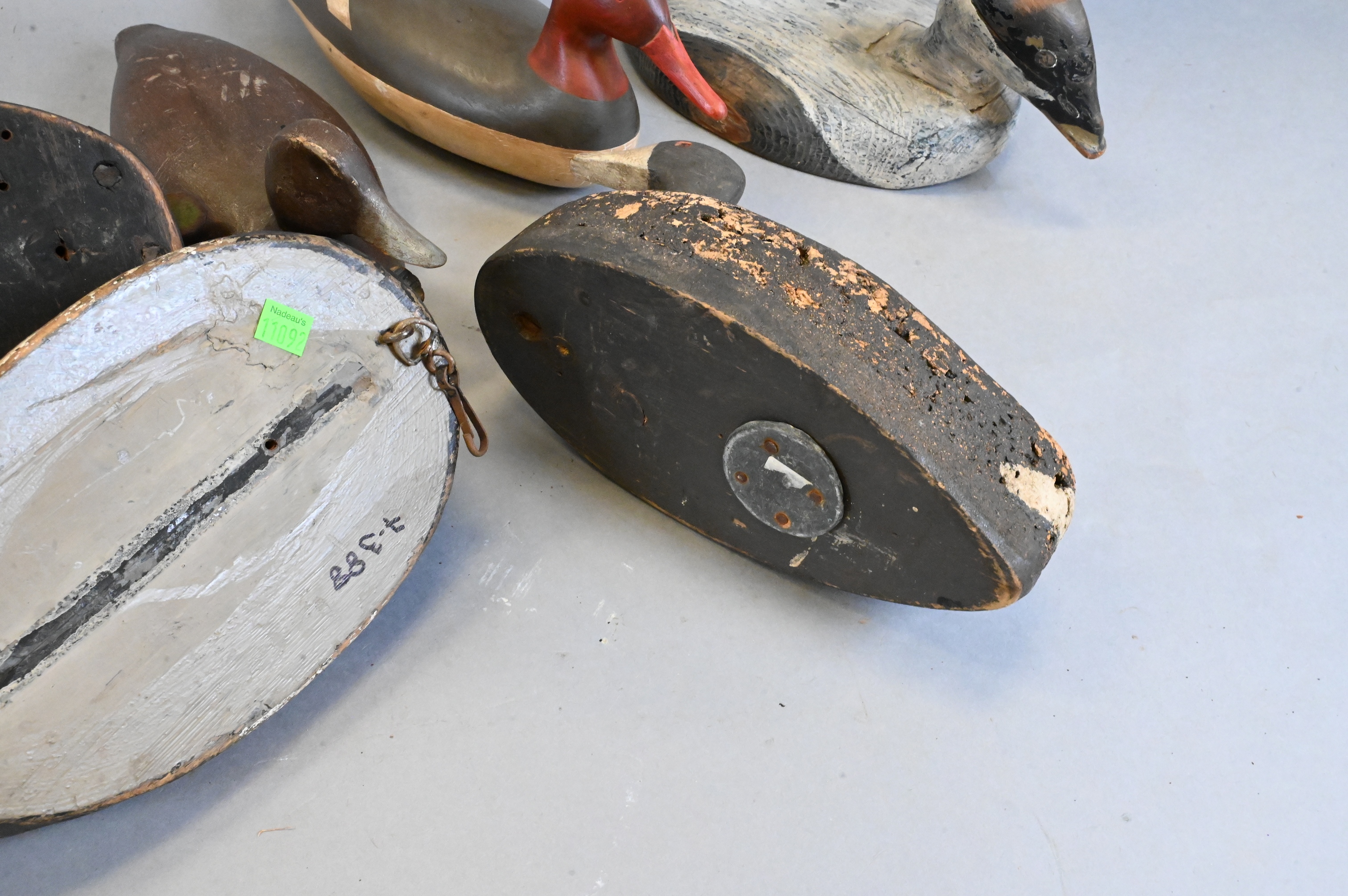 to include a black duck, New York having some original paint, age cracks, shrinkage, highly stylized tial carvings, a Seiler Julius Mittelstaedt, repainted broad bill hen, a Broad Bill hen having incised wing carving, possibly original paint, cork construction with 3/4 inch pine bottom board, weight, and a Swimming Eider Drake, Canada, inleted head, some original paint mostly working repaint, original line tie etc…