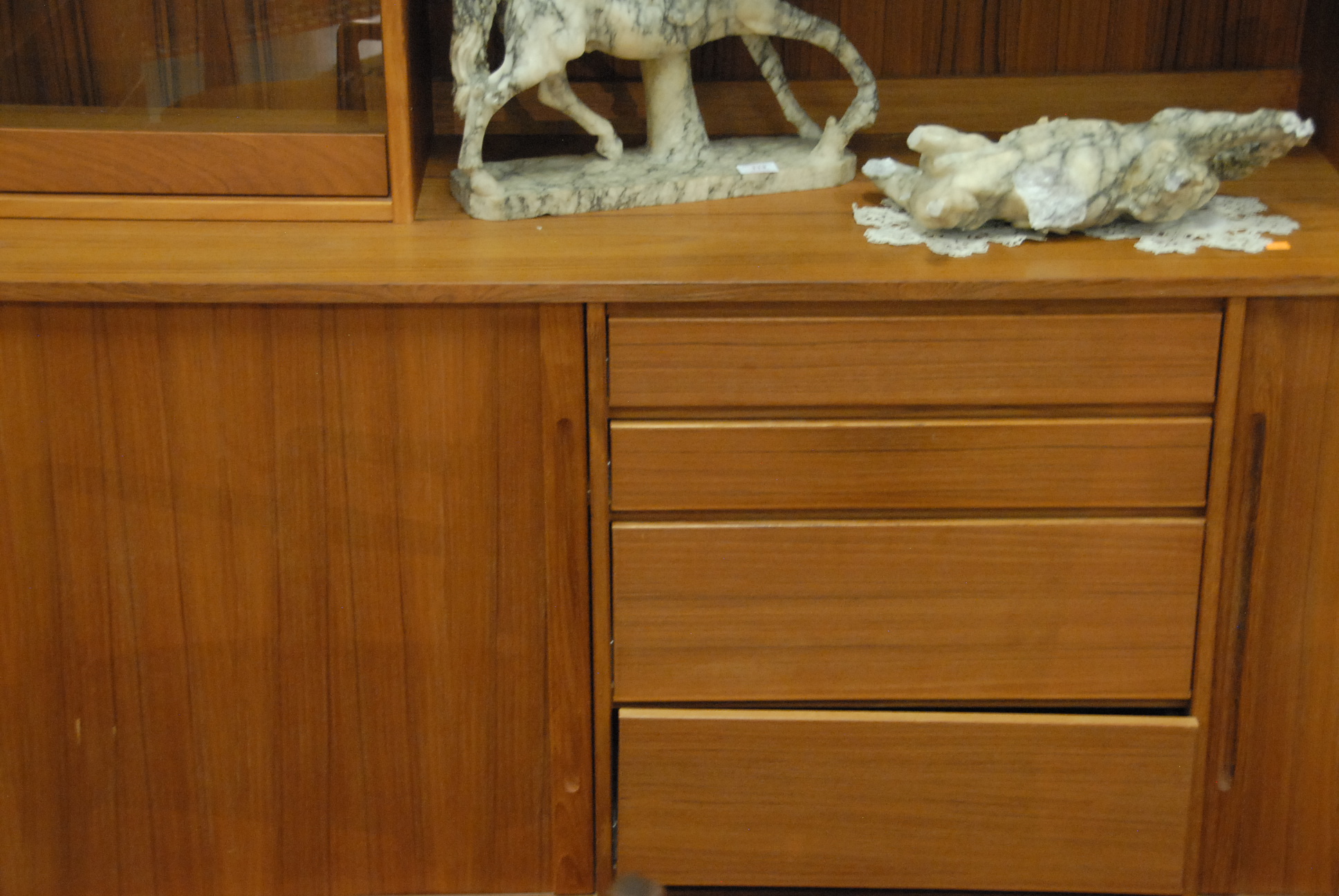 Lot 194: Large Danish Modern hutch, top having glass doors on either side with bookcase in center, ht. 75in. wd. 76in. dp. 20in.