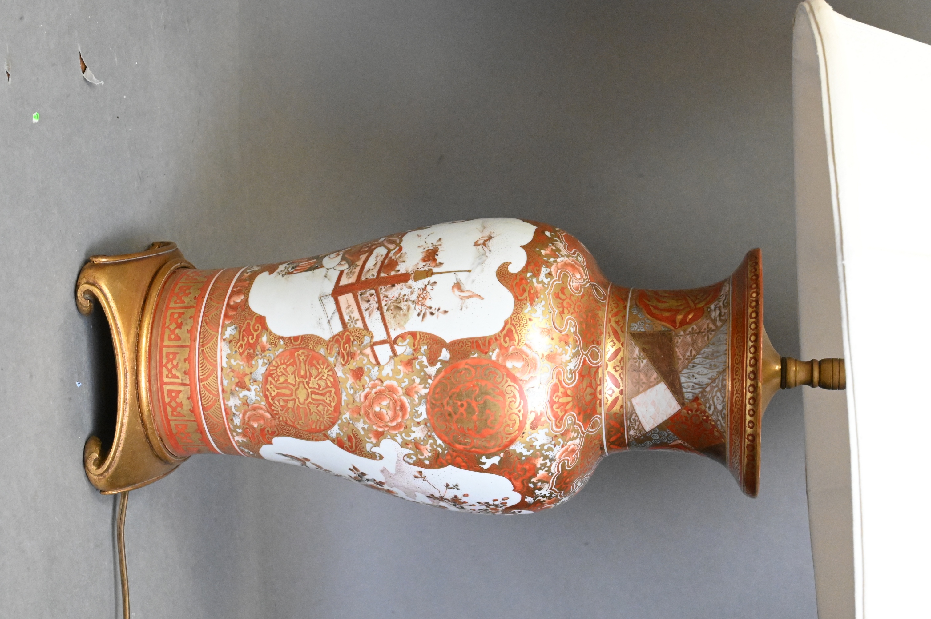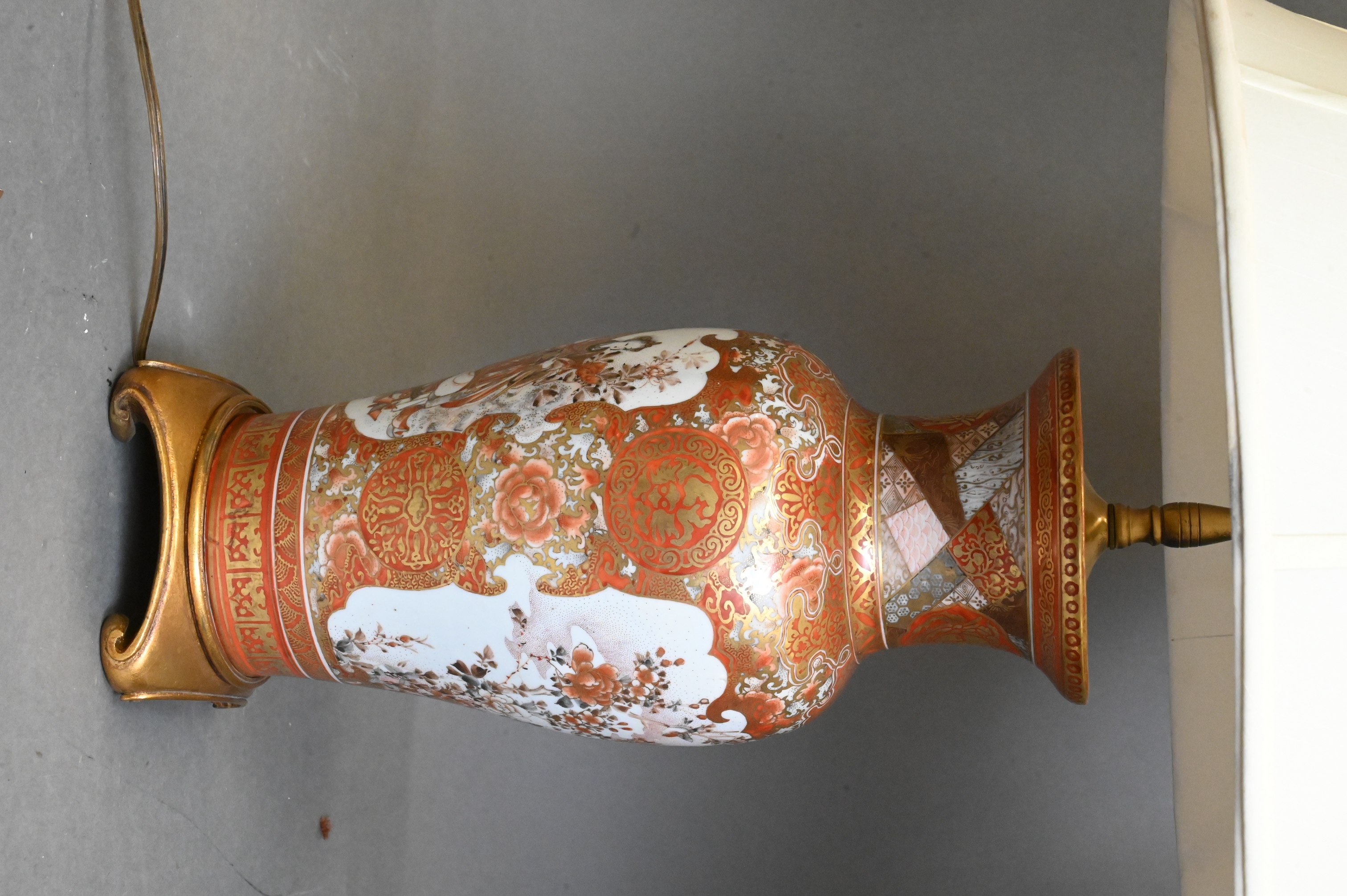 each of baluster form, decorated in iron red and gilt having figural landscape reserves depicting birds and garden scenes, surrounded by dense gilt foliate and geometric borders, mounted as lamps