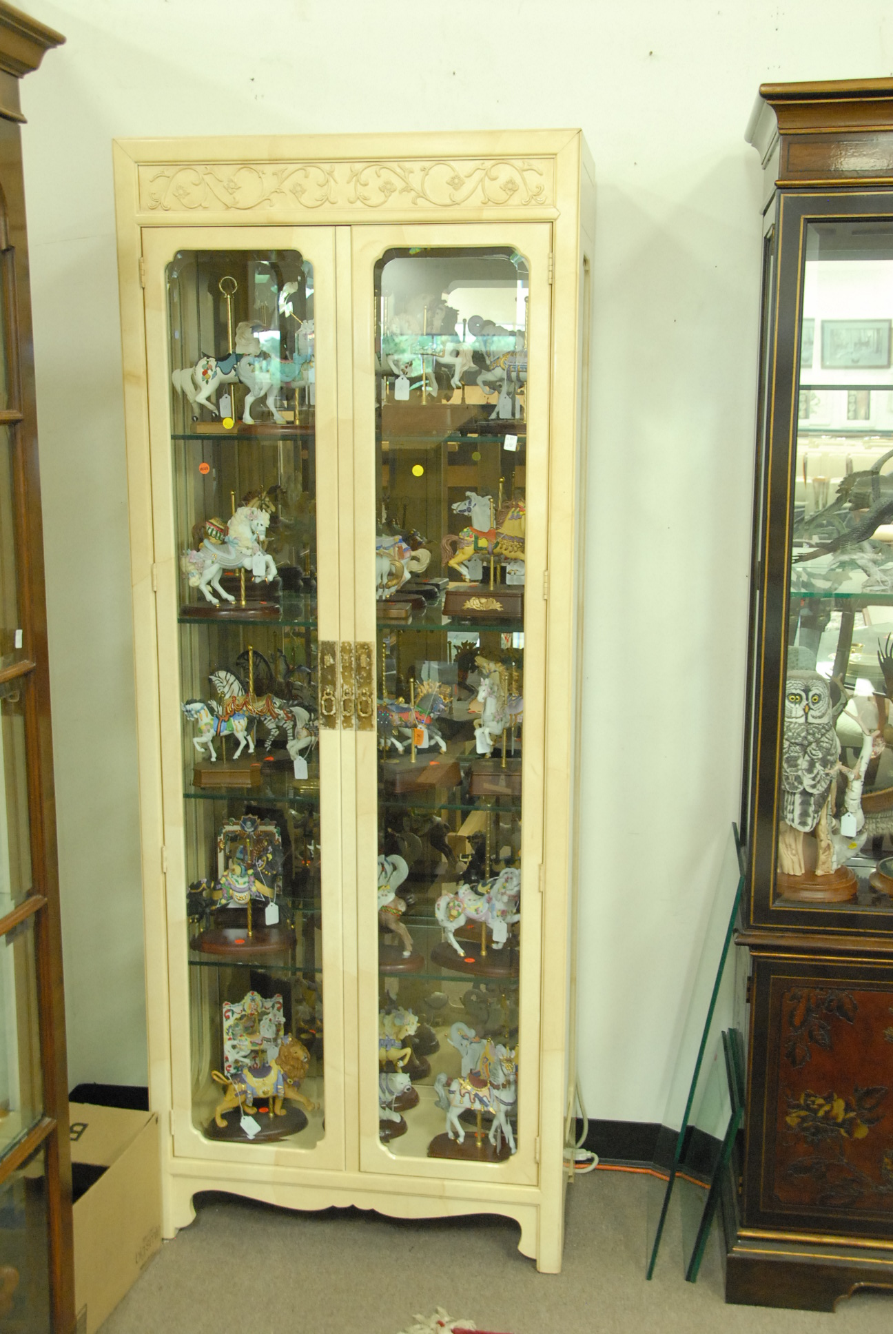 Pair of white curio cabinets with glass shelves and beveled glass doors.