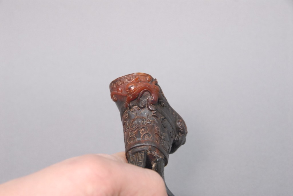 Small footed horn cup with carved three foo dogs on the sides, ht. 3 1/2.