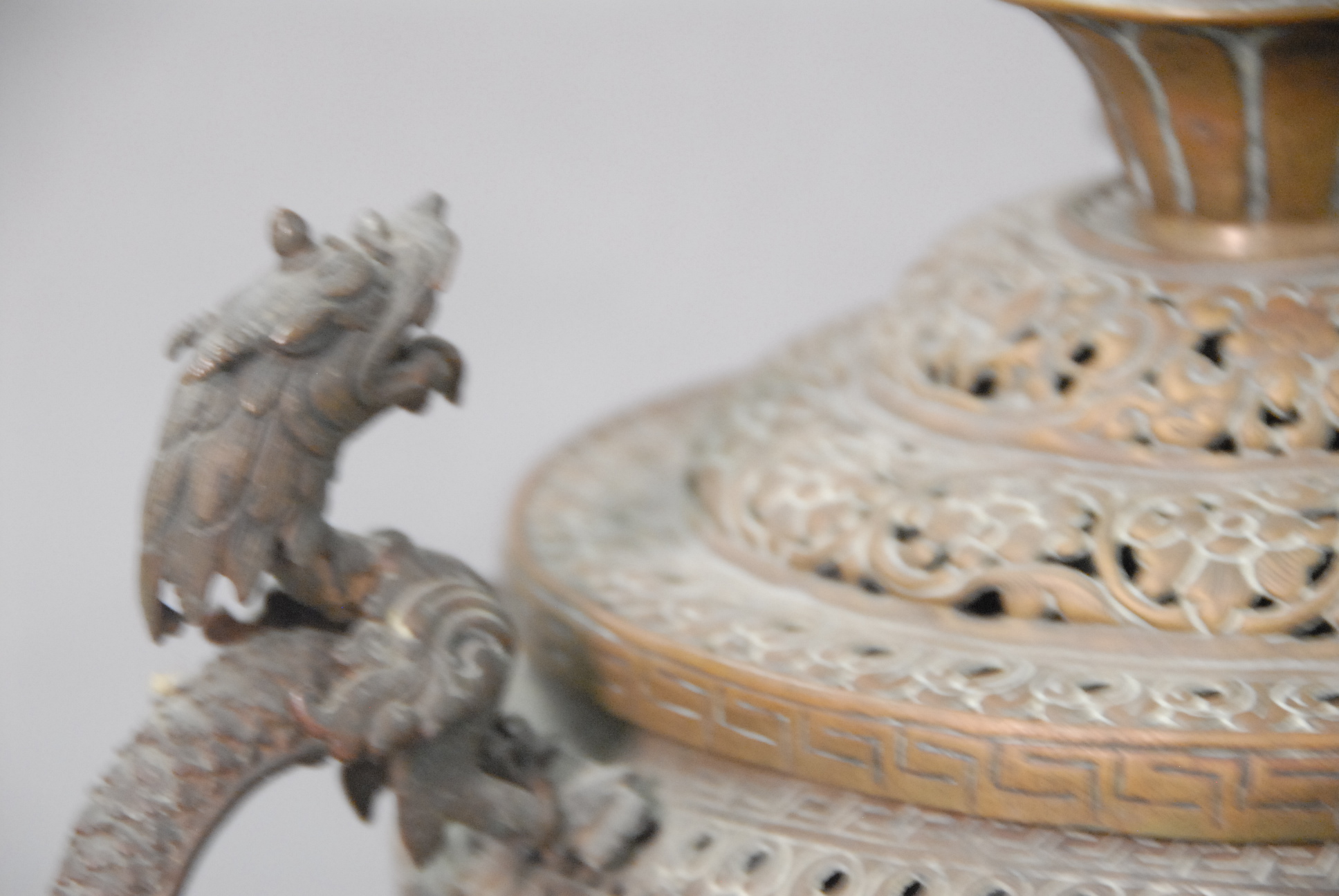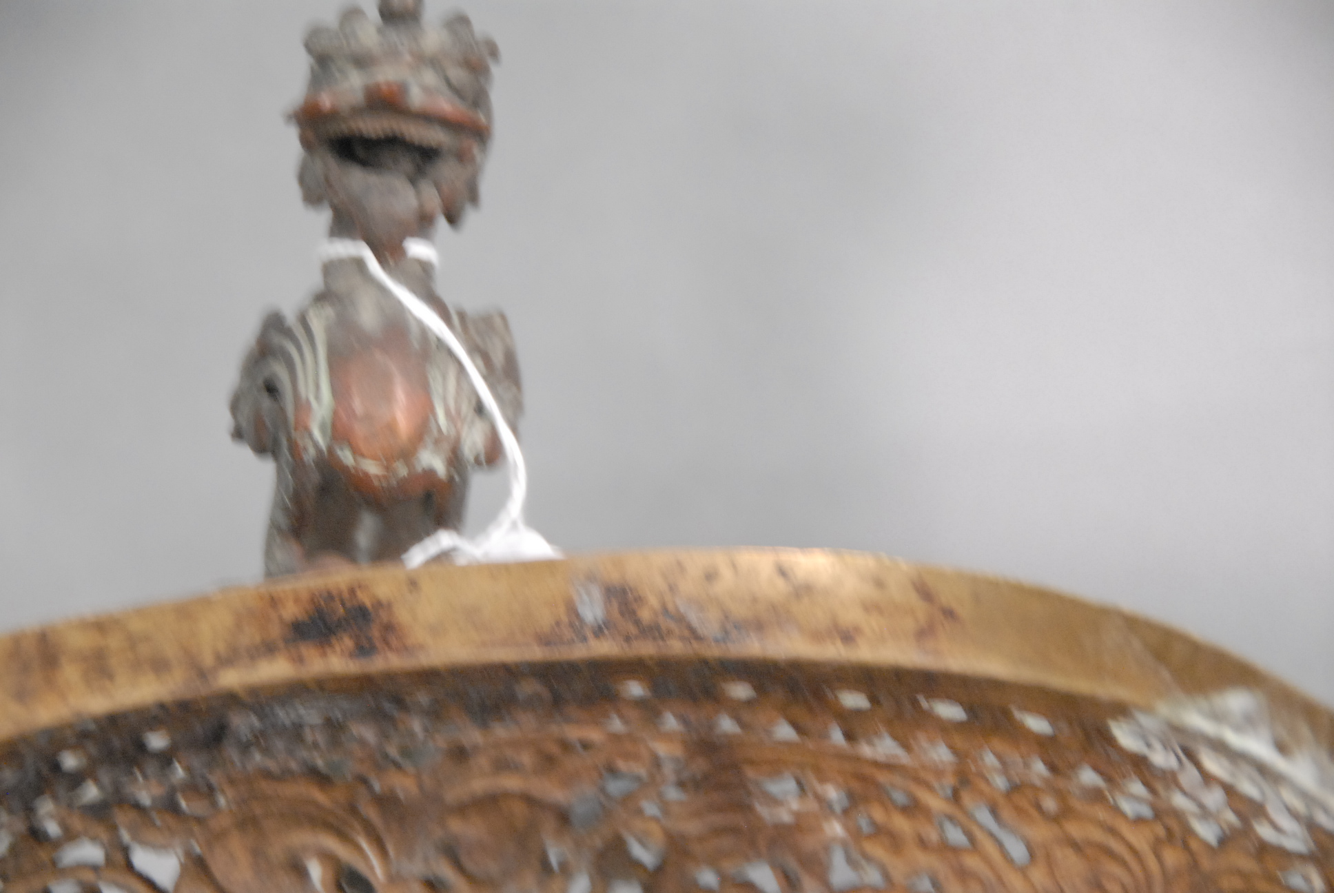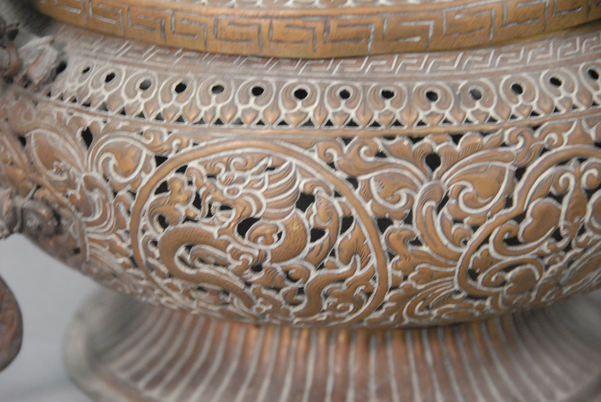 Southeast Asian reticulated copper hanging censer with dragon handles.