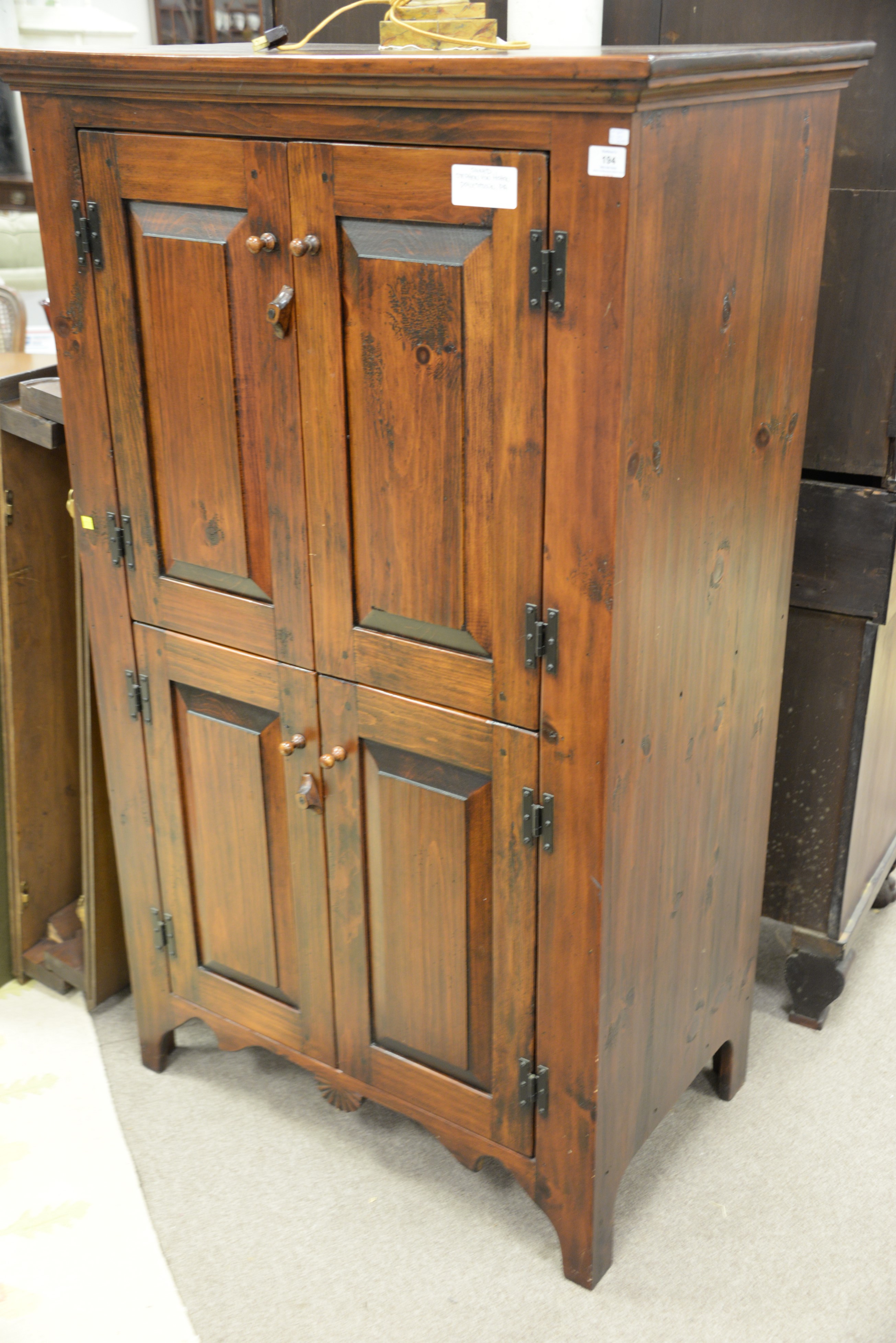 Lot 194: Stephen Von Hohen set of three pine tables along with a linen press. coffee table: ht. 17 in. wd. 48 in. dp. 19 1/2 in., end table…