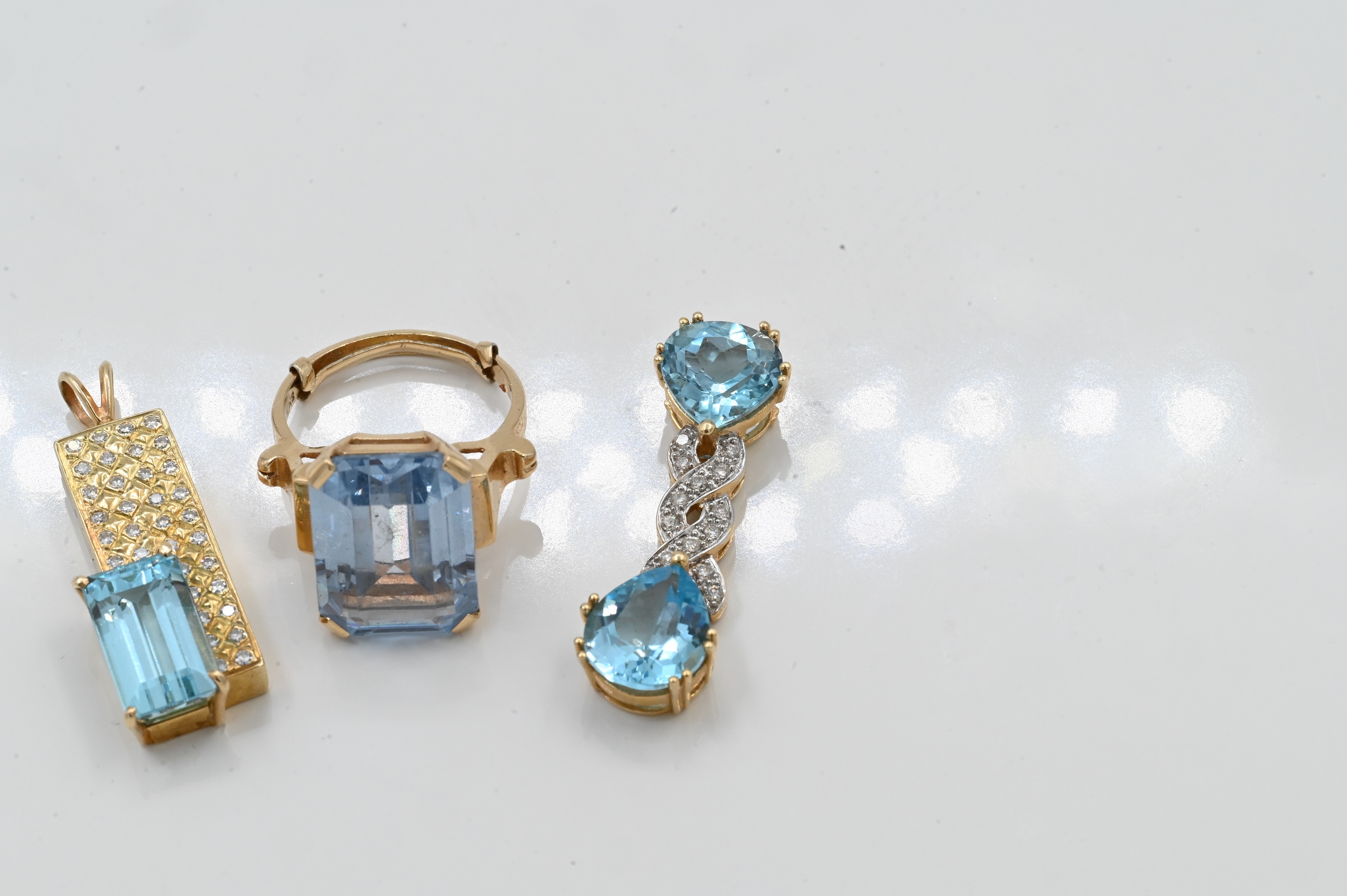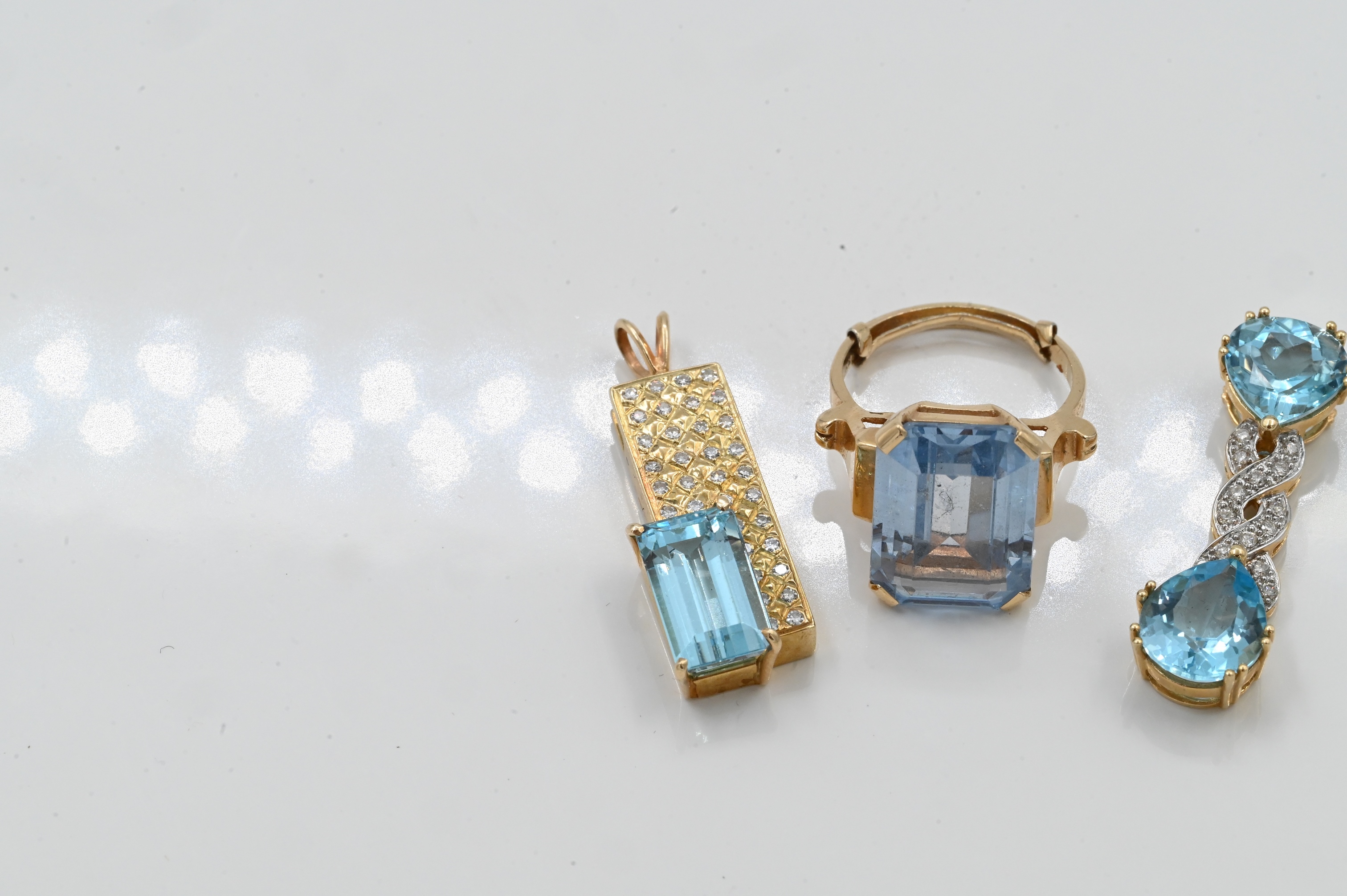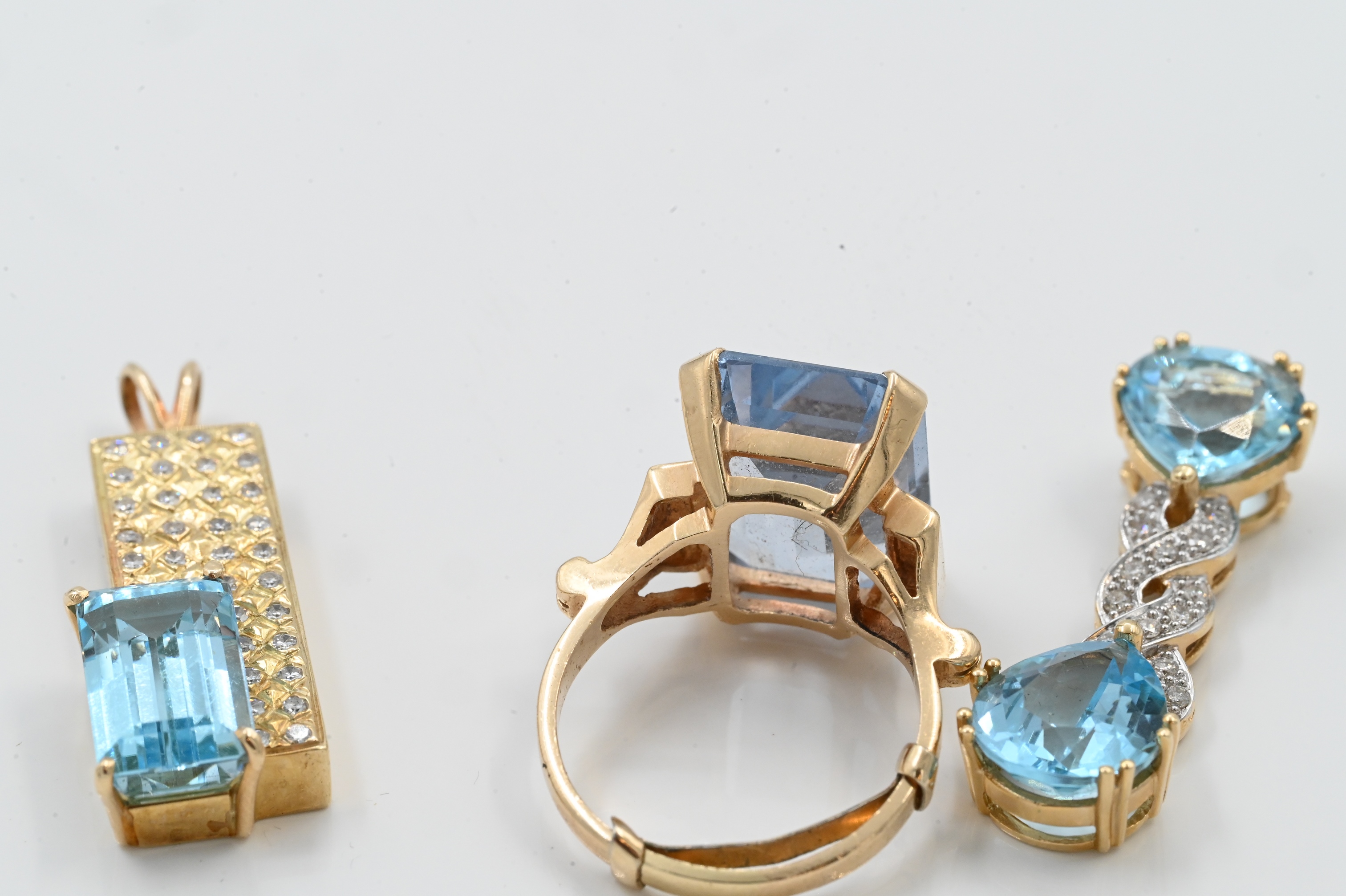 to include two pendants having blue stones and diamonds, and one ring with large emerald cut blue stone